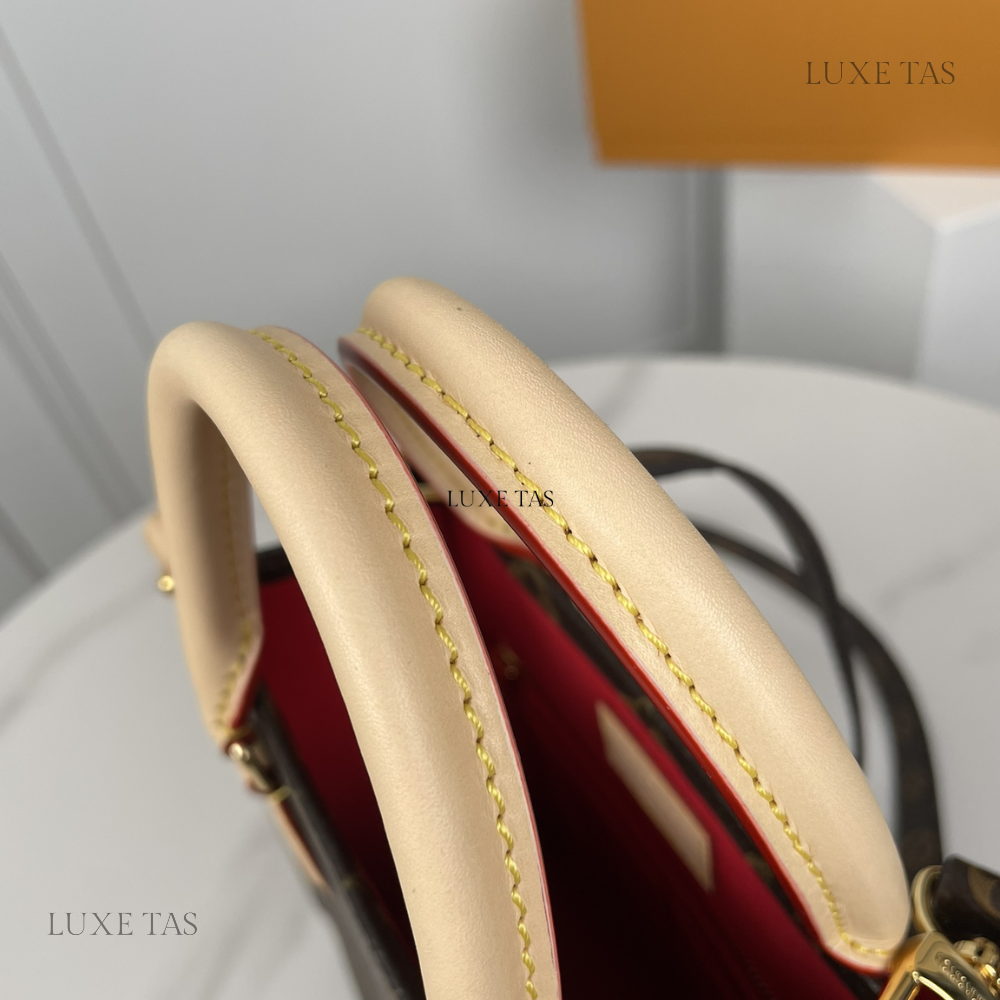 An updated take on the iconic Sac Plat, the stylishly compact Sac Plat BB handbag is crafted from Monogram canvas with natural leather accents. It includes a detachable Monogram strap and rolled leather top handles for versatility. Inside, you'll find a vibrant red textile lining, adorned with a L*V patch, and equipped with a zipped pocket and two flat pockets for organization.
