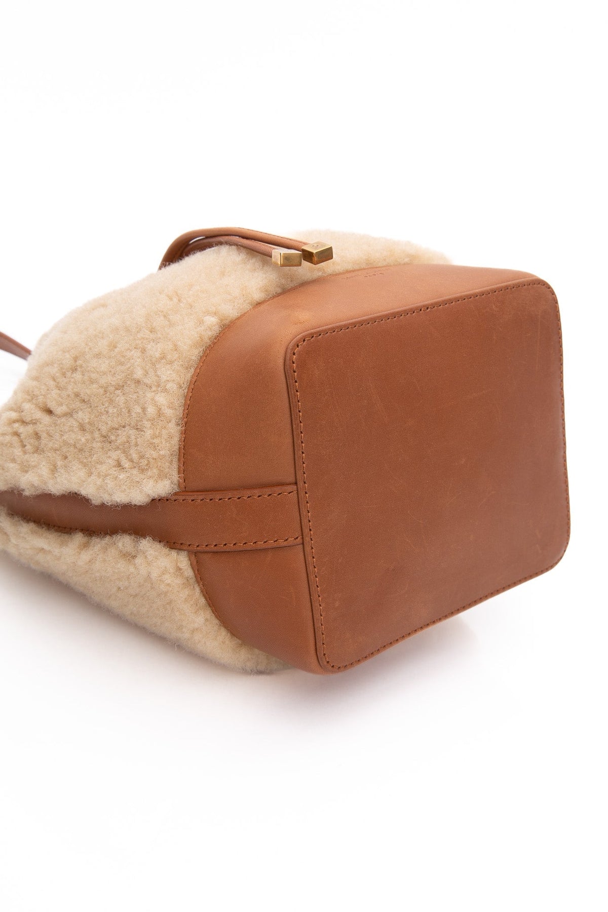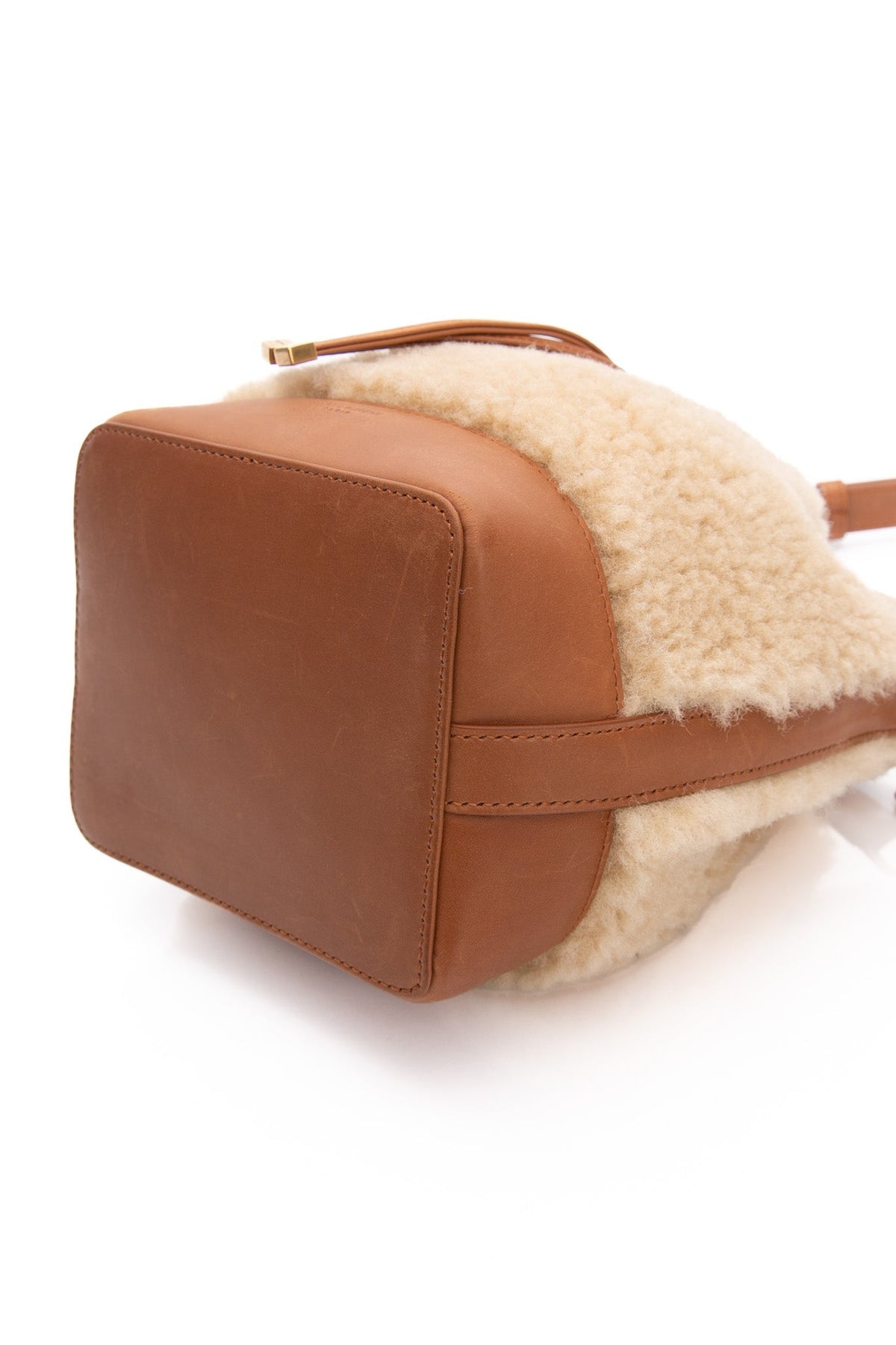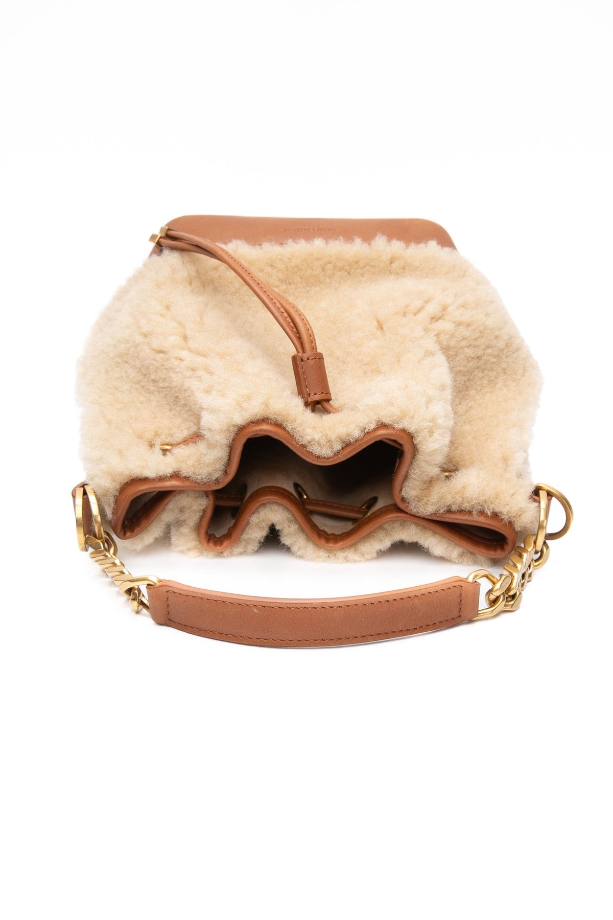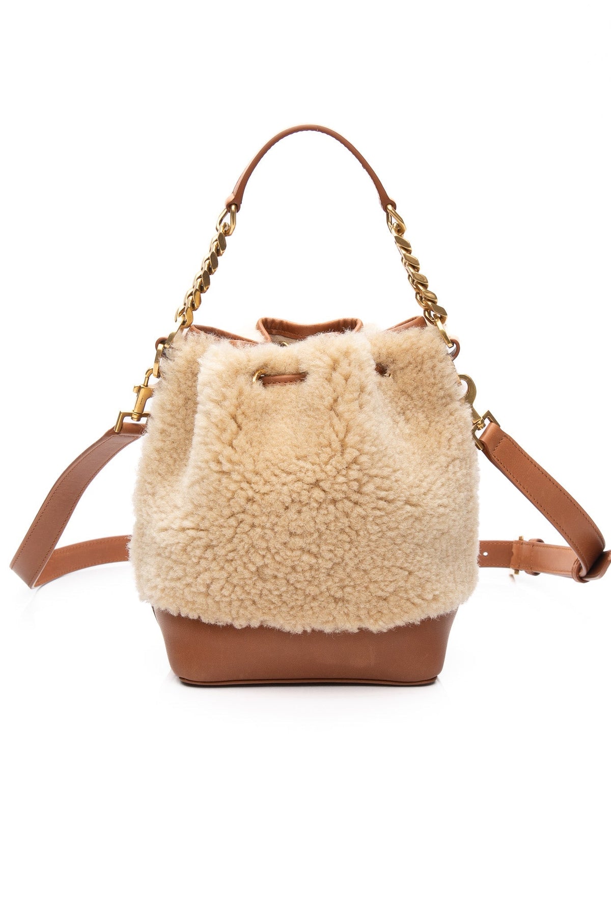 Regular price $2,370.00 Sale price $440.00 Save $1,930.00This bucket-style handbag is crafted of beige lamb shearling and brown calfskin leather. The bag features an antiqued gold chain and brown leather top handle, a detachable brown leather crossbody strap, and a brown drawstring leather closure. This opens the bag to a beige suede and brown leather interior.