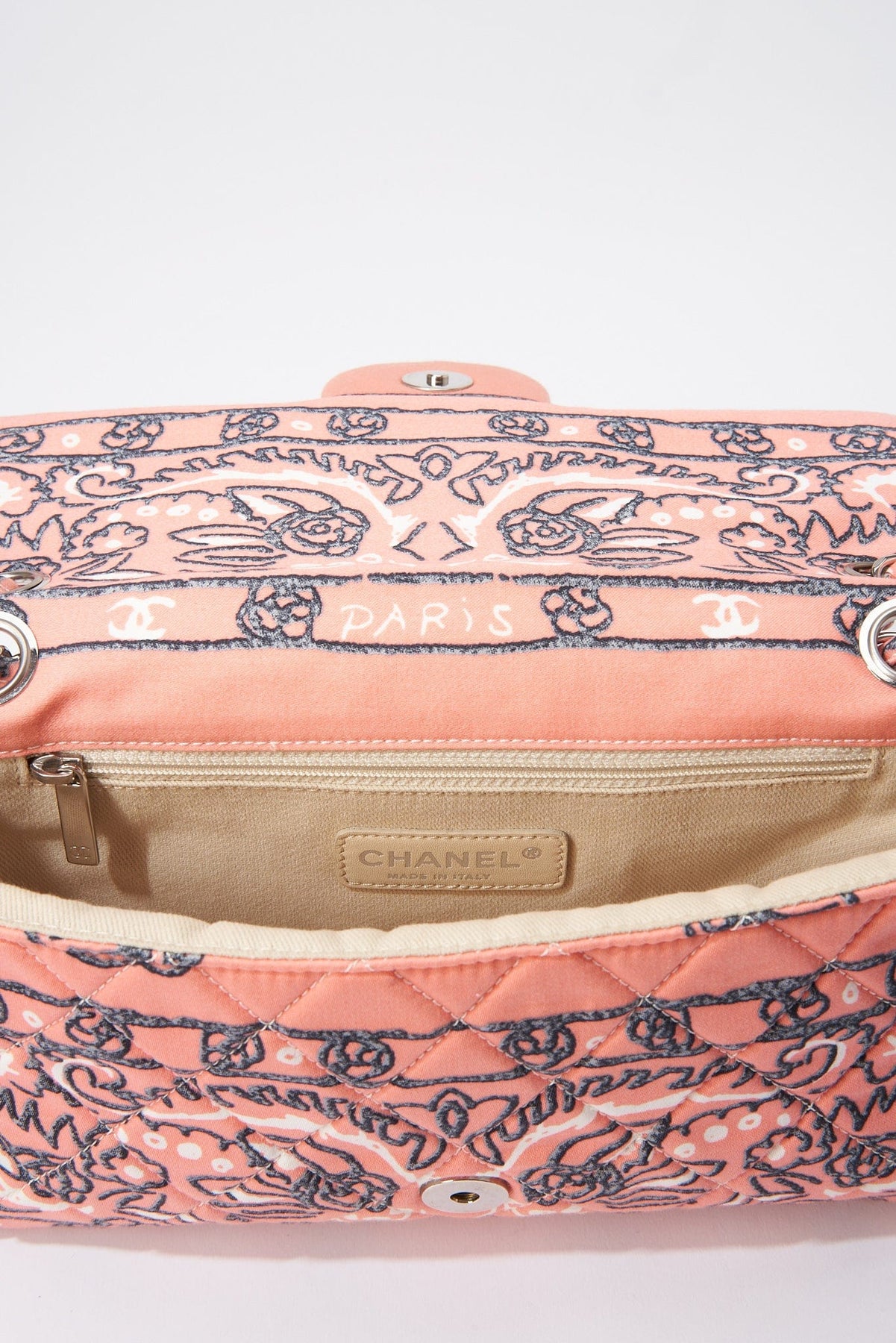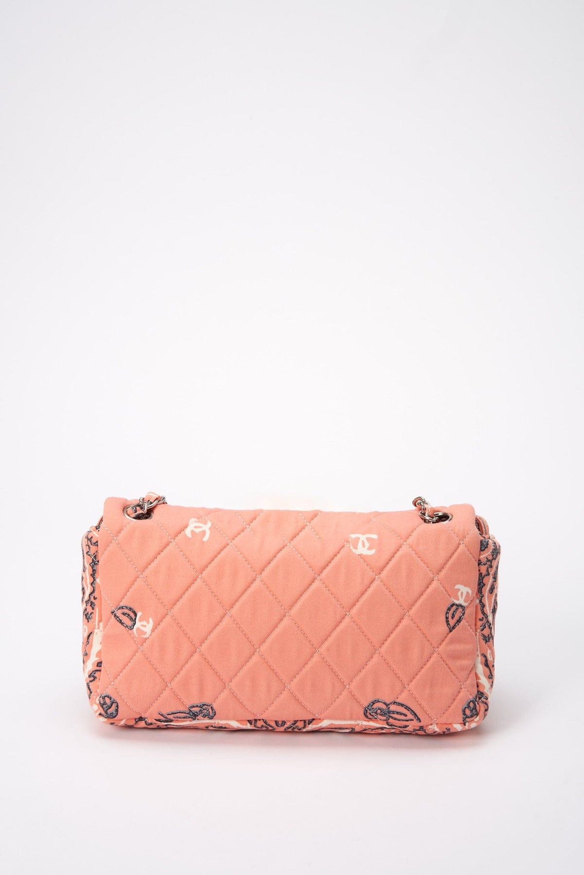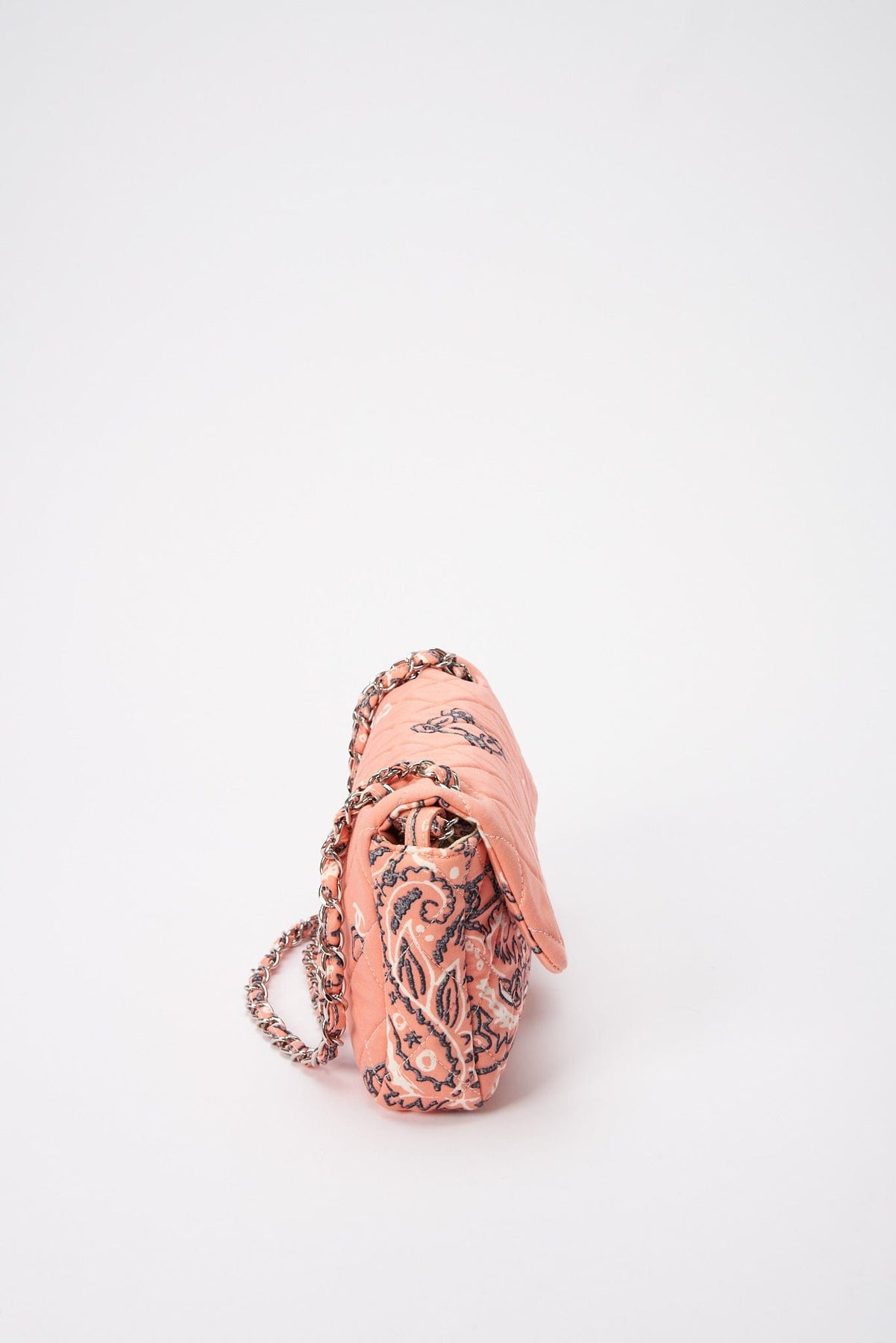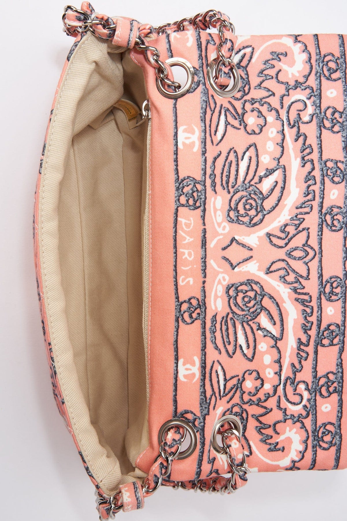 Regular price $2,040.00 Sale price $420.00 Save $1,620.00A rare Chanel Bandana Paisley Print Cotton cotton single flap shoulder bag with silver hardware. This bag is lined with a beige cotton twill lining and has an internal zipped pocket with CC zip pull.