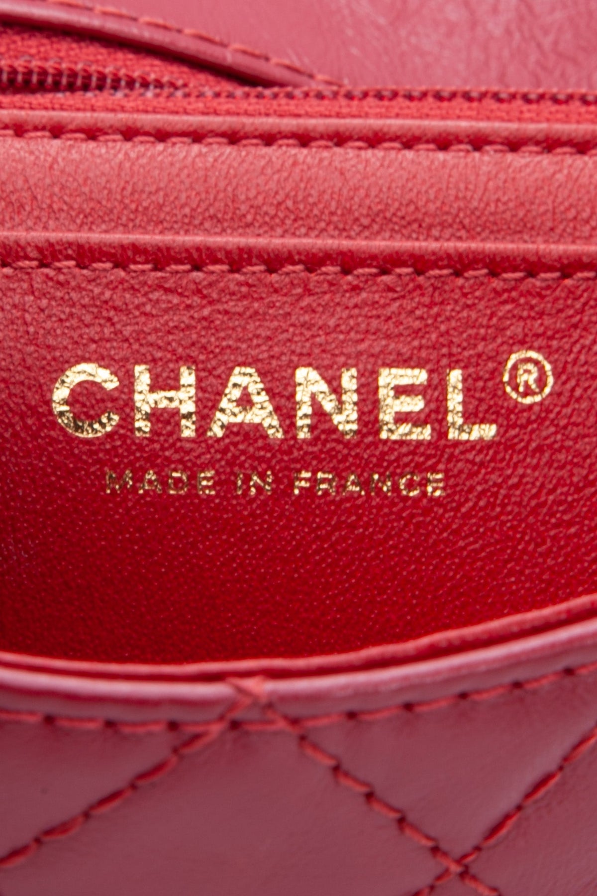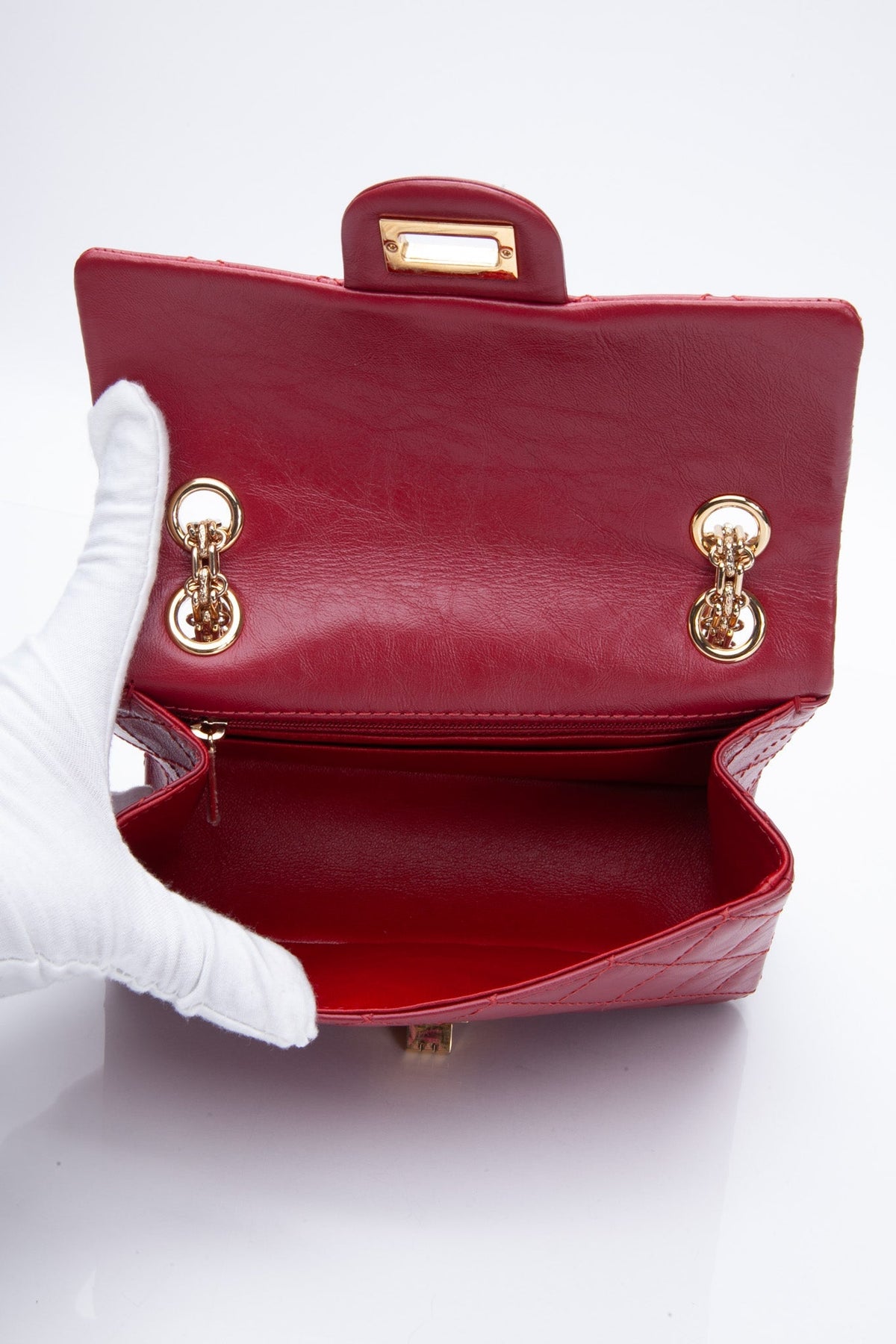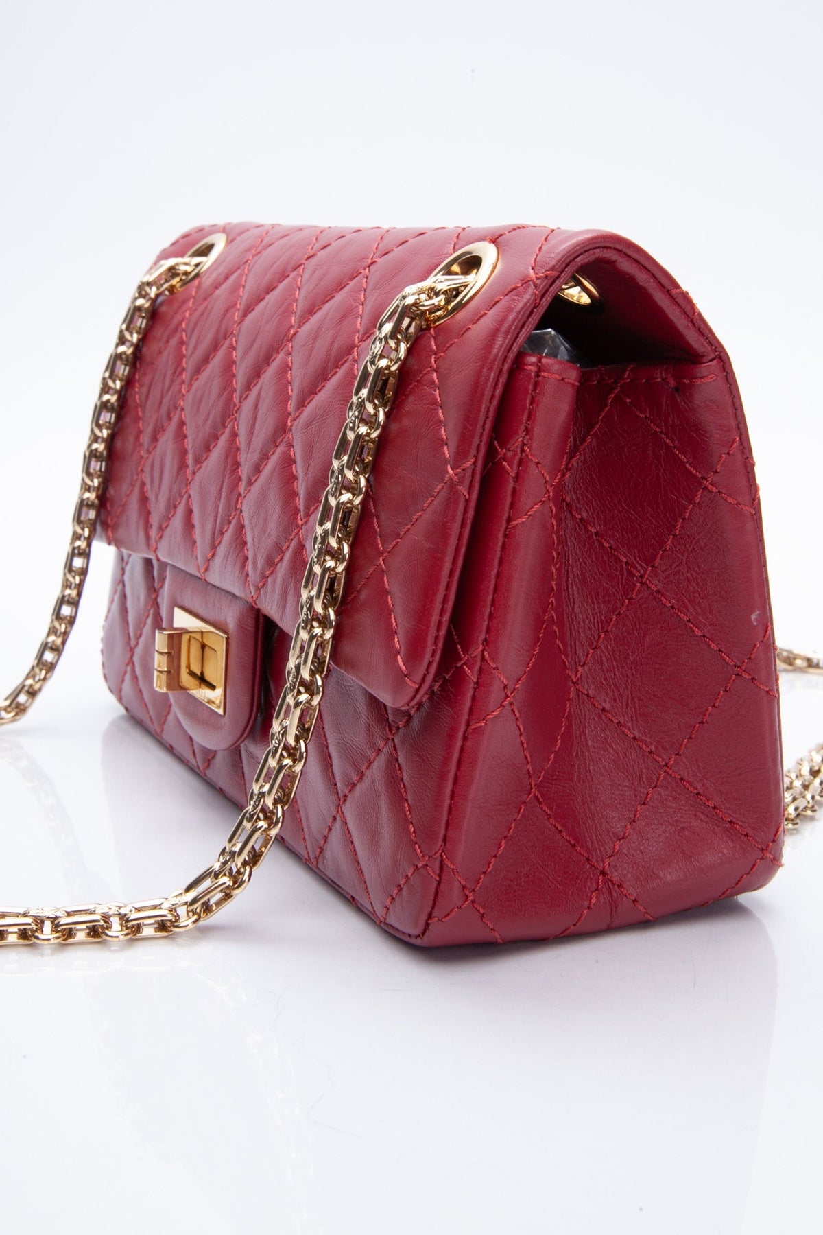 Regular price $2,320.00 Sale price $430.00 Save $1,890.00This stylish shoulder bag is beautifully crafted of aged, diamond-quilted calfskin leather in red. The bag features a rear patch pocket, an aged gold reissue chain shoulder strap, and a matching gold mademoiselle turn lock on the crossover flap. This opens the bag to a smooth red leather interior with zipper and patch pockets.