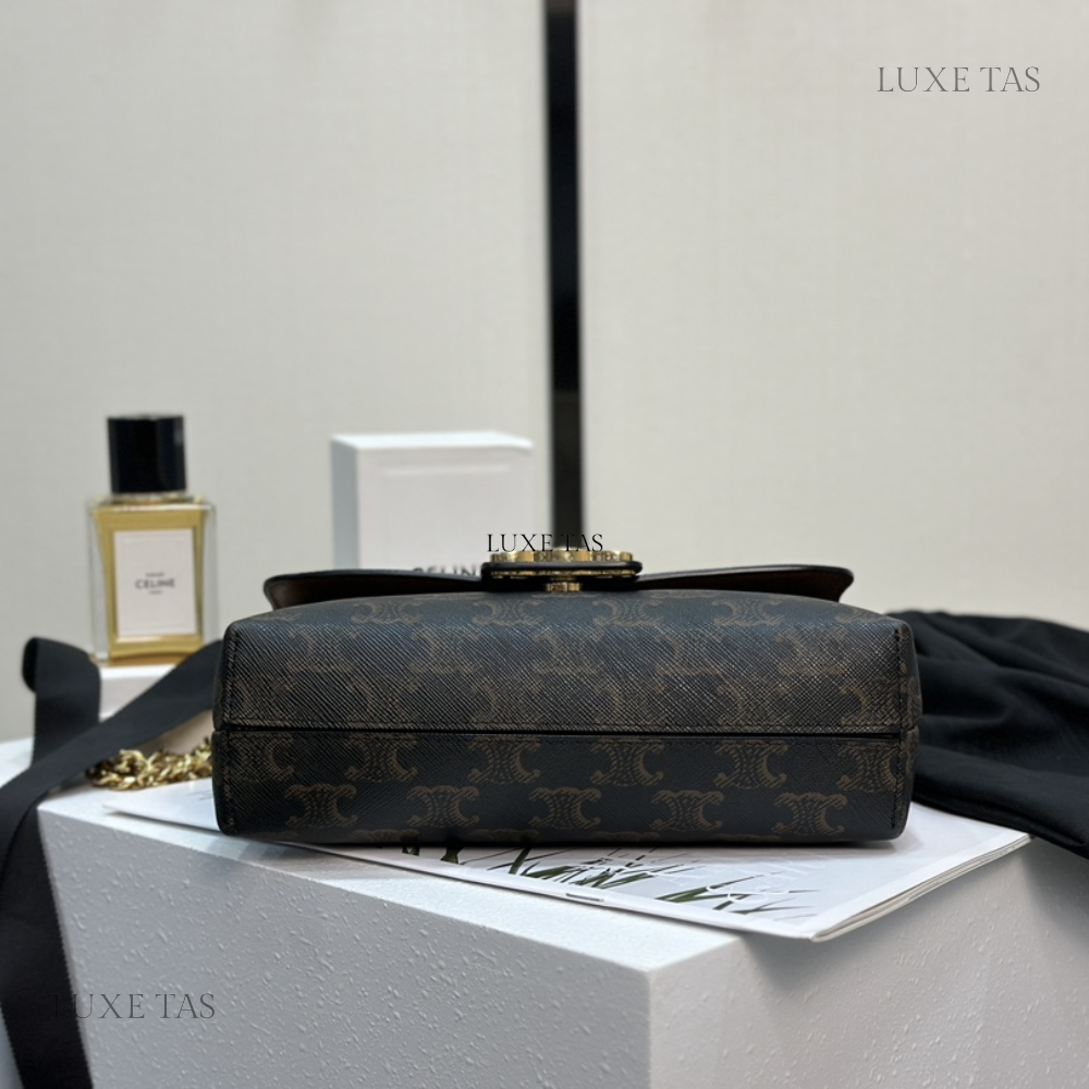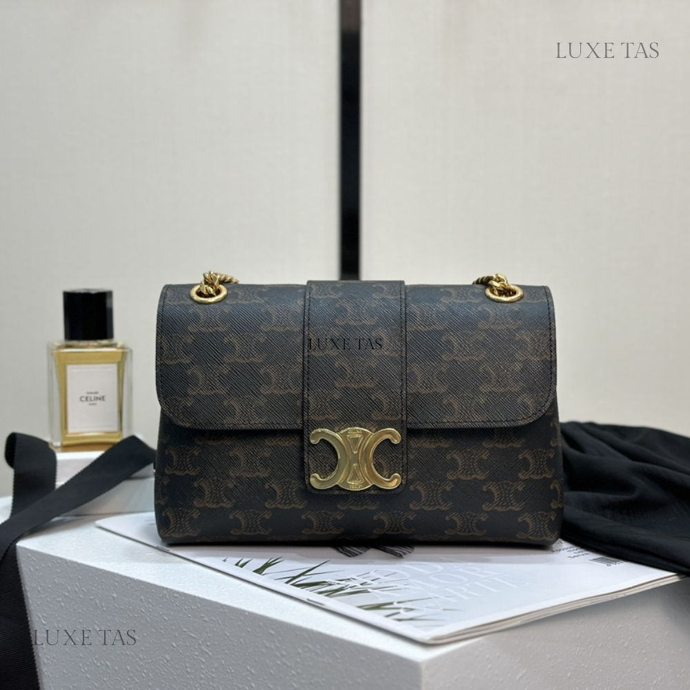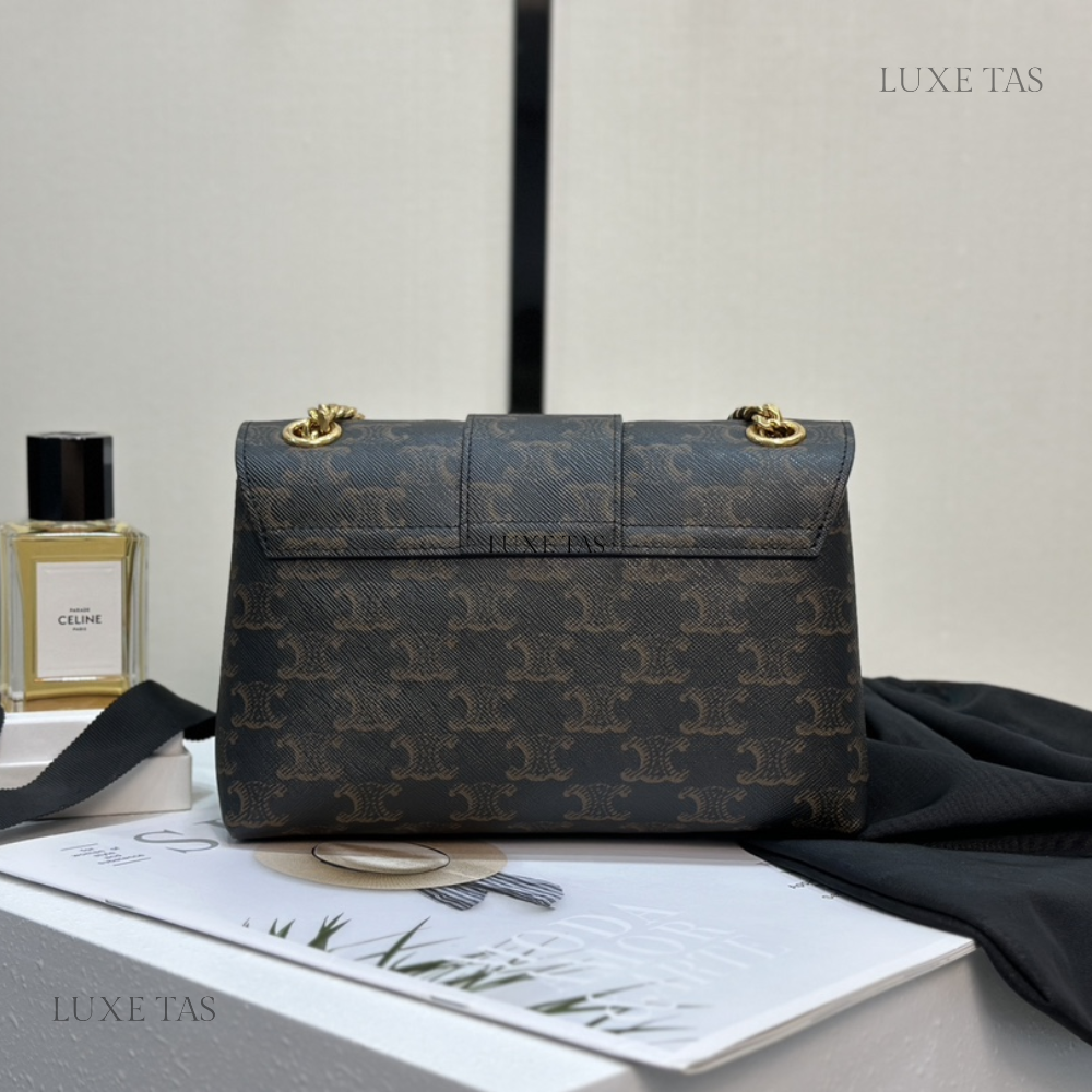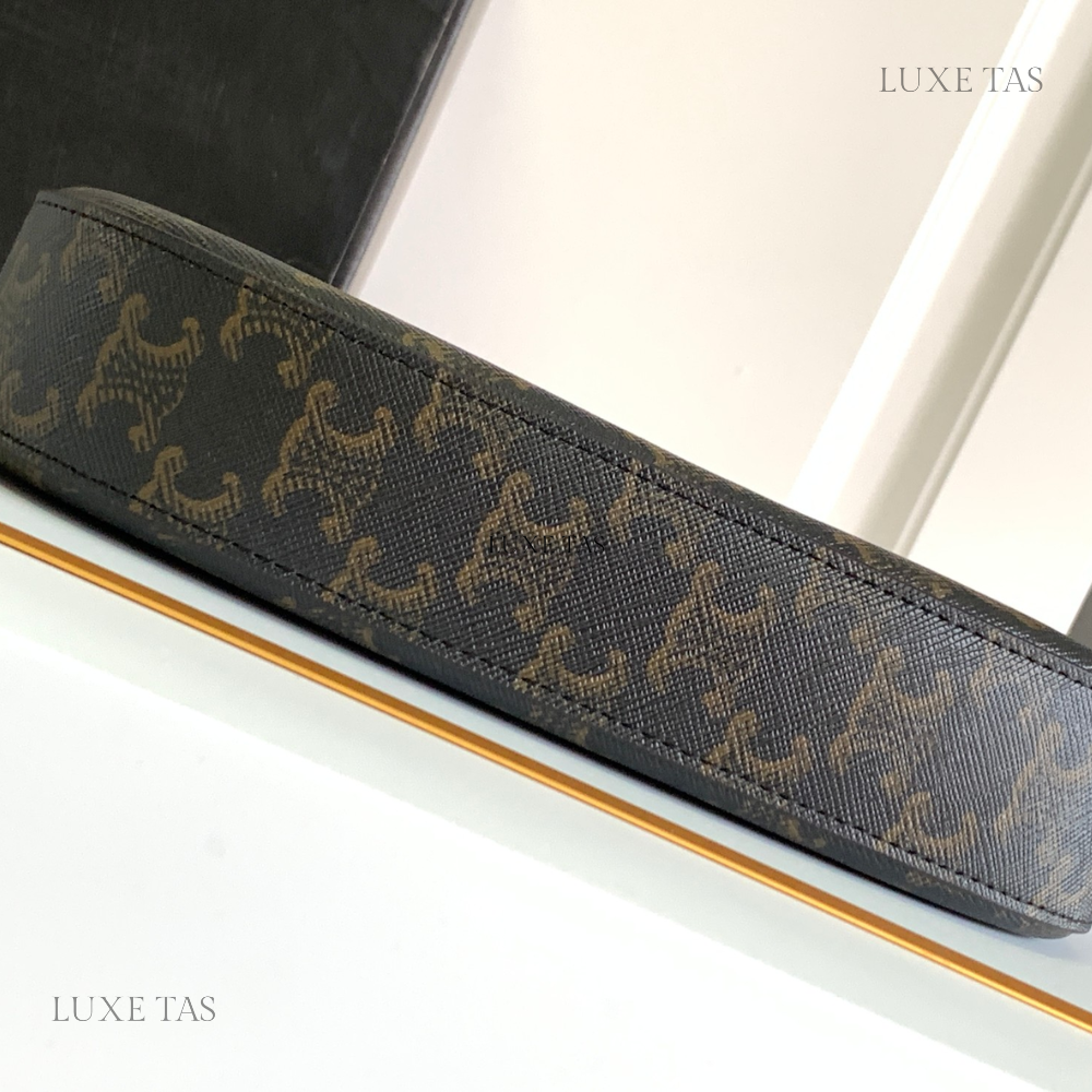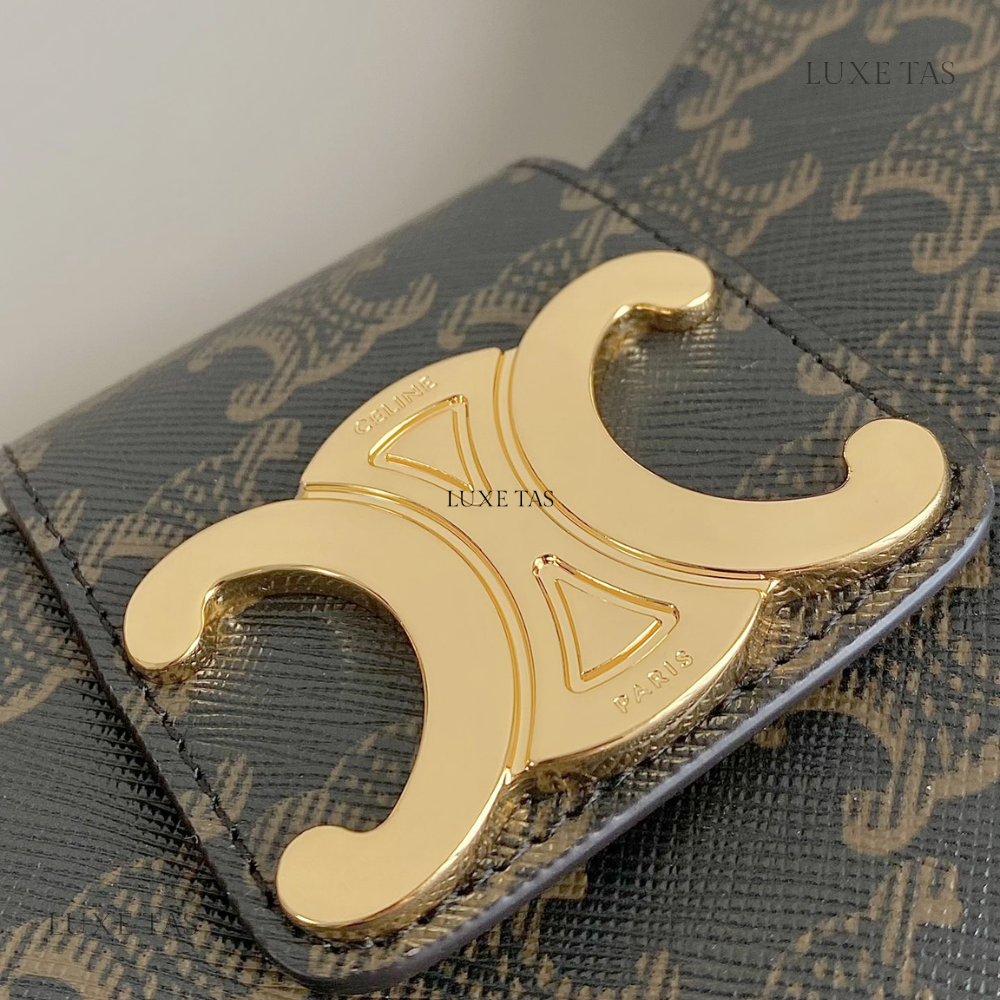 Elevate your style with our exquisite bag crafted from luxurious Triomphe canvas and lined with sumptuous lambskin for a touch of refinement. Enhanced with gleaming gold finishing, this bag exudes timeless elegance. Offering versatile carrying options, it can be worn cross-body or over the shoulder, ensuring both comfort and sophistication. The iconic Triomphe snap button closure adds a touch of charm and security to this classic accessory. Step out in style and make a statement with every step.