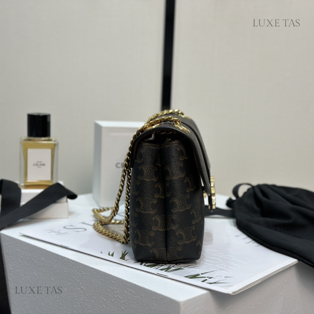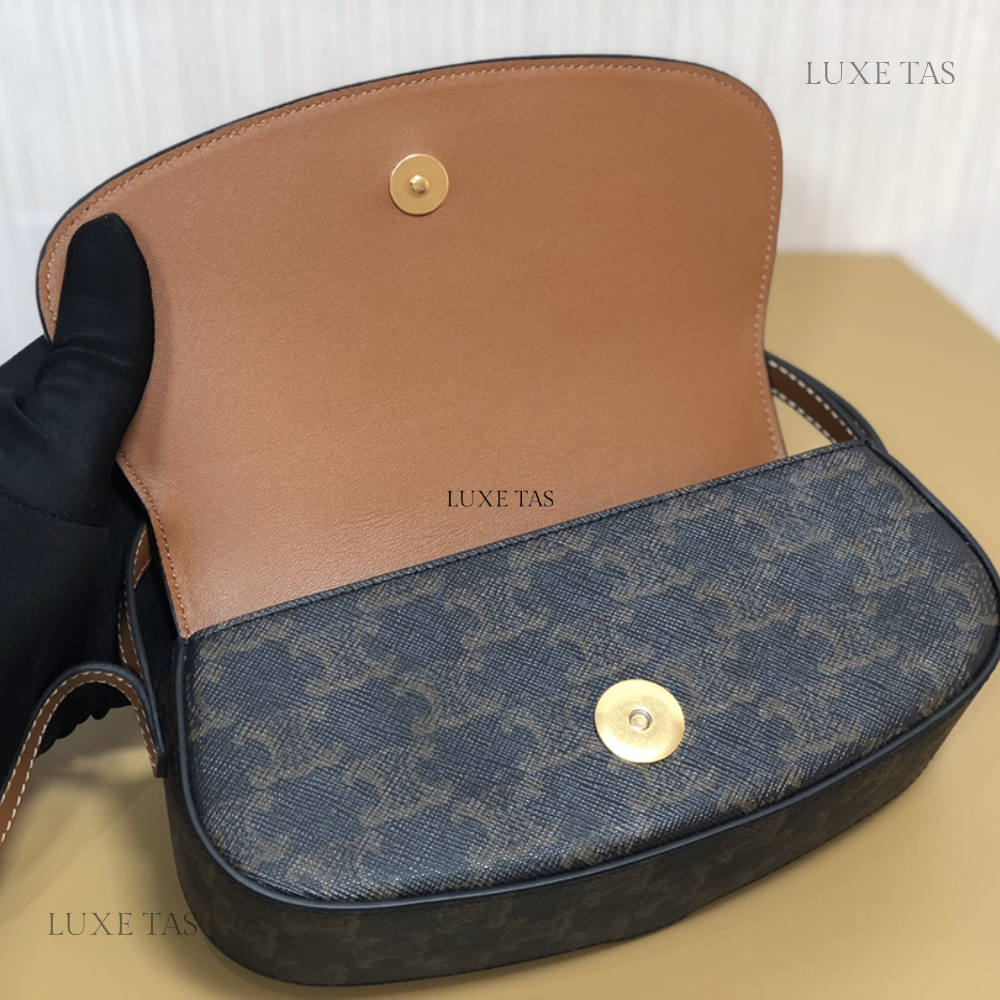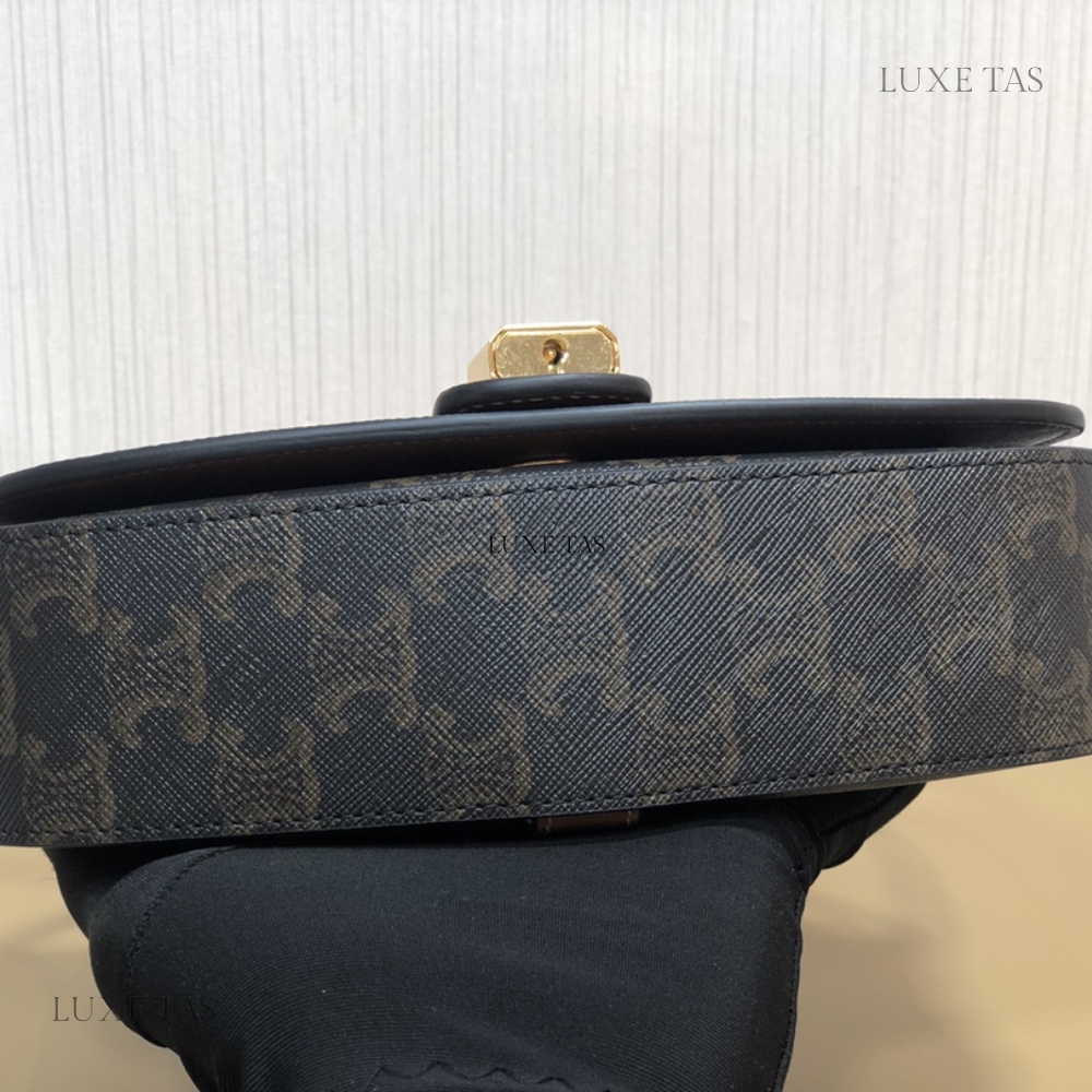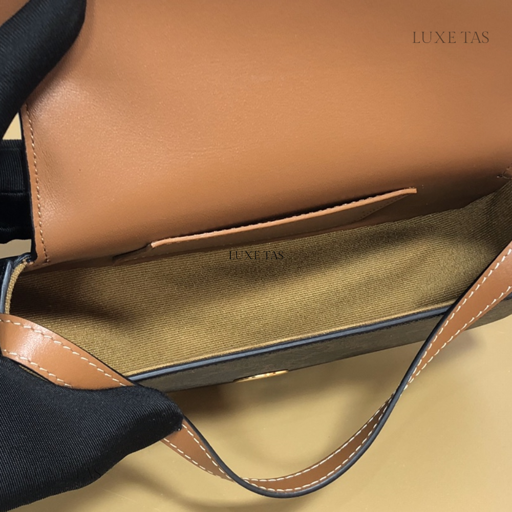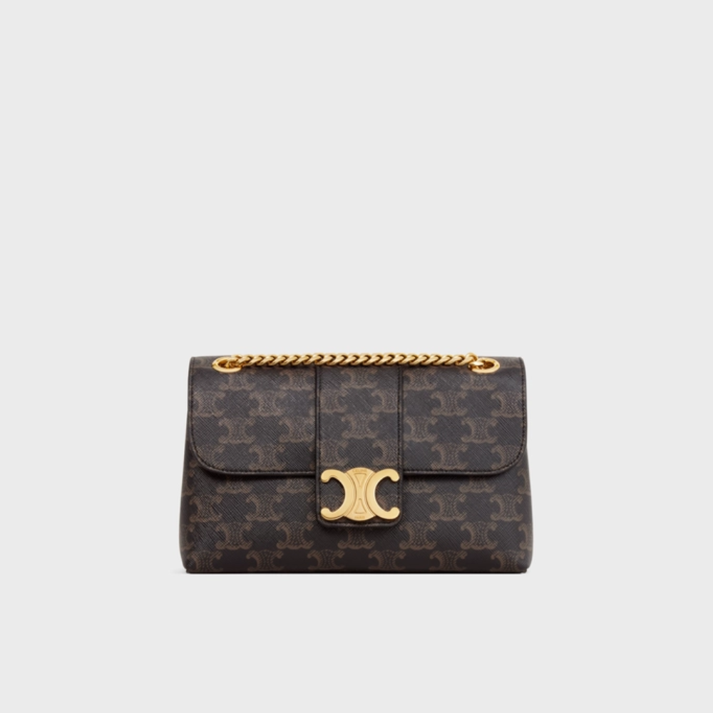 Elevate your style with our exquisite bag crafted from luxurious Triomphe canvas and lined with sumptuous lambskin for a touch of refinement. Enhanced with gleaming gold finishing, this bag exudes timeless elegance. Offering versatile carrying options, it can be worn cross-body or over the shoulder, ensuring both comfort and sophistication. The iconic Triomphe snap button closure adds a touch of charm and security to this classic accessory. Step out in style and make a statement with every step.