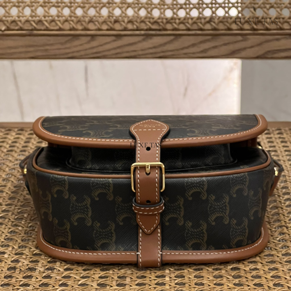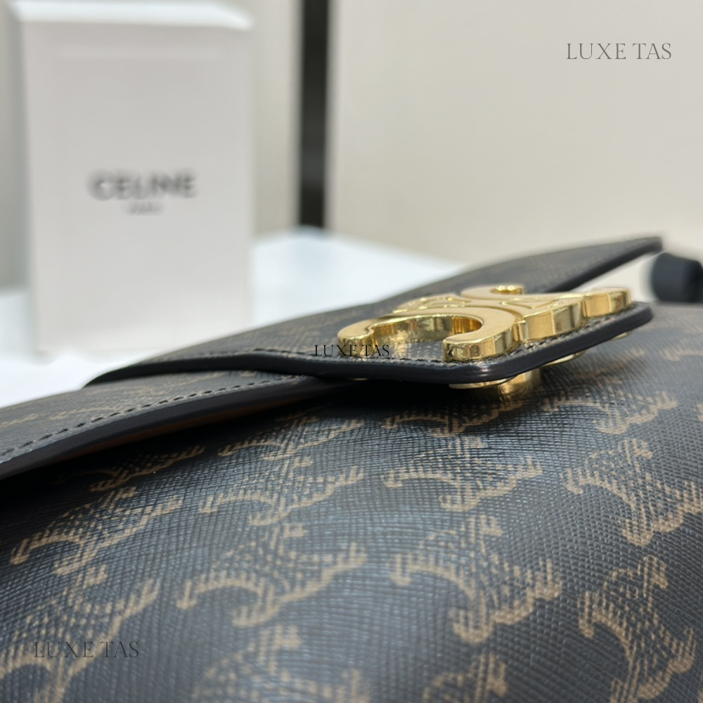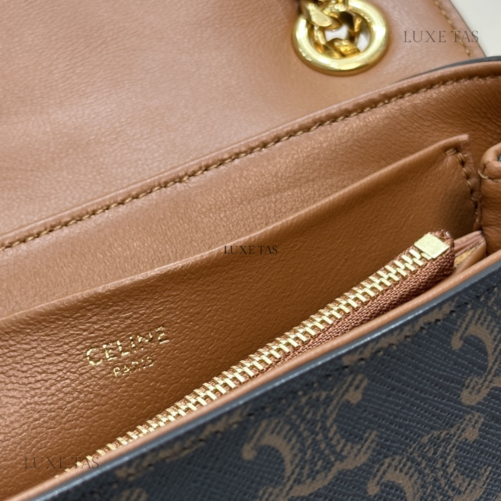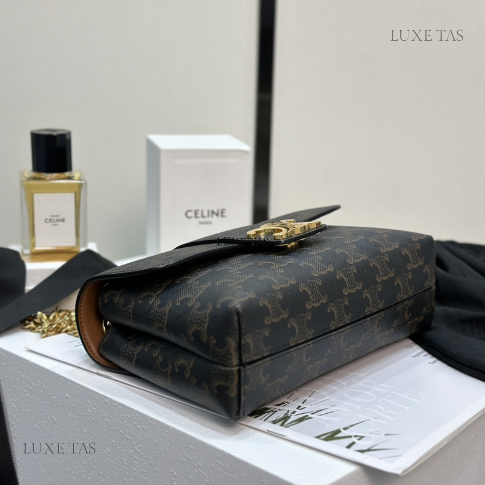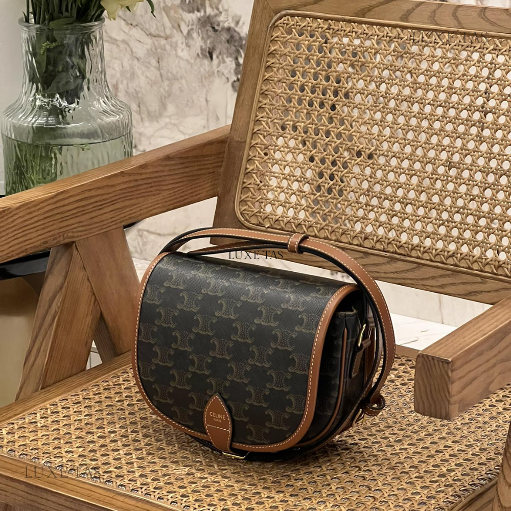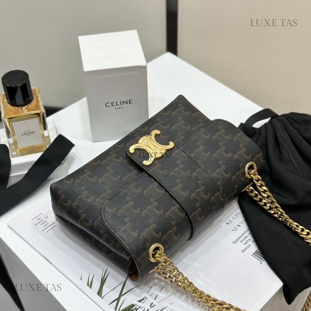 Elevate your style with our exquisite bag crafted from luxurious Triomphe canvas and lined with sumptuous lambskin for a touch of refinement. Enhanced with gleaming gold finishing, this bag exudes timeless elegance. Offering versatile carrying options, it can be worn cross-body or over the shoulder, ensuring both comfort and sophistication. The iconic Triomphe snap button closure adds a touch of charm and security to this classic accessory. Step out in style and make a statement with every step.