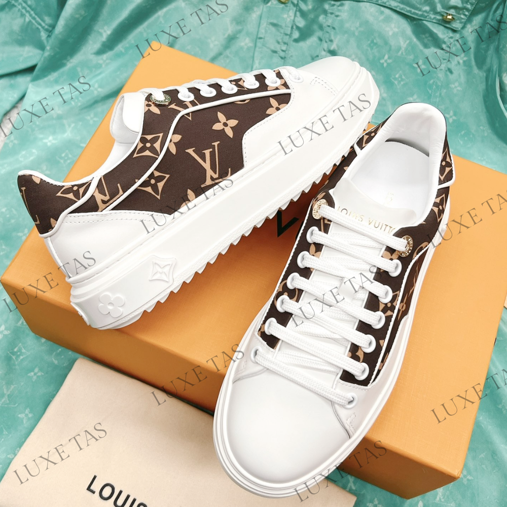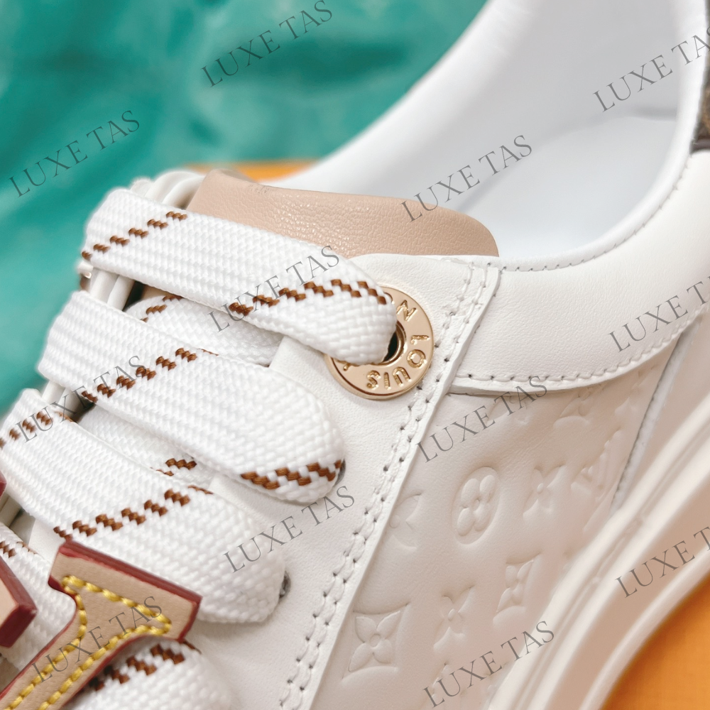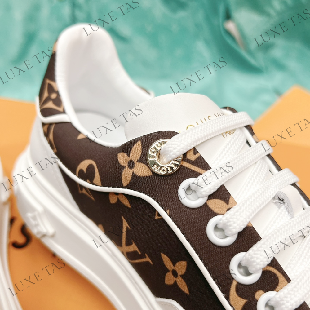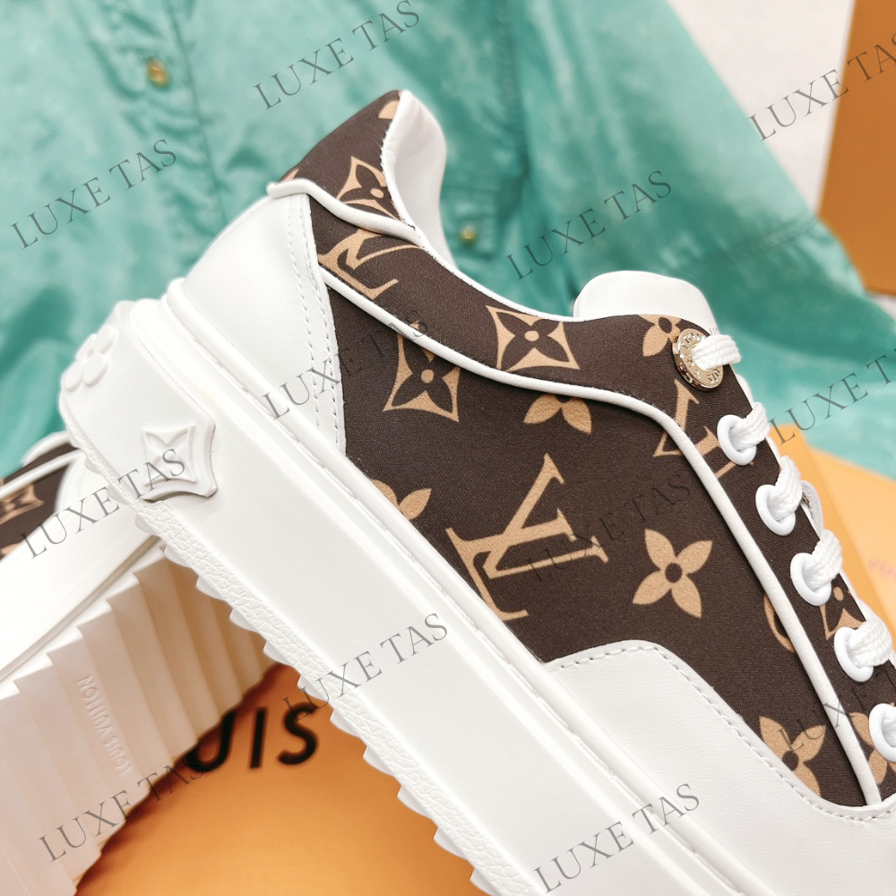 Experience the revamped Time Out sneaker in a captivating blend of calf leather and sustainable Monogram nylon, an exquisite manifestation of style and eco-consciousness. Elevating its allure, this model showcases a fashionable elevated outsole adorned with debossed Monogram Flower motifs, paying homage to Louis Vuitton's iconic heritage. The addition of two meticulously crafted, gold-tone eyelets engraved with the L*V signature further accentuates the luxurious appeal of this extraordinary design.