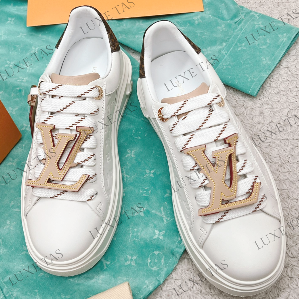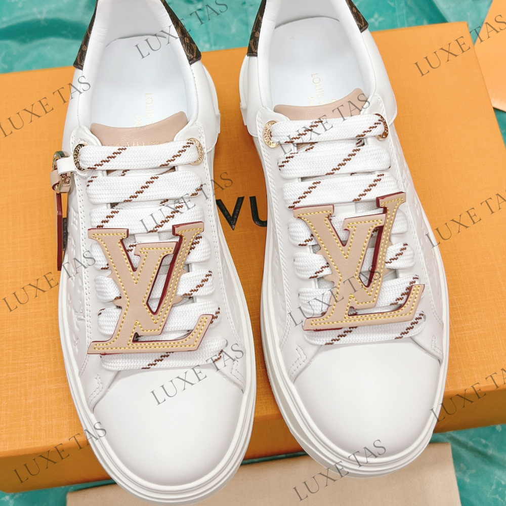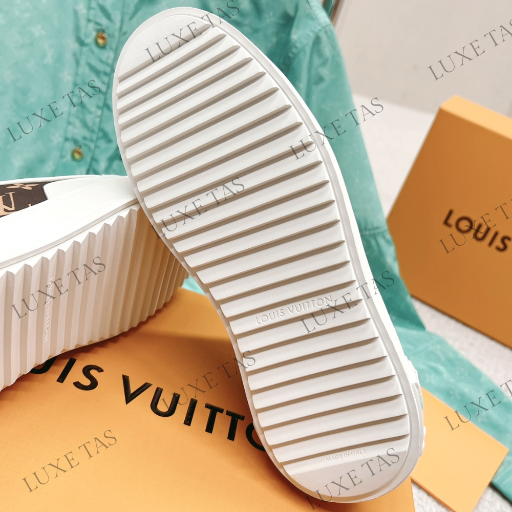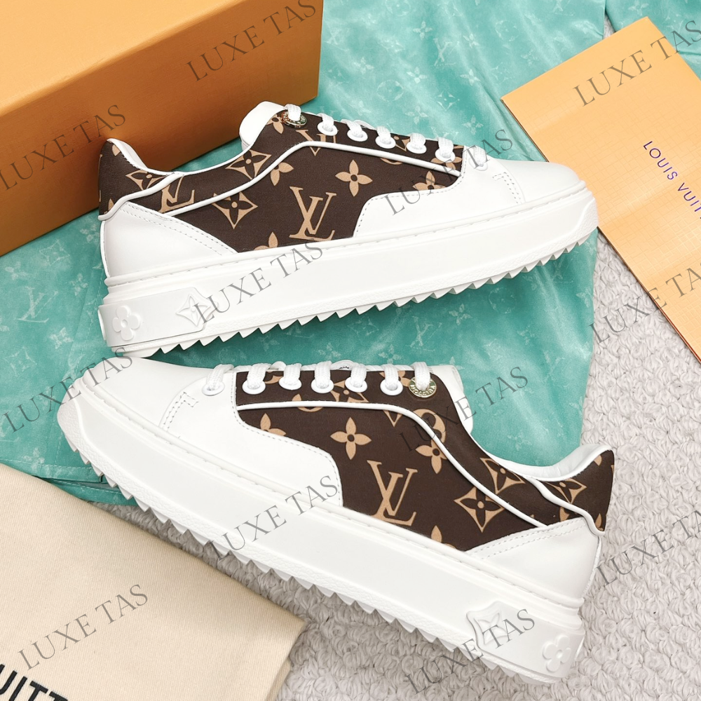 Experience the revamped Time Out sneaker in a captivating blend of calf leather and sustainable Monogram nylon, an exquisite manifestation of style and eco-consciousness. Elevating its allure, this model showcases a fashionable elevated outsole adorned with debossed Monogram Flower motifs, paying homage to Louis Vuitton's iconic heritage. The addition of two meticulously crafted, gold-tone eyelets engraved with the L*V signature further accentuates the luxurious appeal of this extraordinary design.