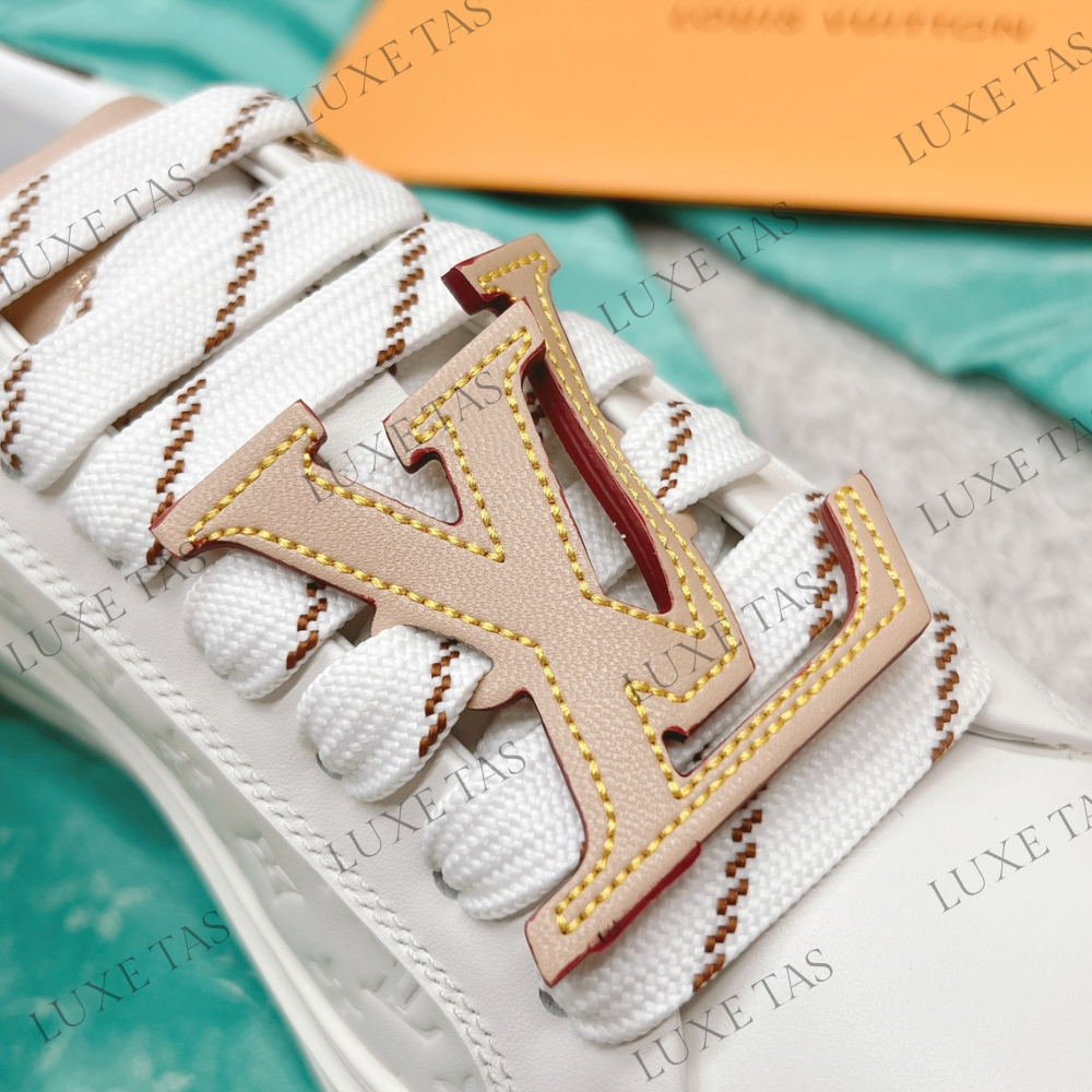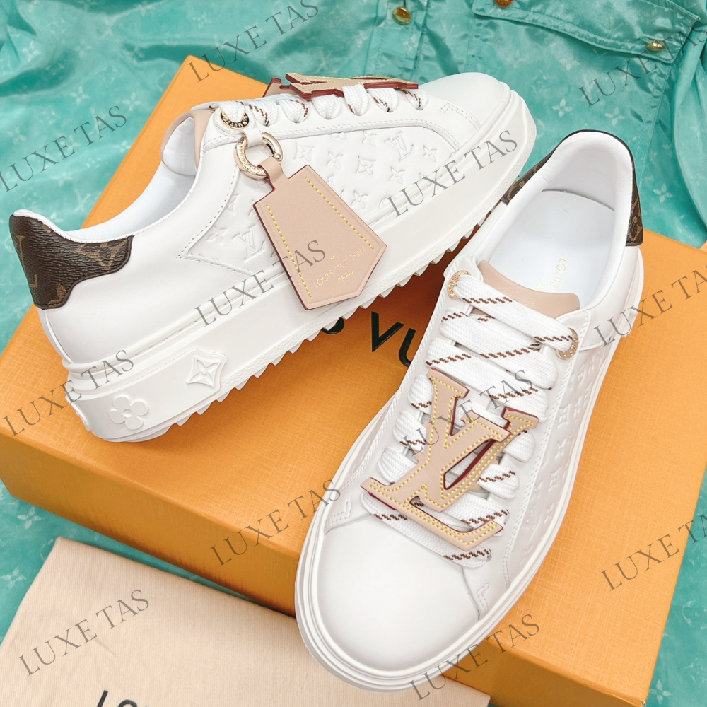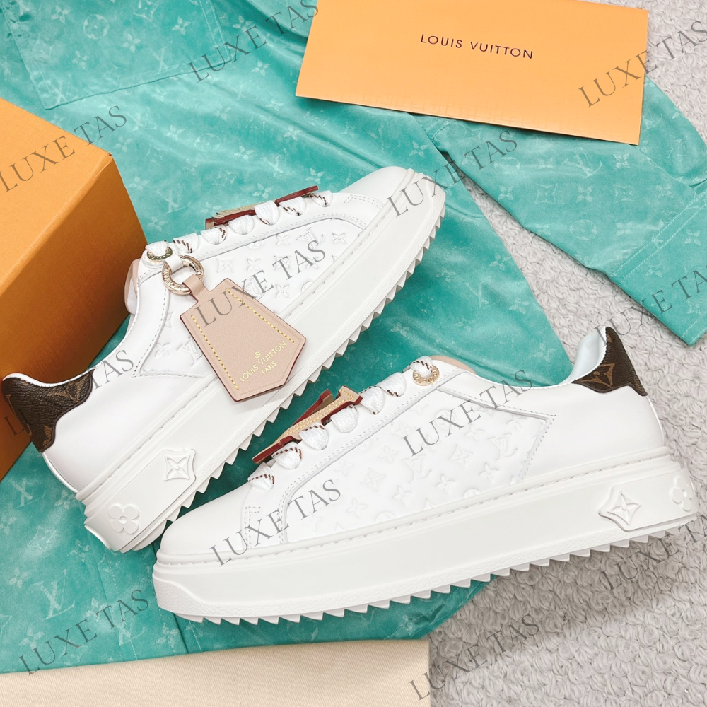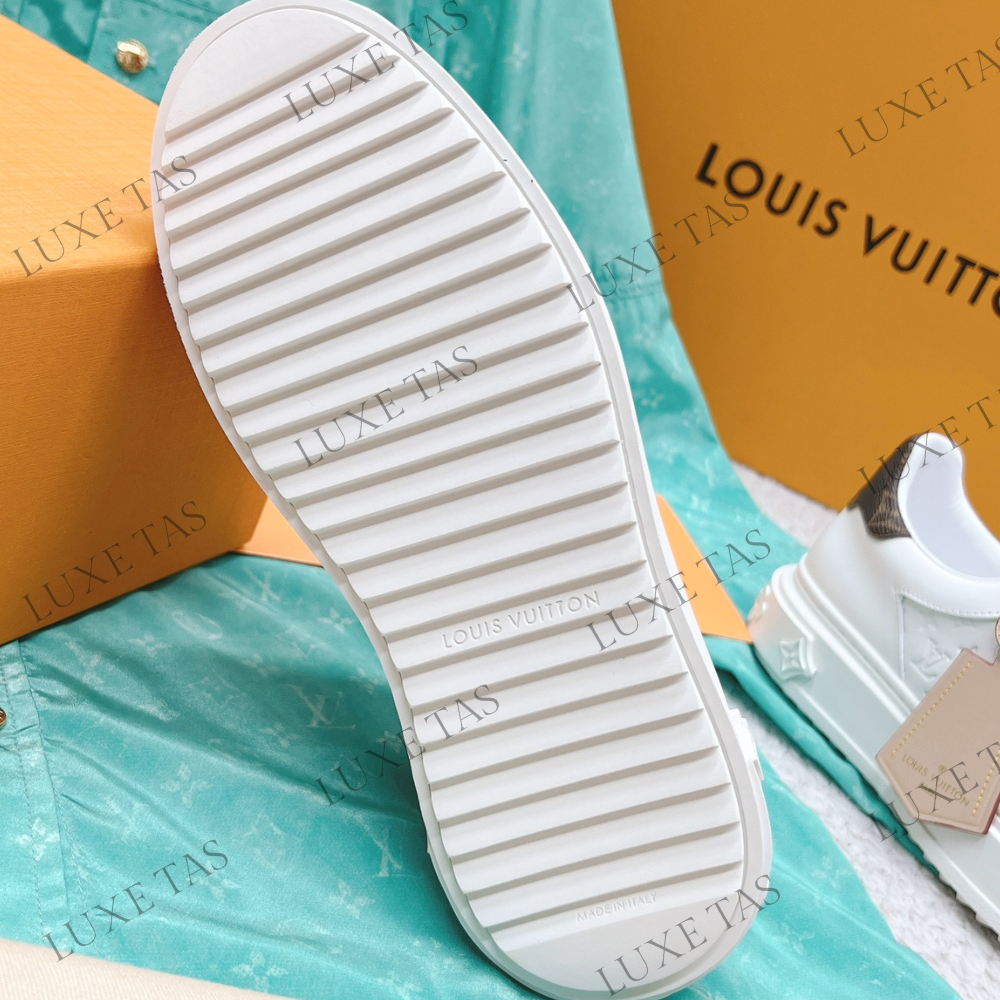 Elevate your sneaker game with this exquisite rendition of the timeless Time Out sneaker. Crafted from supple calf leather, it features a delicate mini Monogram pattern embossed throughout. The attention to detail is evident with the natural leather accents, including a luxurious L*V luggage tag inspired by the iconic leather goods showcased in the Spring-Summer 2023 fashion show. Completing the design is a sophisticated rubber outsole adorned with the signature Monogram Flowers. Step into style and luxury with this refined masterpiece.