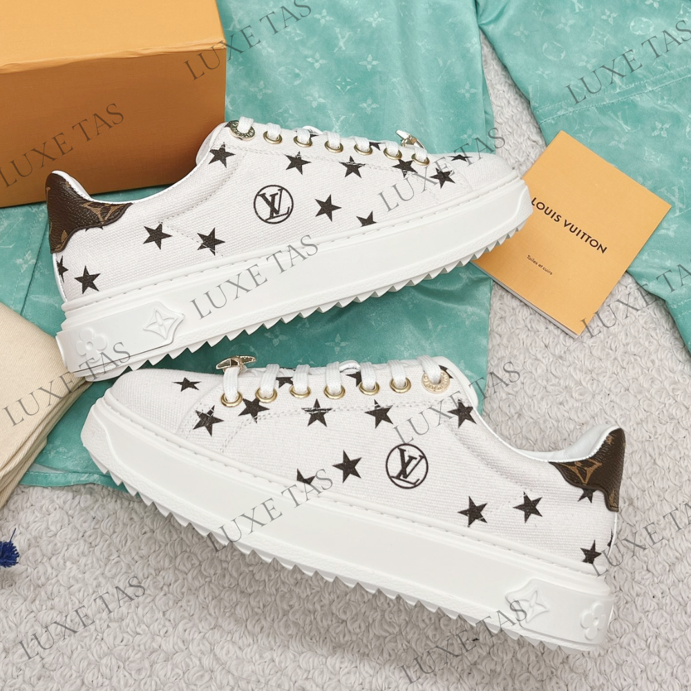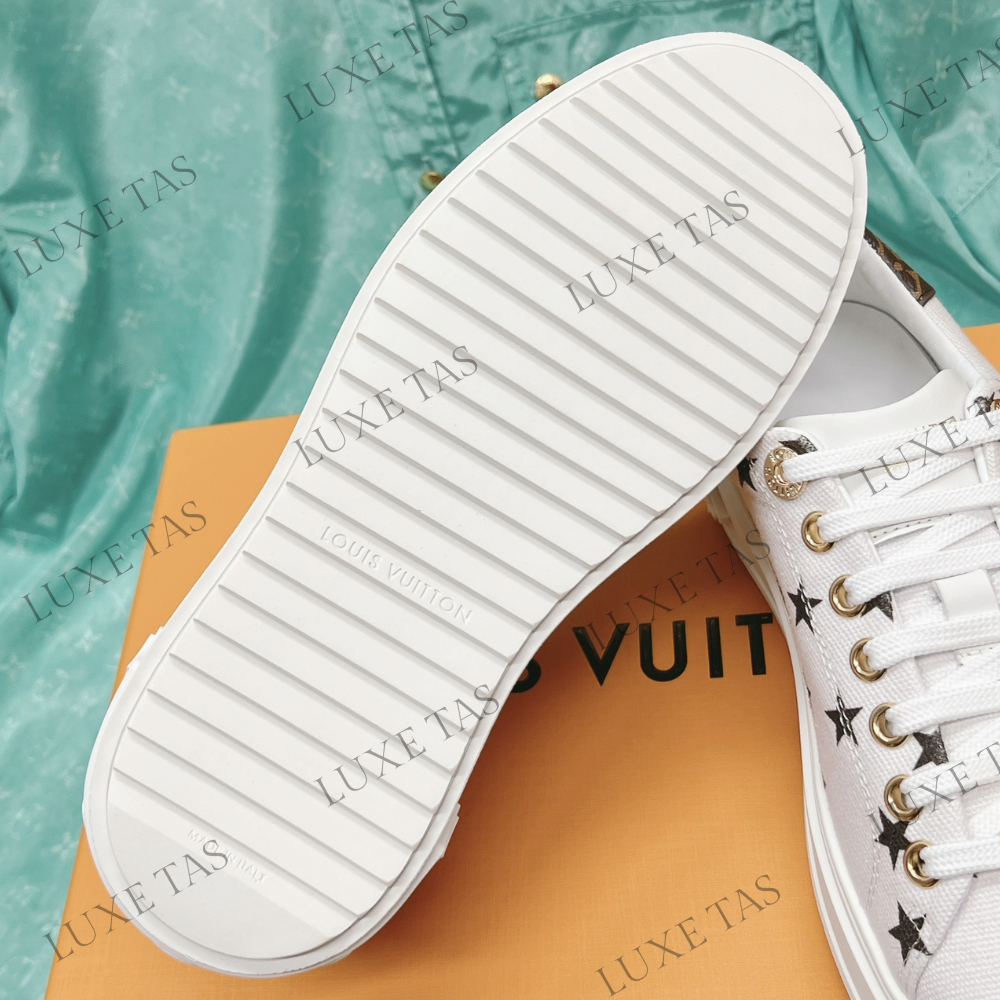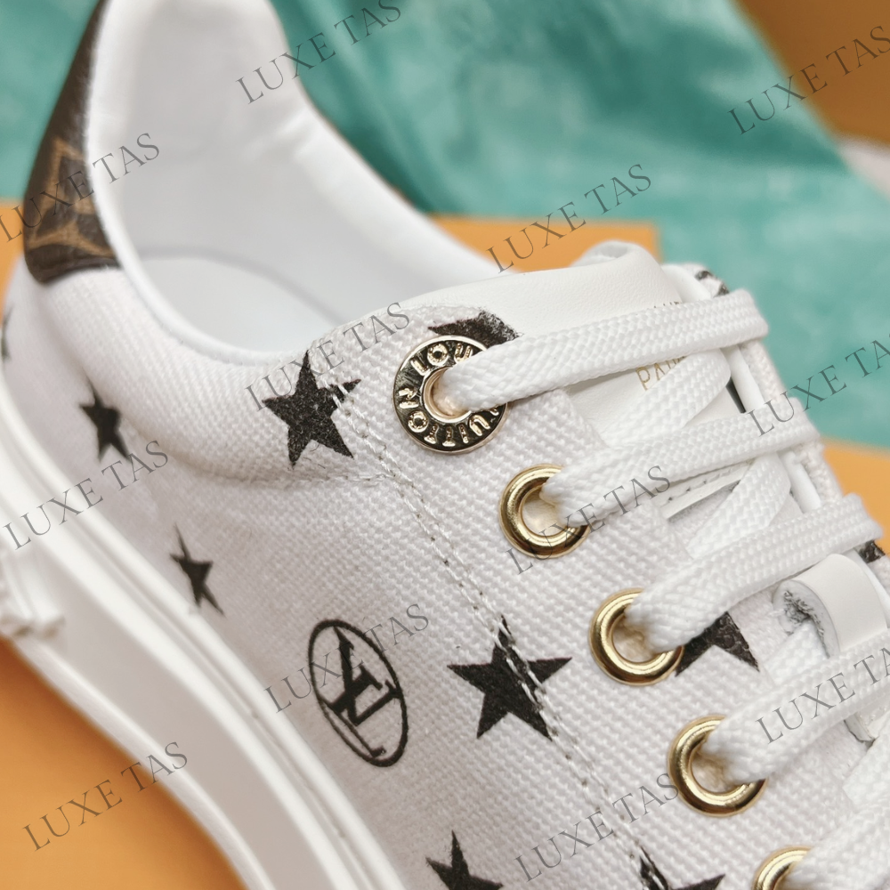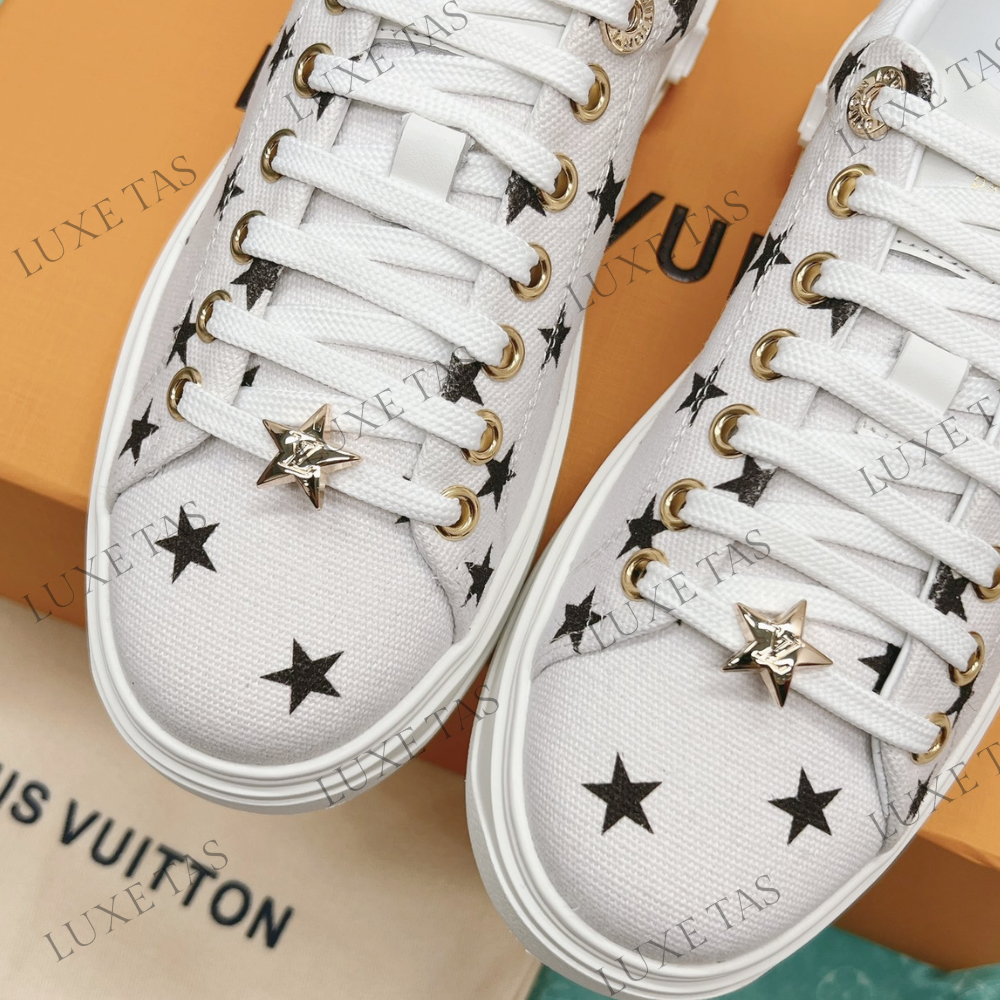 Step into the spotlight with the special edition of the Time Out sneaker, featuring a captivating canvas adorned with the season's star motif. Elevating its allure, the upper is enhanced with a gold-tone metal star-shaped lace accessory engraved with the iconic L*V Initials. This emblematic sneaker showcases an elevated rubber outsole adorned with a mesmerizing 3-D pattern of Monogram Flowers. Embrace style that shines with every step.