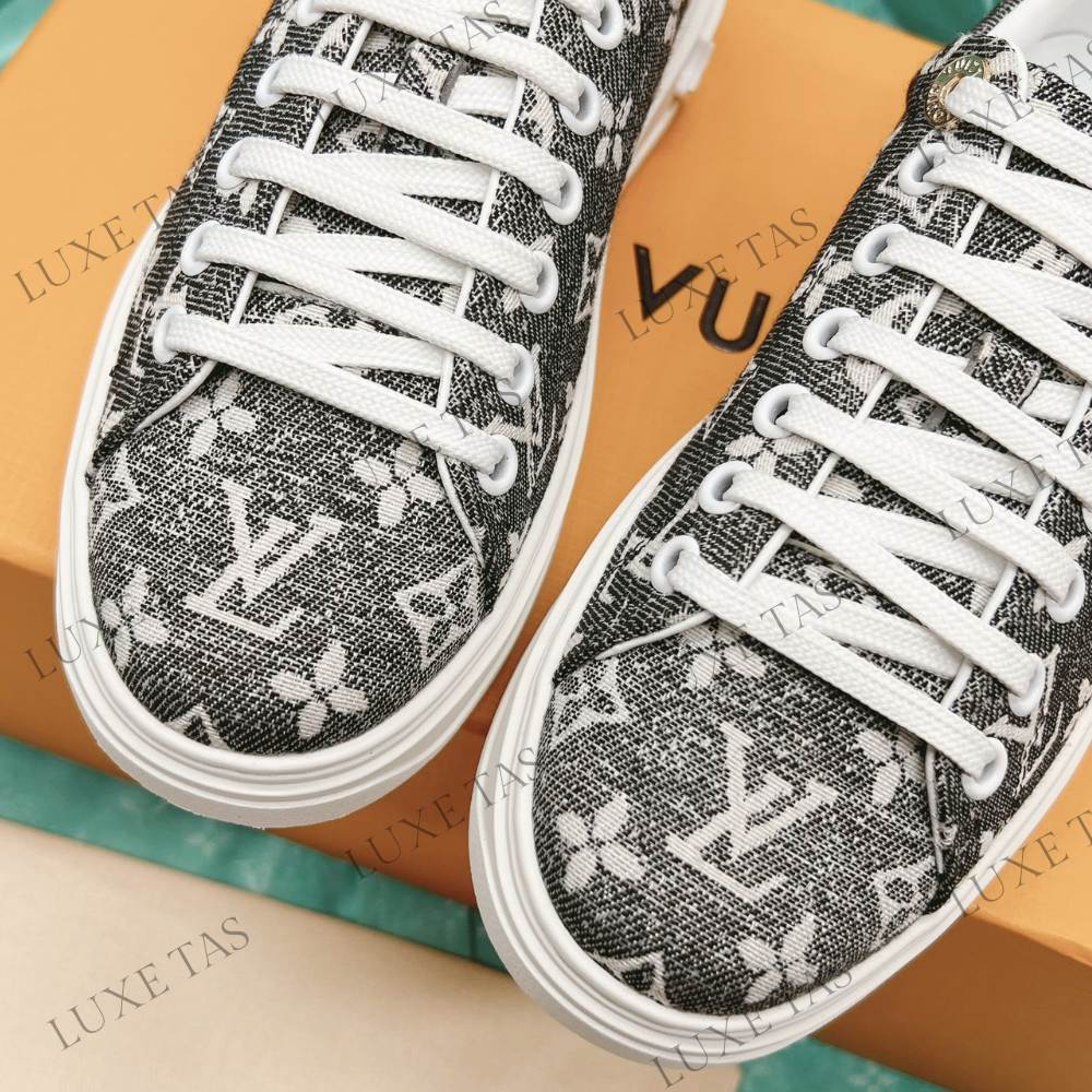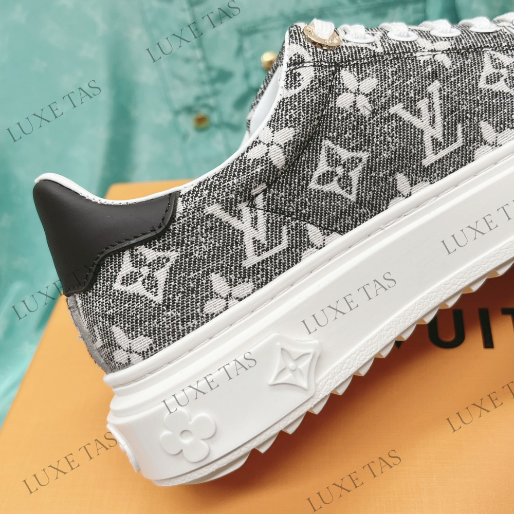Discover the stunning reimagination of the Time Out sneaker in the striking gray Monogram denim, harmoniously crafted to complement the exquisite Cruise 2023 leather goods collection. Embodying the essence of Louis Vuitton's iconic style, this remarkable edition features a fashionable elevated outsole adorned with captivating Monogram Flowers. The addition of white laces and intricately engraved, gold-tone eyelets perfectly accentuates the intricate design, creating a truly captivating and sophisticated aesthetic.