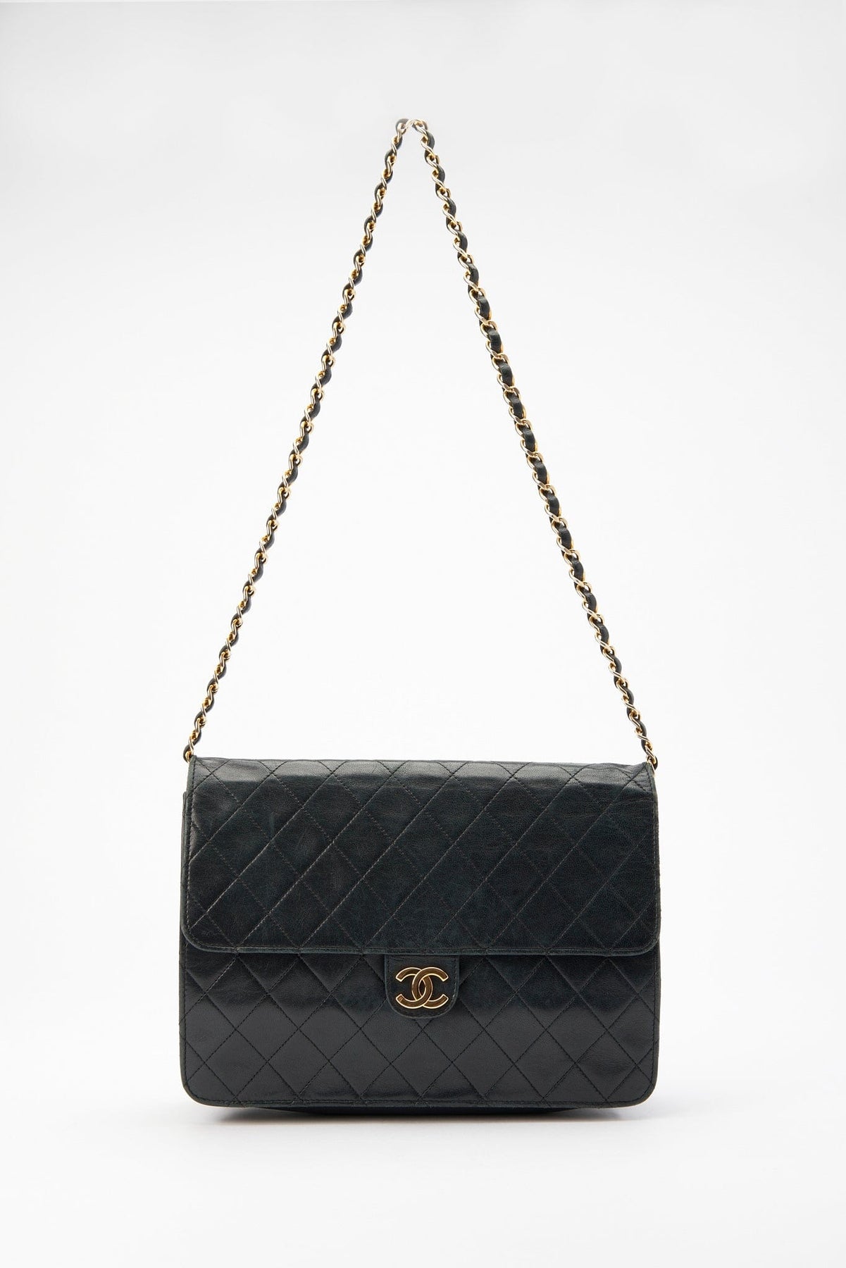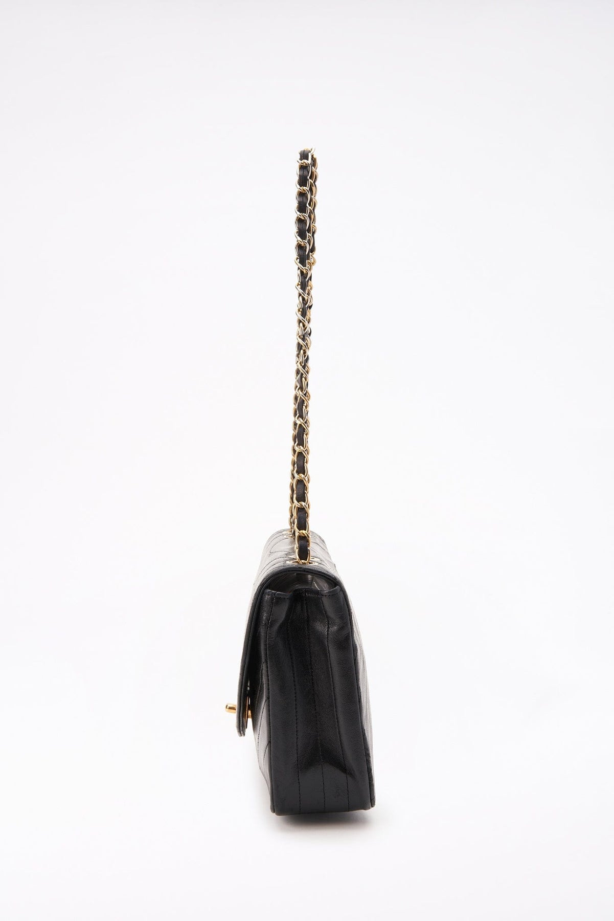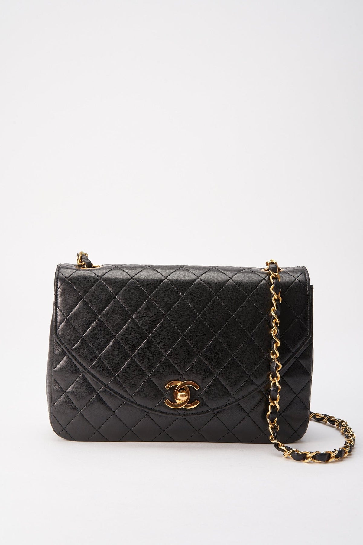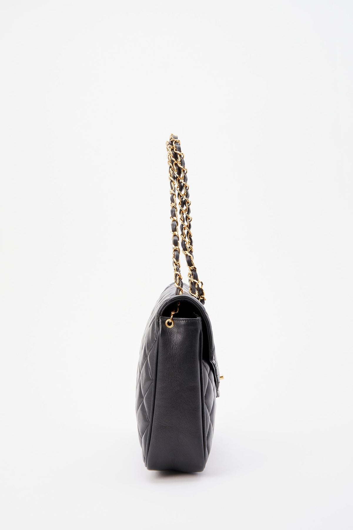 Regular price $2,020.00 Sale price $410.00 Save $1,610.00This vintage Classic Chanel Single Flap bag is crafted from black quilted lambskin leather with gold hardware and a leather-trimmed chain shoulder strap.