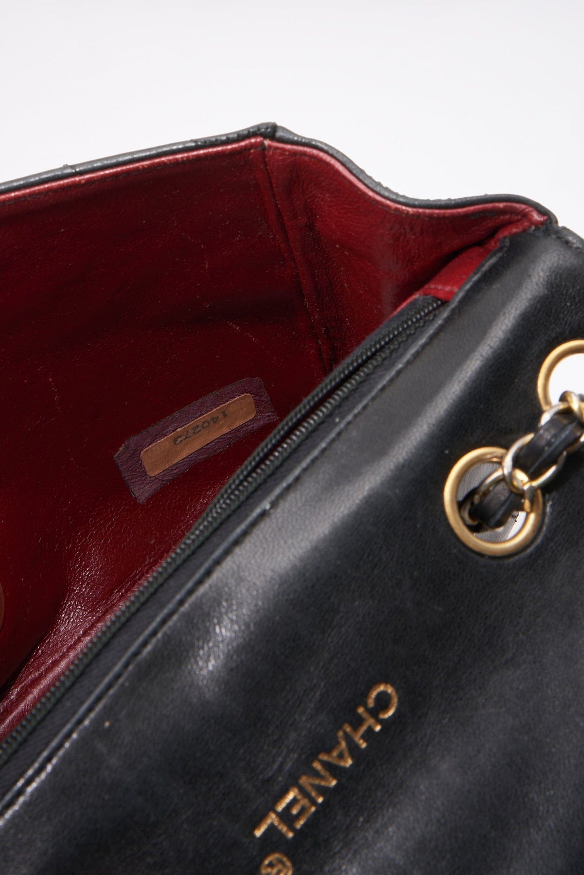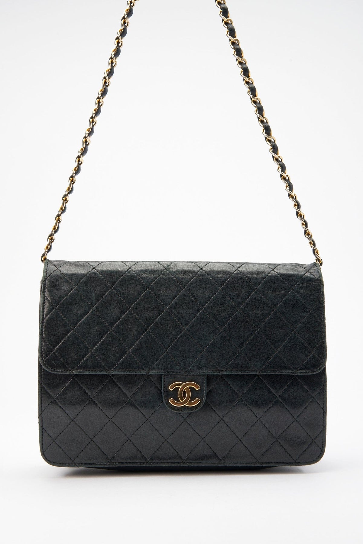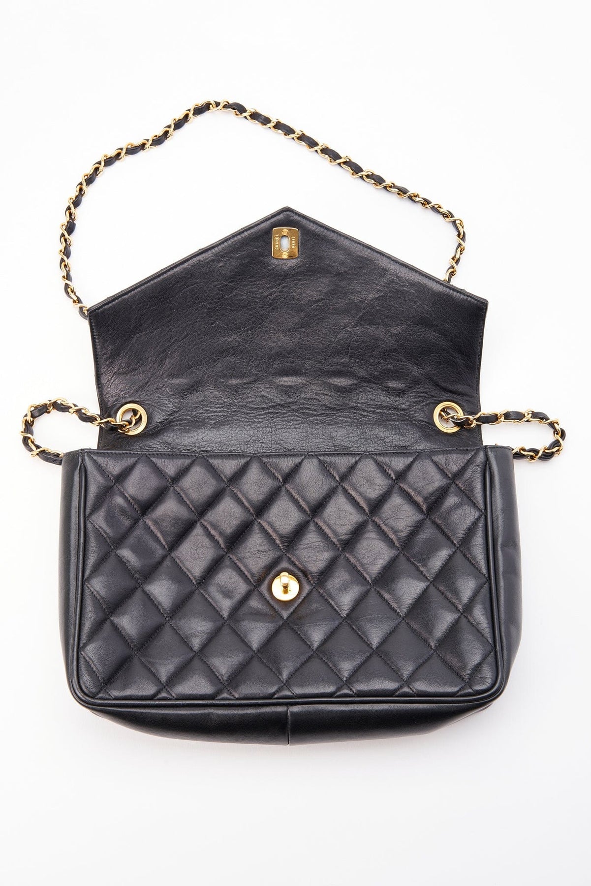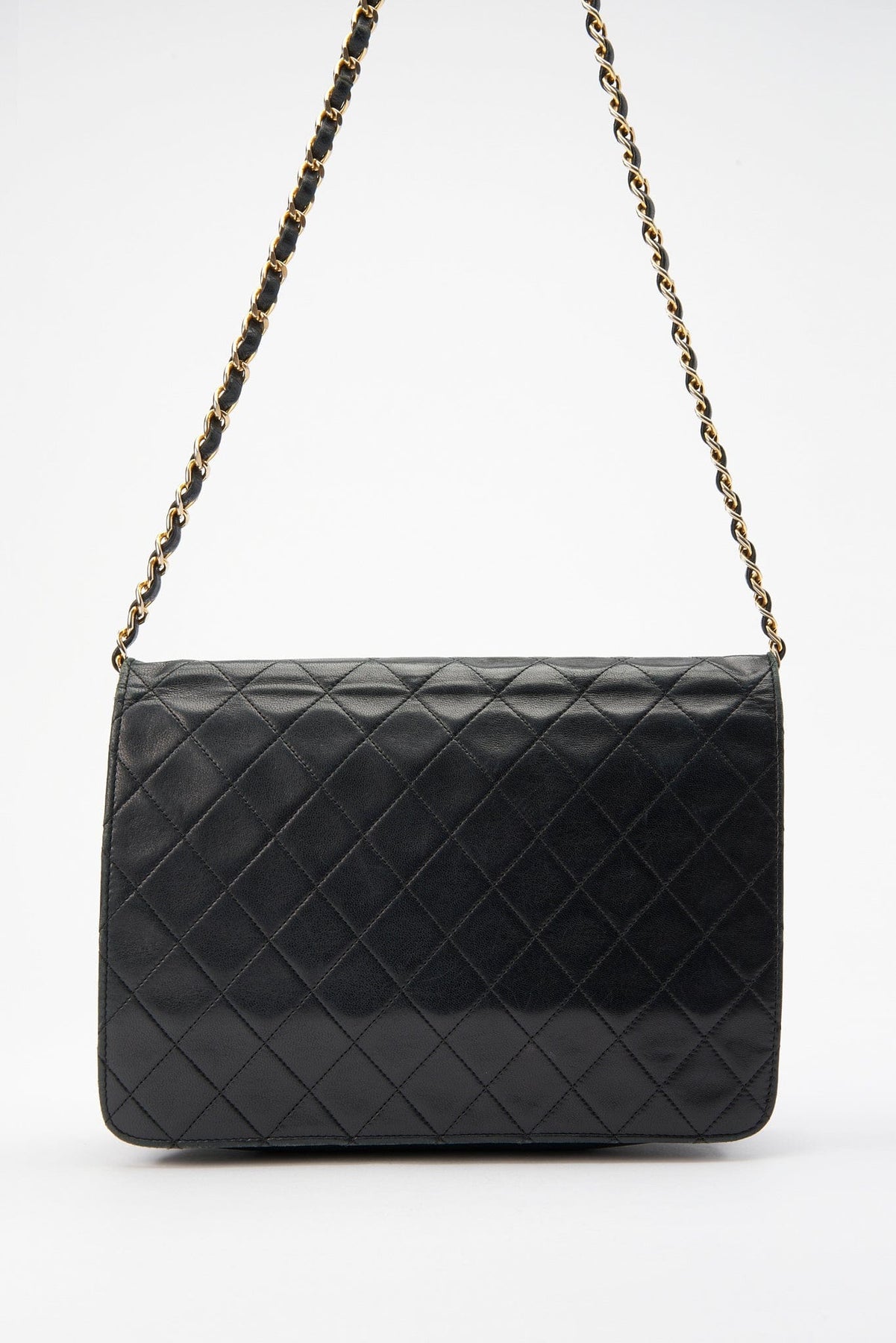 Regular price $2,020.00 Sale price $410.00 Save $1,610.00This vintage Classic Chanel Single Flap bag is crafted from black quilted lambskin leather with gold hardware and a leather-trimmed chain shoulder strap.
