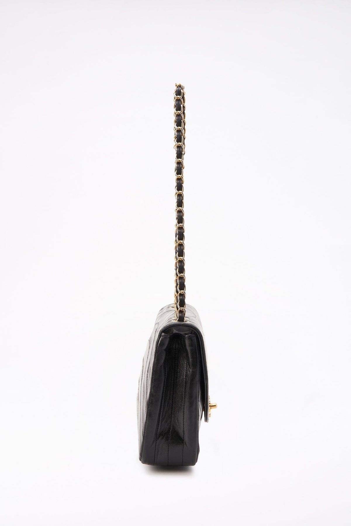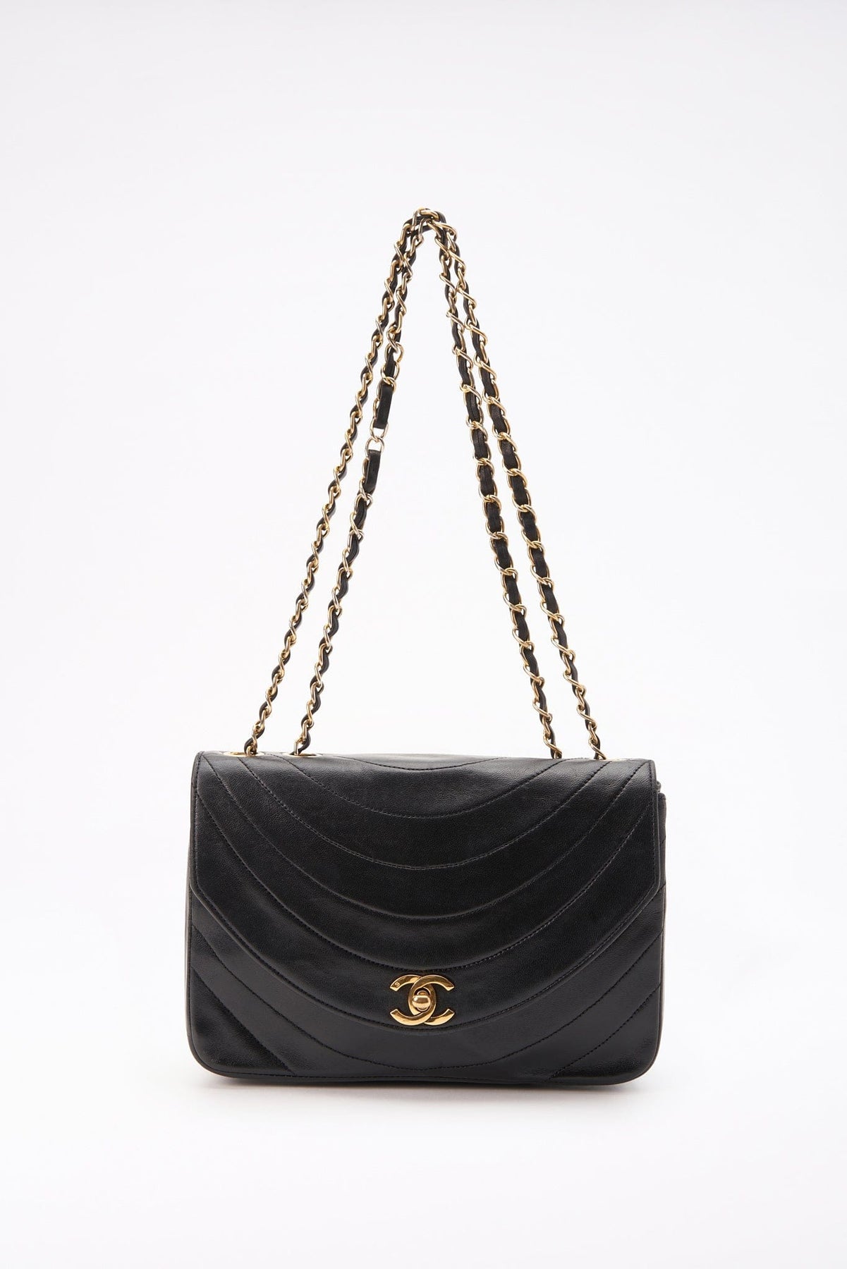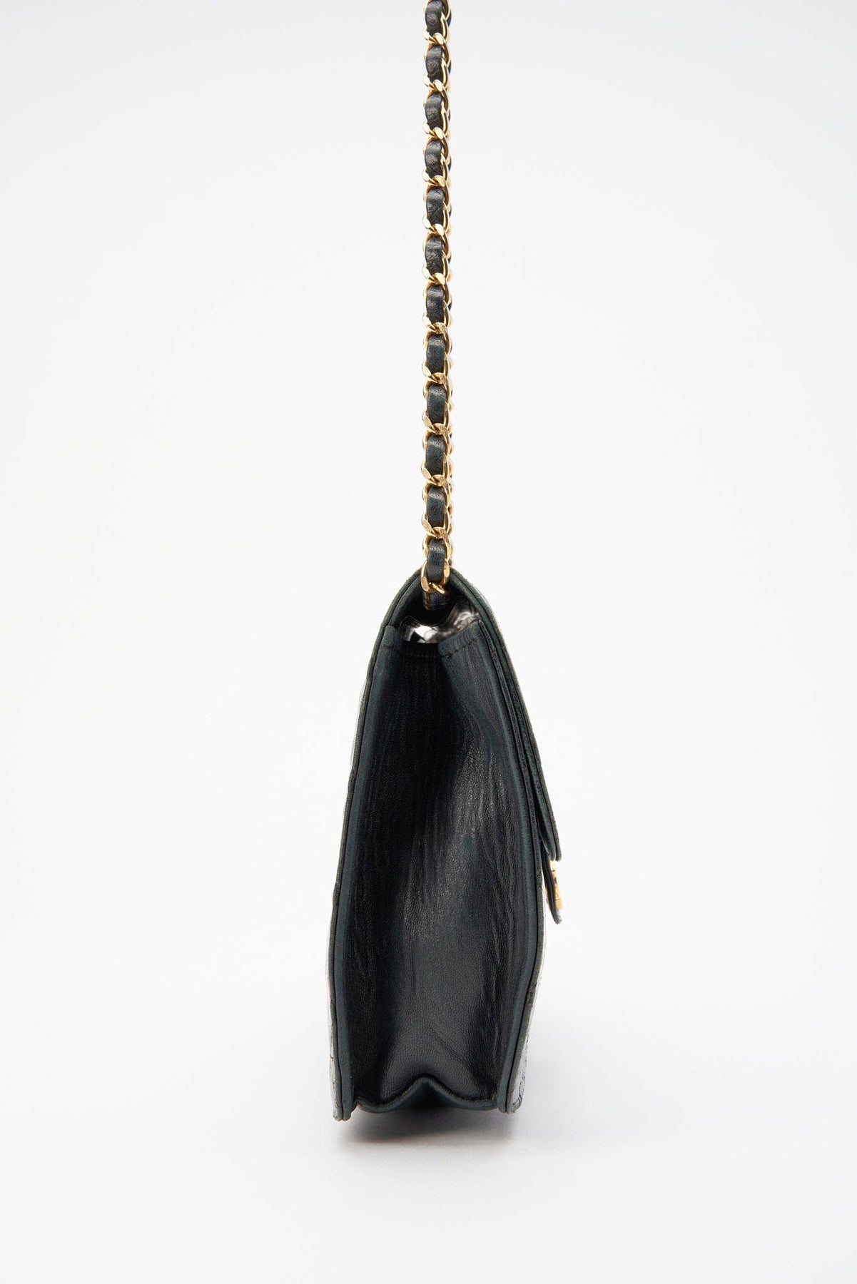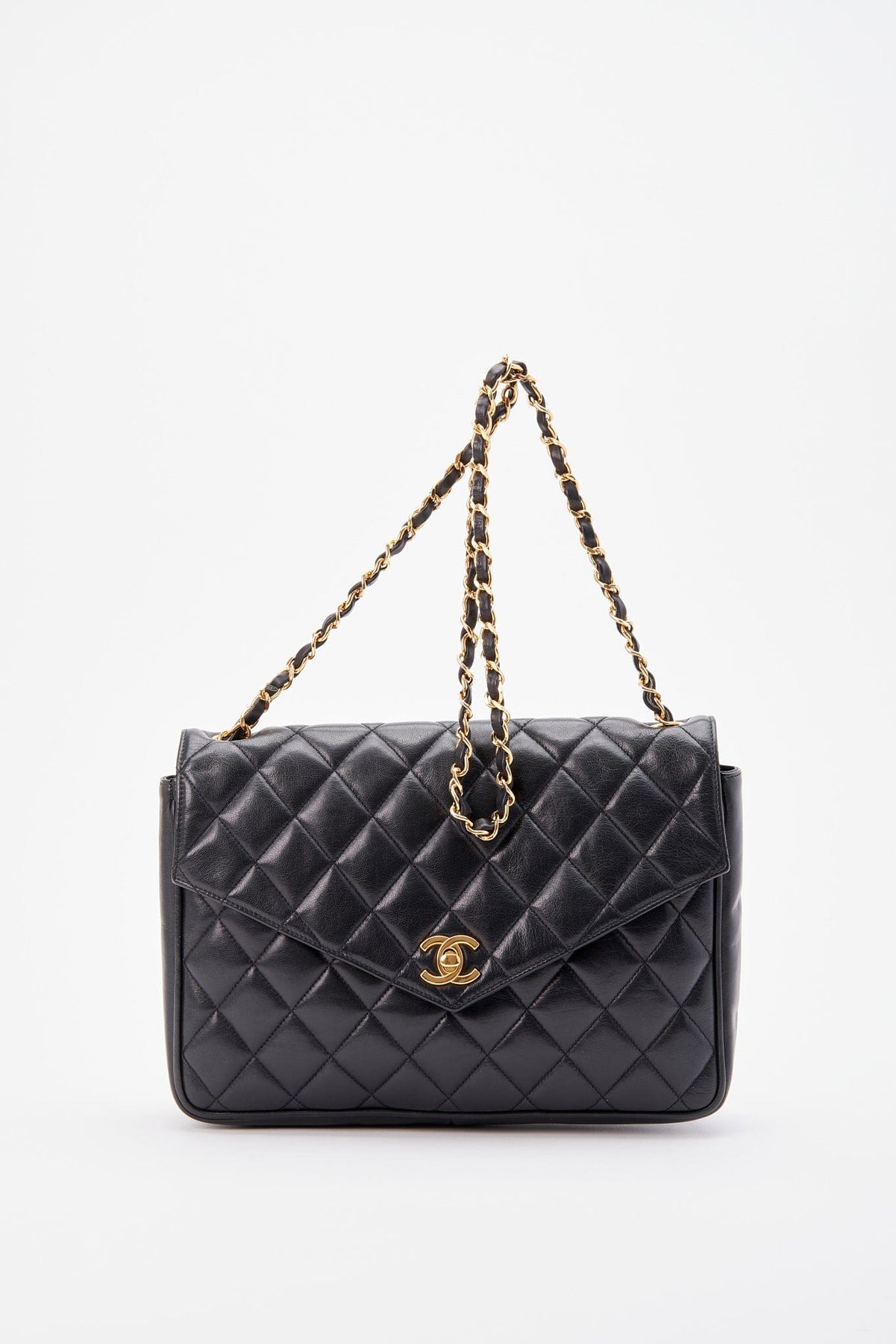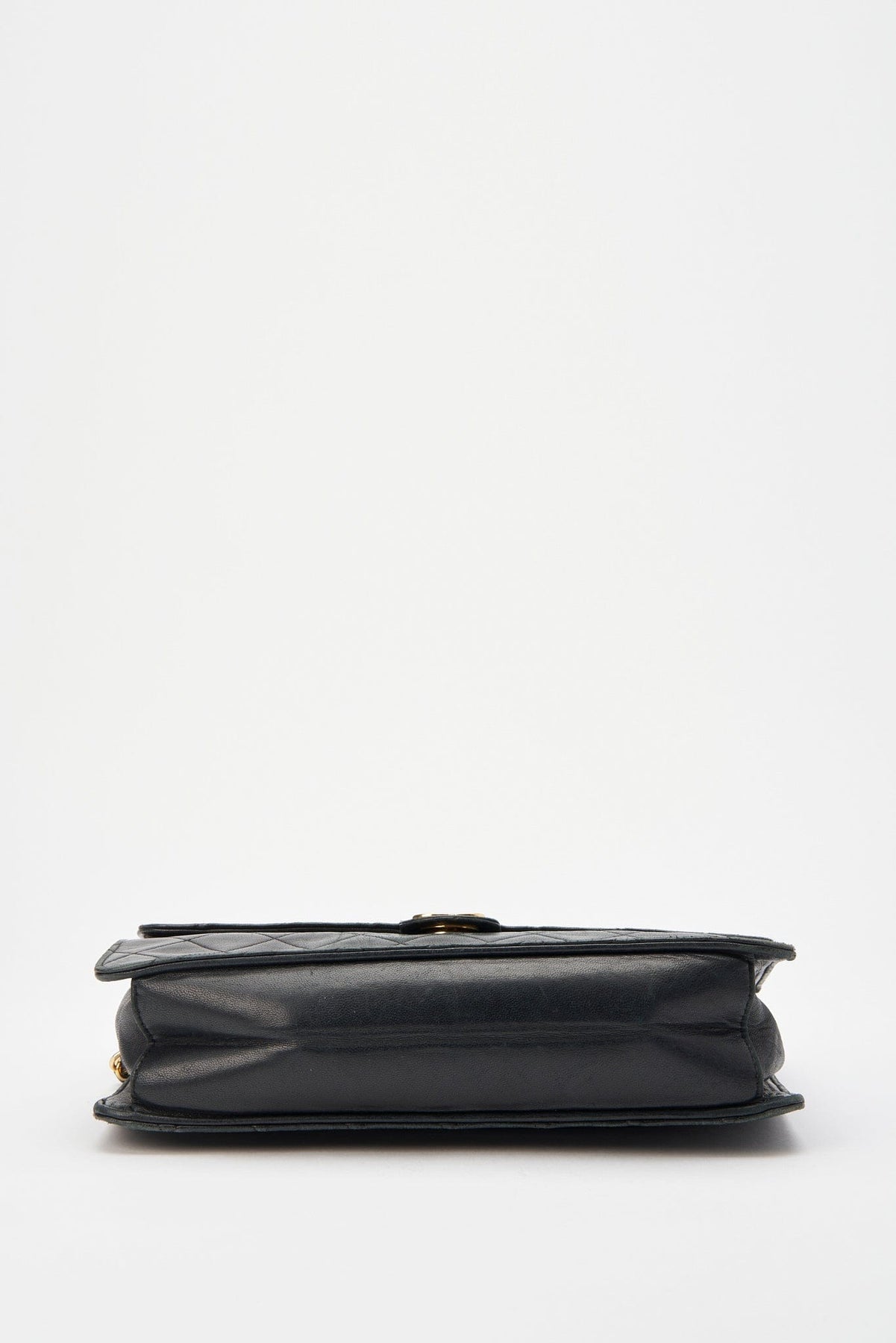 Regular price $2,020.00 Sale price $410.00 Save $1,610.00This vintage Classic Chanel Single Flap bag is crafted from black quilted lambskin leather with gold hardware and a leather-trimmed chain shoulder strap.