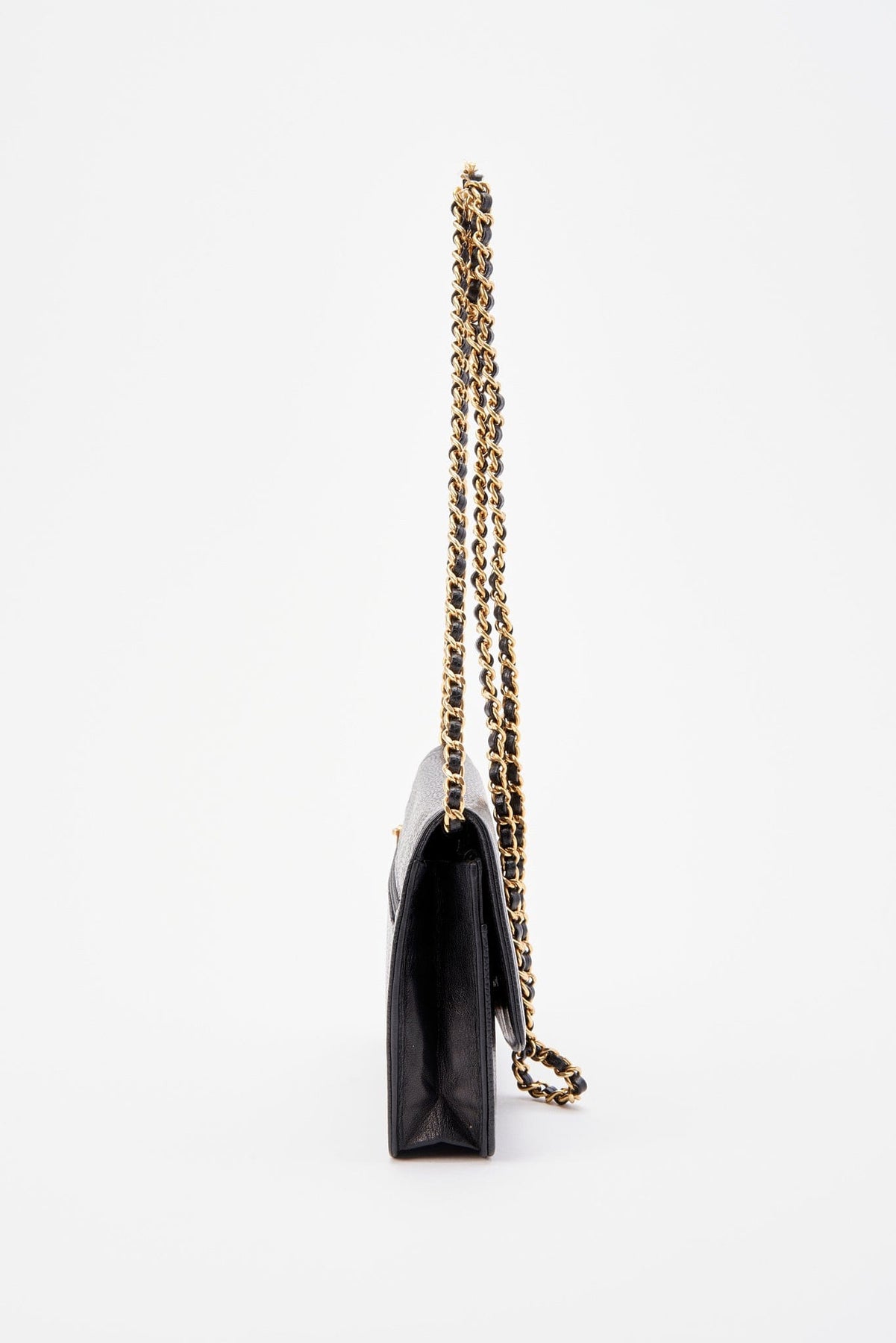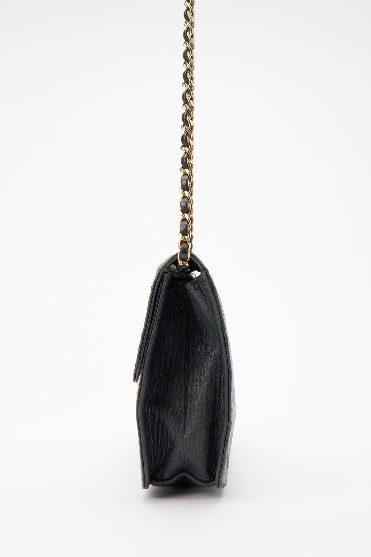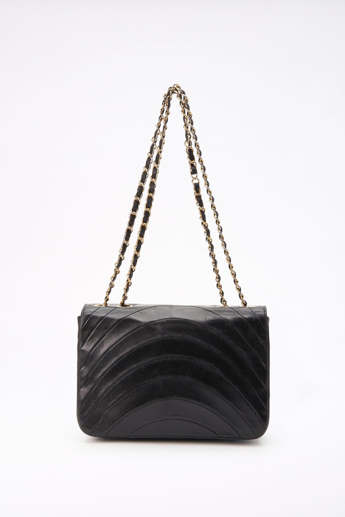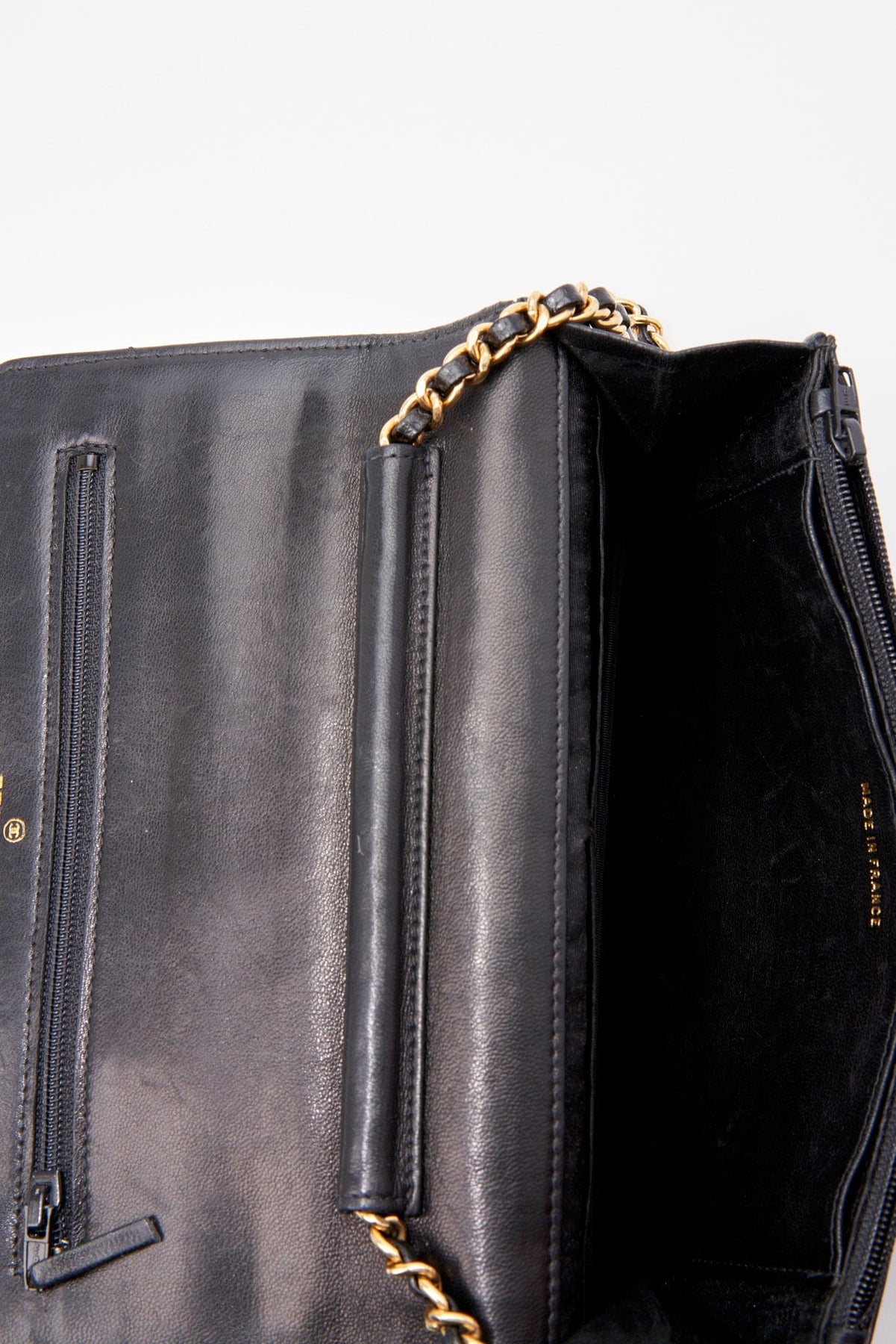 Regular price $2,020.00 Sale price $410.00 Save $1,610.00This vintage Classic Chanel Single Flap bag is crafted from black quilted lambskin leather with gold hardware and a leather-trimmed chain shoulder strap.