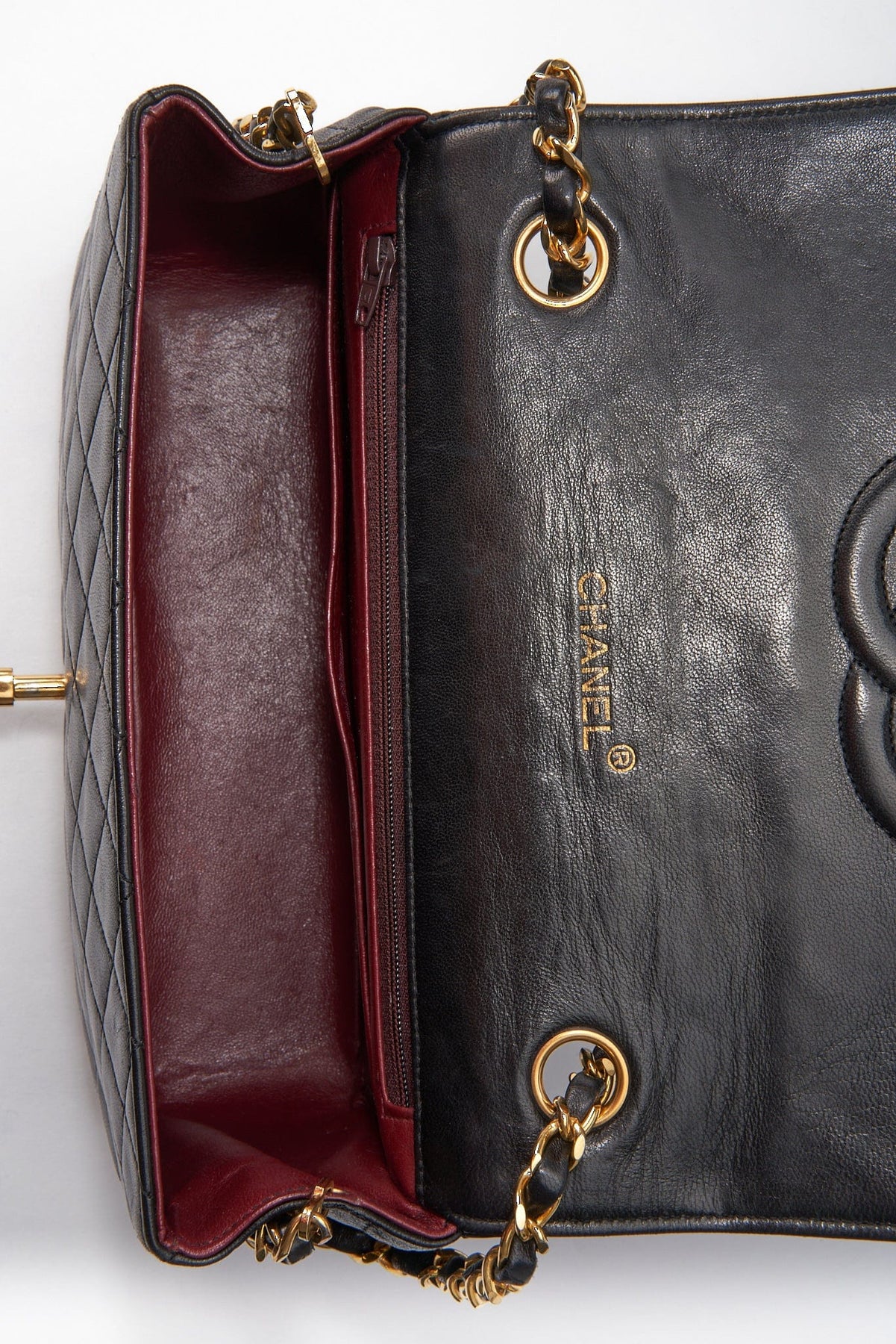 Regular price $2,040.00 Sale price $430.00 Save $1,610.00This vintage Classic Chanel Single Flap bag is crafted from black quilted lambskin leather with 24k gold-plated hardware and a leather-trimmed chain shoulder strap. There is a zip and a slip pocket inside this bag plus the interior is lined with maroon leather.