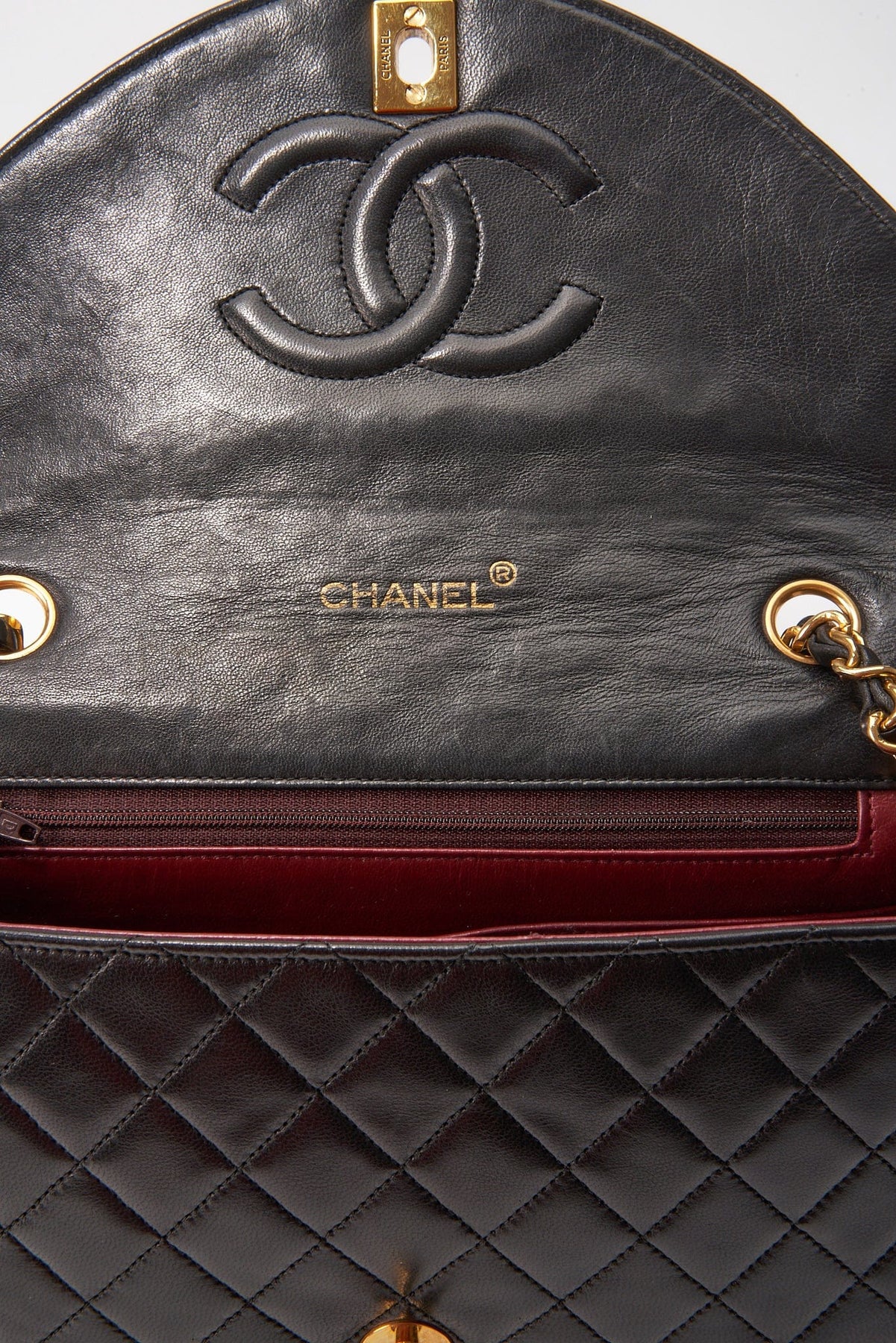 Regular price $2,150.00 Sale price $420.00 Save $1,730.00This vintage Classic Chanel Single Flap bag is crafted from black diamond quilted lambskin leather with 24k gold-plated hardware and a single leather-trimmed chain-link shoulder strap. There is a zip and a slip pocket inside this bag plus the interior is lined with maroon leather.