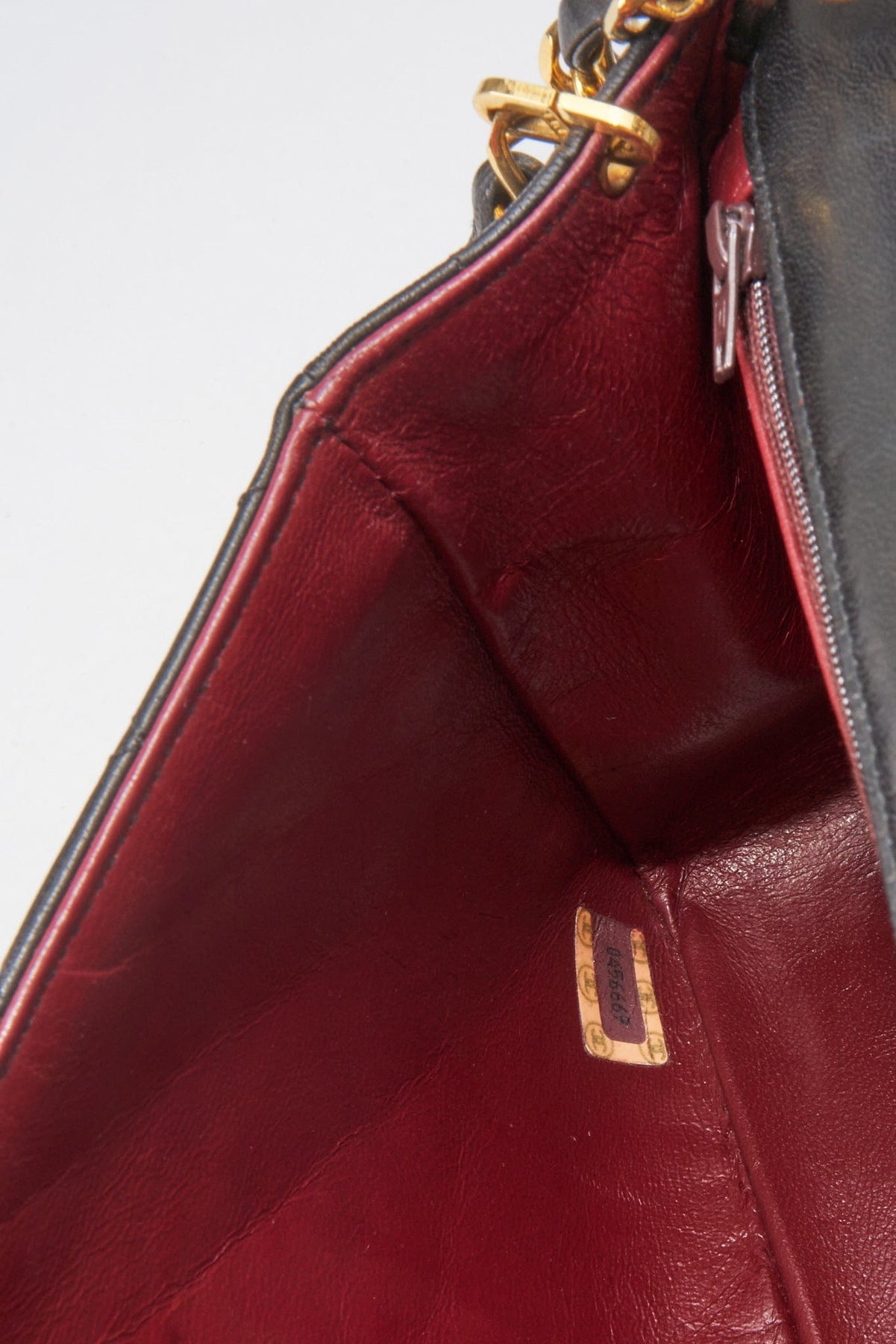 Regular price $2,040.00 Sale price $410.00 Save $1,630.00This vintage Classic Chanel Single Flap bag is crafted from black diamond quilted lambskin leather with 24k gold-plated hardware and a single leather-trimmed chain-link shoulder strap. There is slip pocket inside this bag plus the interior is lined with maroon leather.