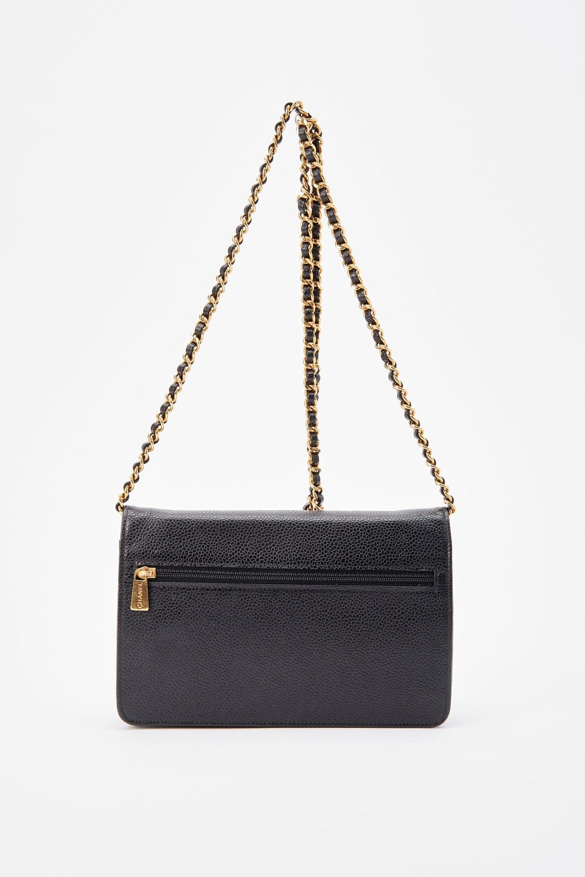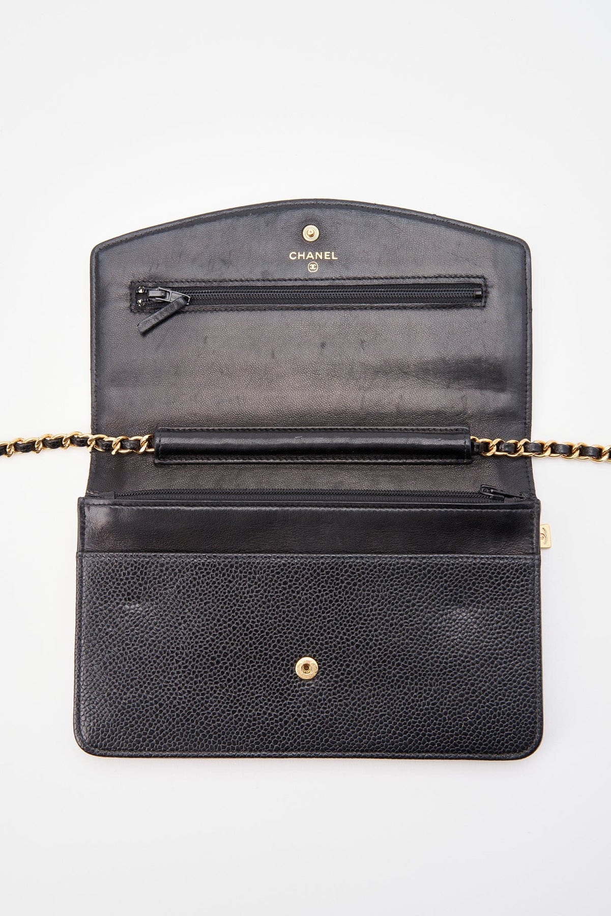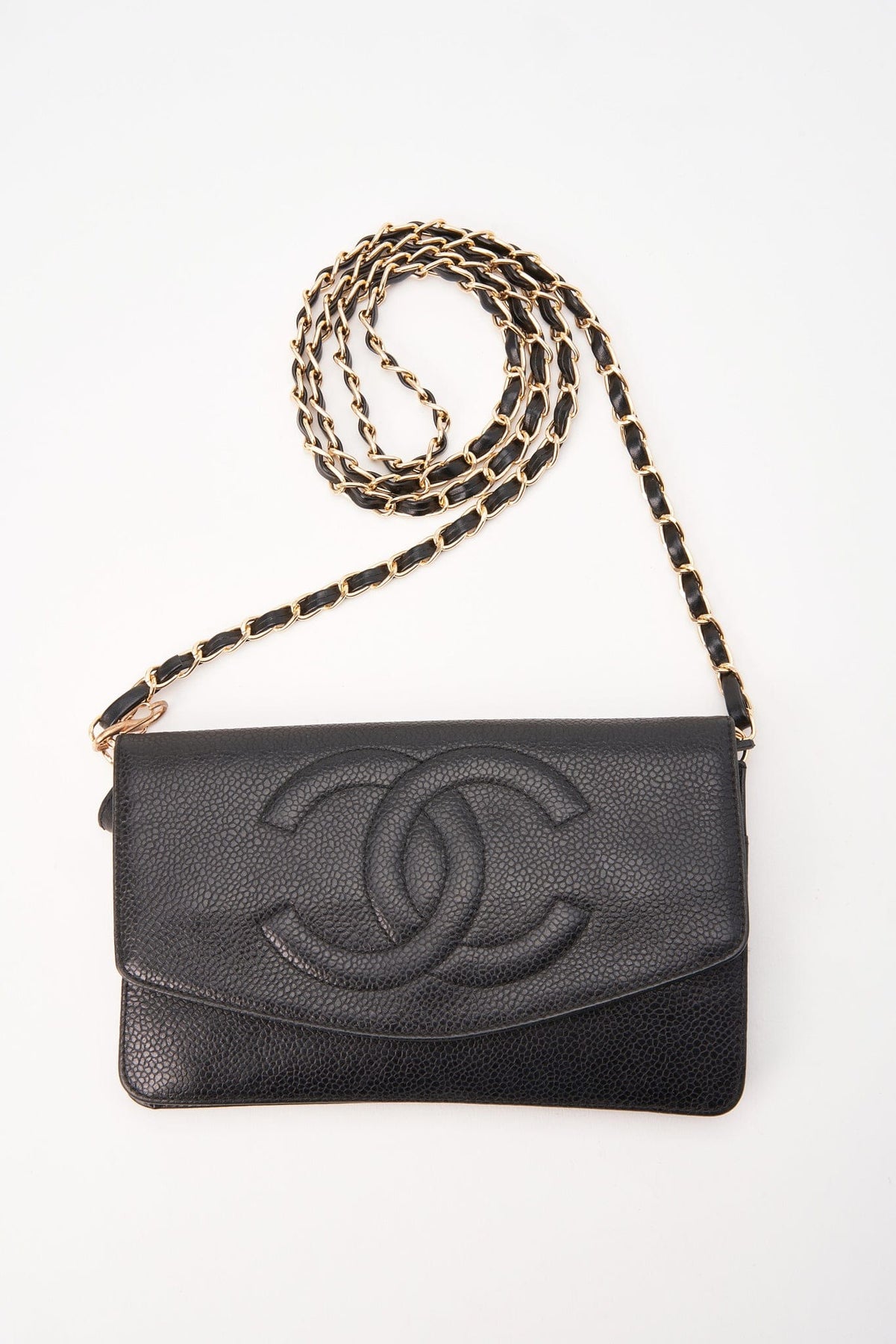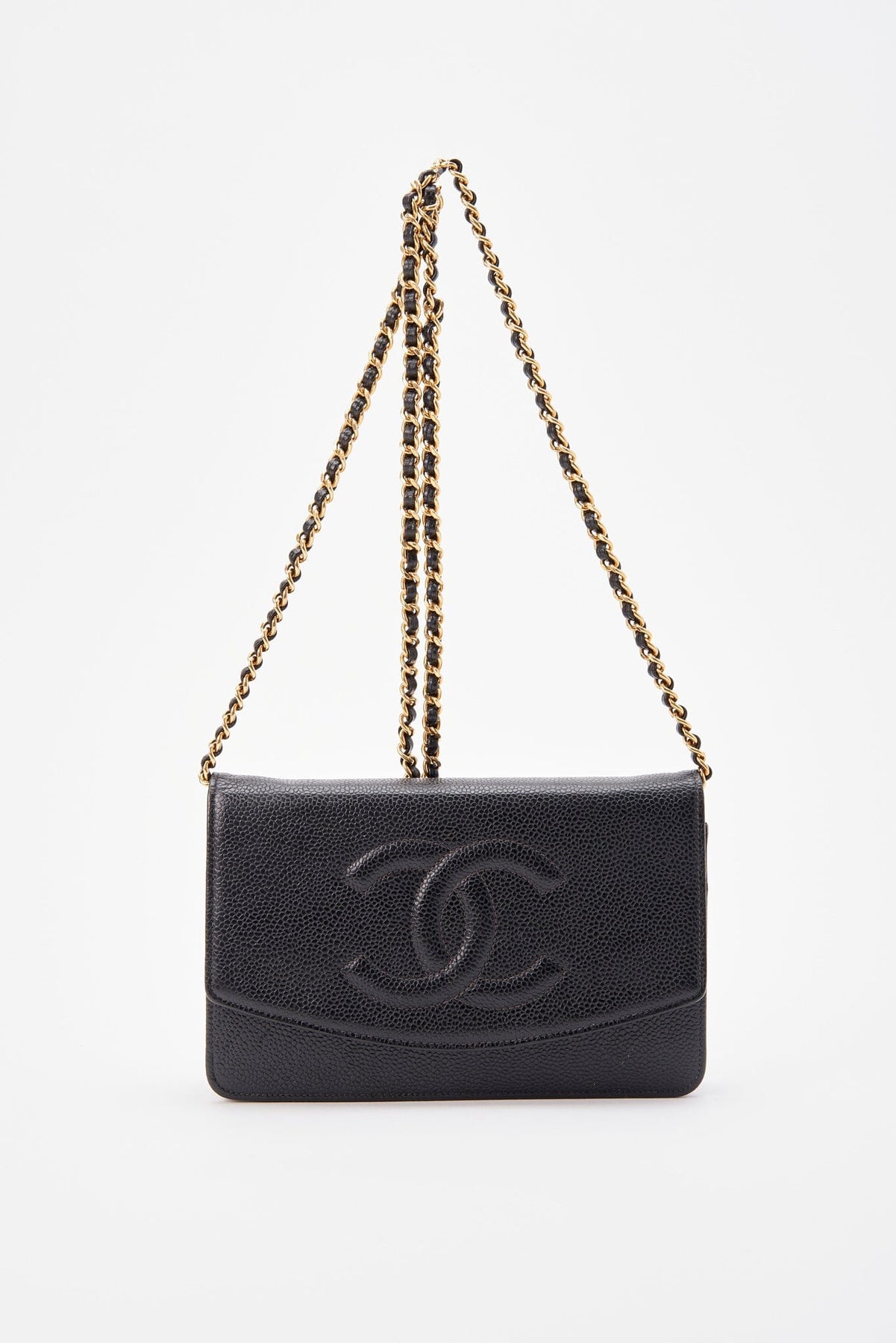 Regular price $2,190.00 Sale price $420.00 Save $1,770.00This Chanel wallet on chain, WOC, is crafted from black caviar leather with gold hardware and a single leather-trimmed chain-link shoulder strap.