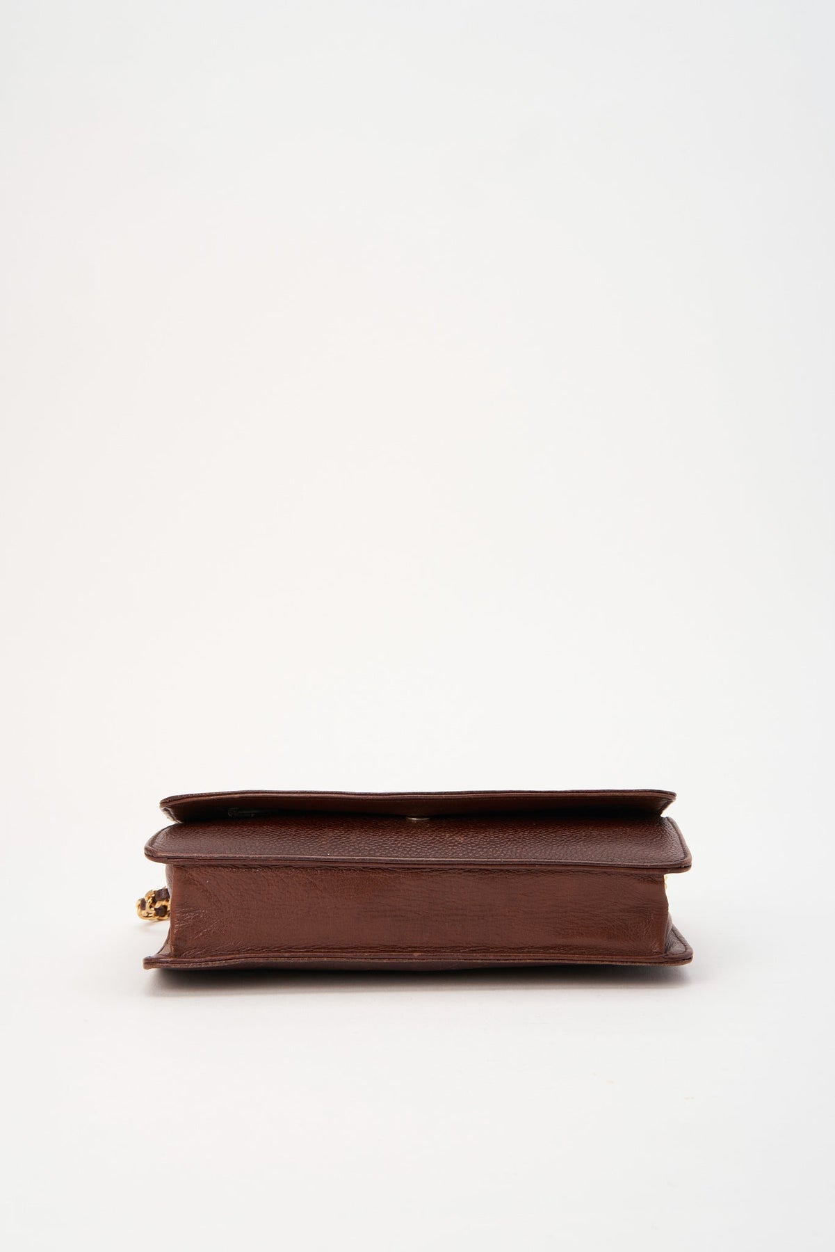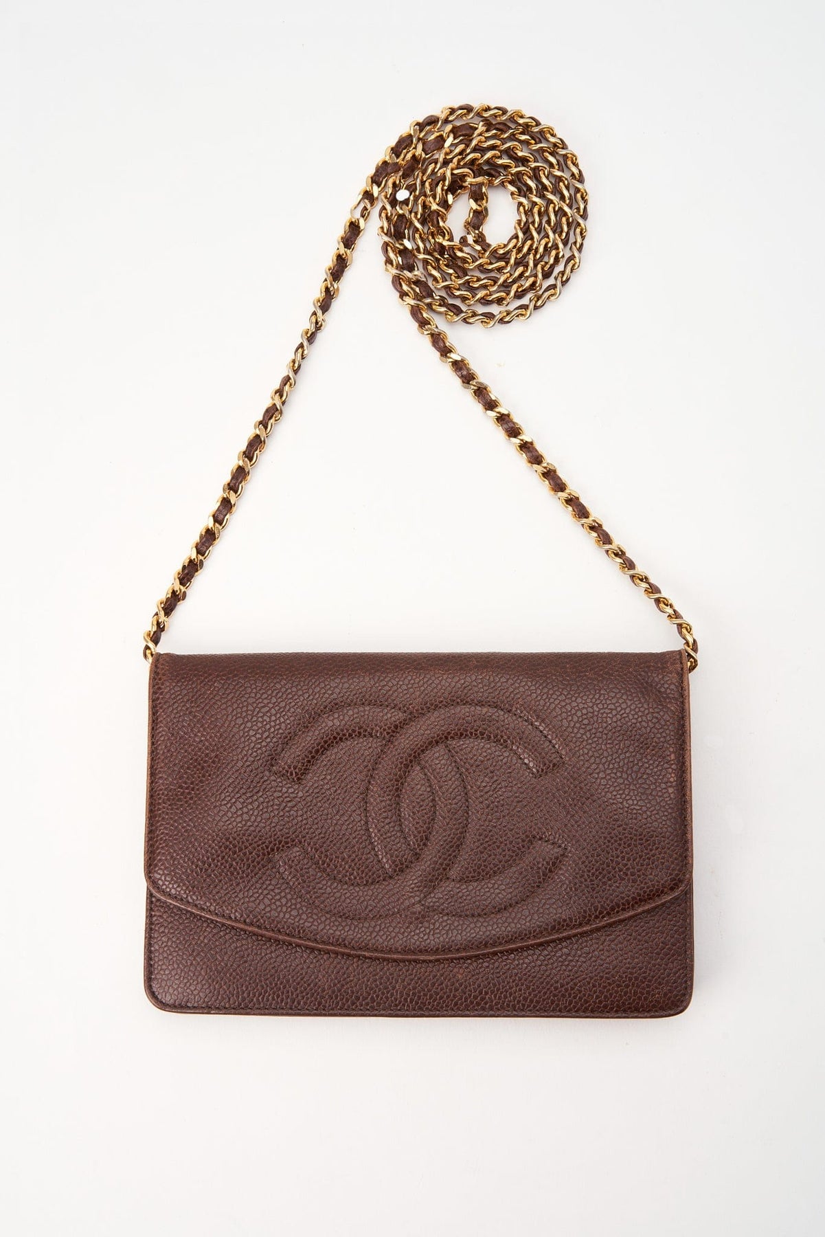 Regular price $2,050.00 Sale price $430.00 Save $1,620.00This Chanel wallet on chain, WOC, is crafted from brown caviar leather with gold hardware and a single leather-trimmed chain-link shoulder strap.