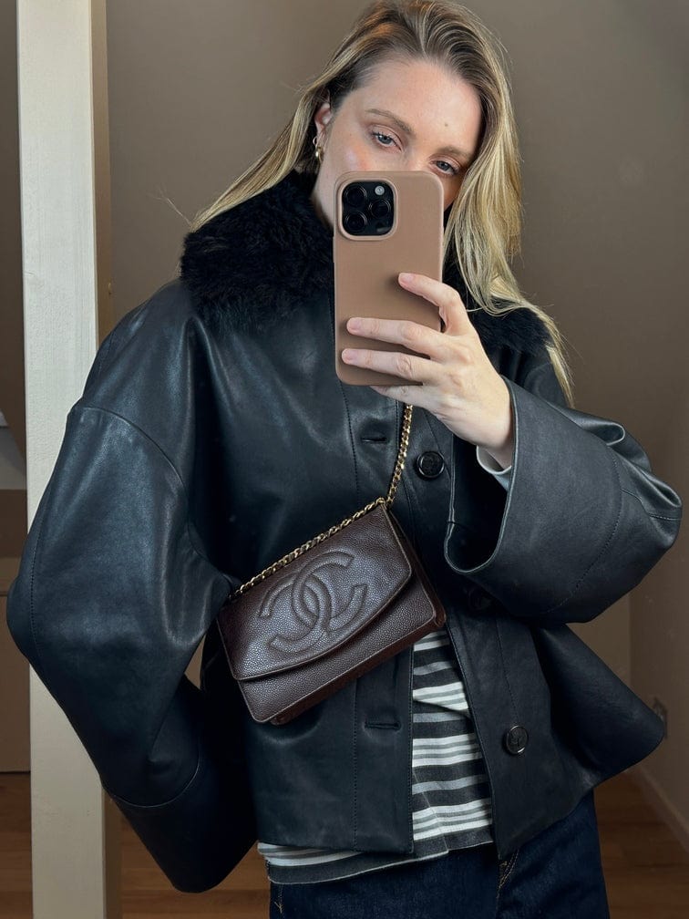 Inside the bag is lined with leather and has a zipped interior pocket for valuables, with a CC gold charm.
