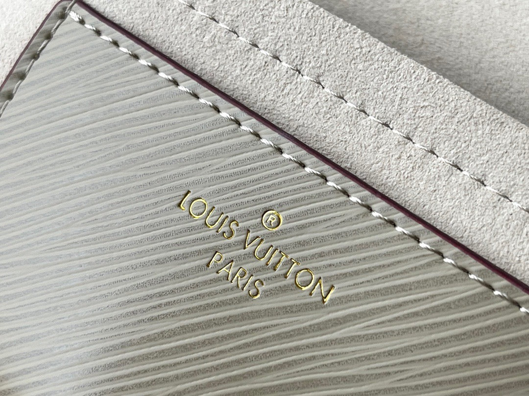 Condition: Vintage; Excellent - This bag retains its shape structure. There is no plastic on the hardware. The closure and strap hardware has some light scratching. The exterior leather shows noticeable wear with press markings throughout to the leather from the strap, discoloration and rubbing to the leather around the corners, bottom and base of bag. The shoulder strap leather also has some rubbing/scuffing. The interior leather has creasing and wrinkling throughout and some noticeable glue residue around the interior edging. The interior has a faint odor. The date stamp sticker is legible and still intact.