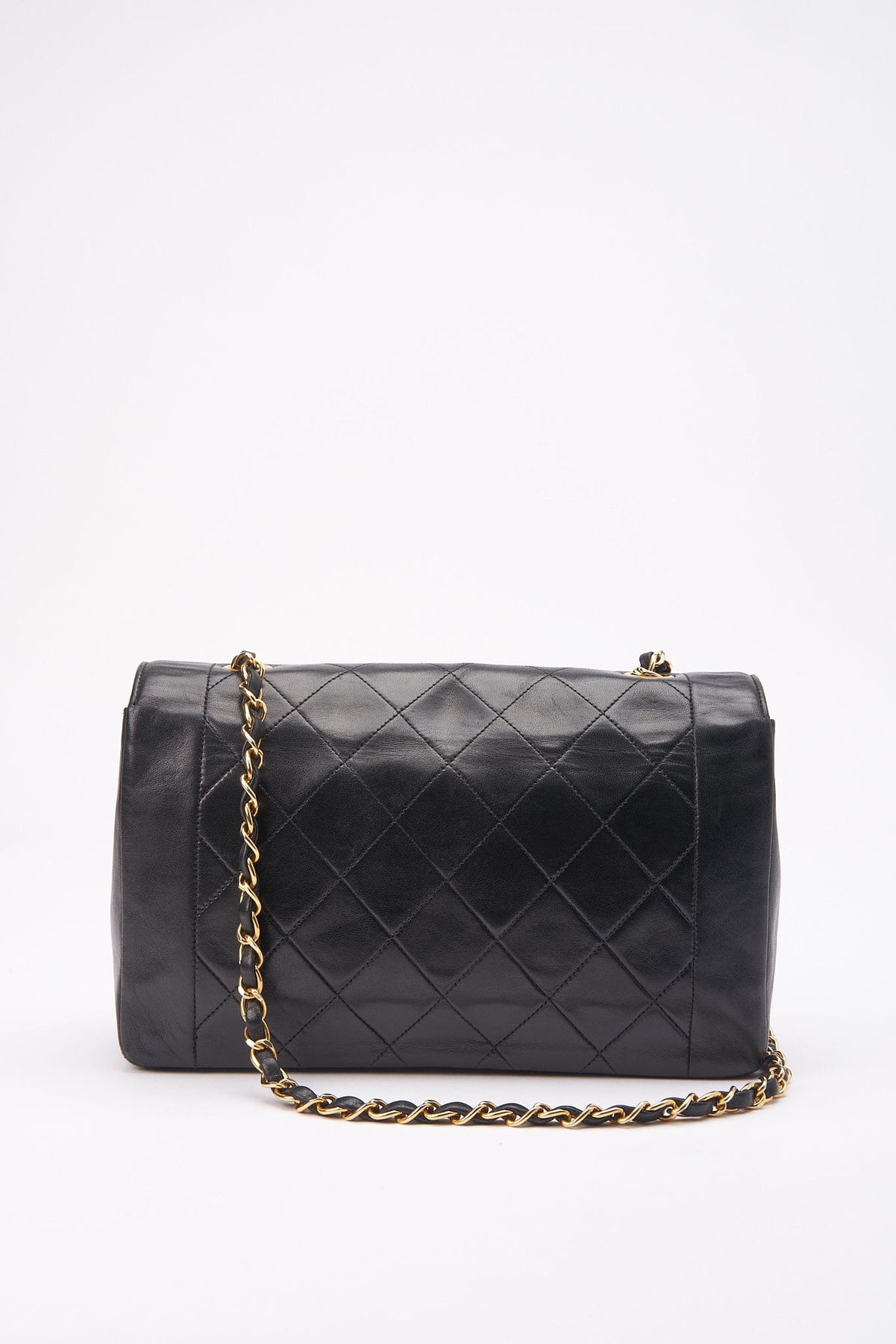 This vintage Chanel Diana Single Flap bag is crafted with black diamond quilted lambskin leather with 24k gold-plated hardware and a single leather-trimmed chain-link shoulder strap. There is a zip and a slip pocket inside this bag plus the interior is lined with maroon leather.