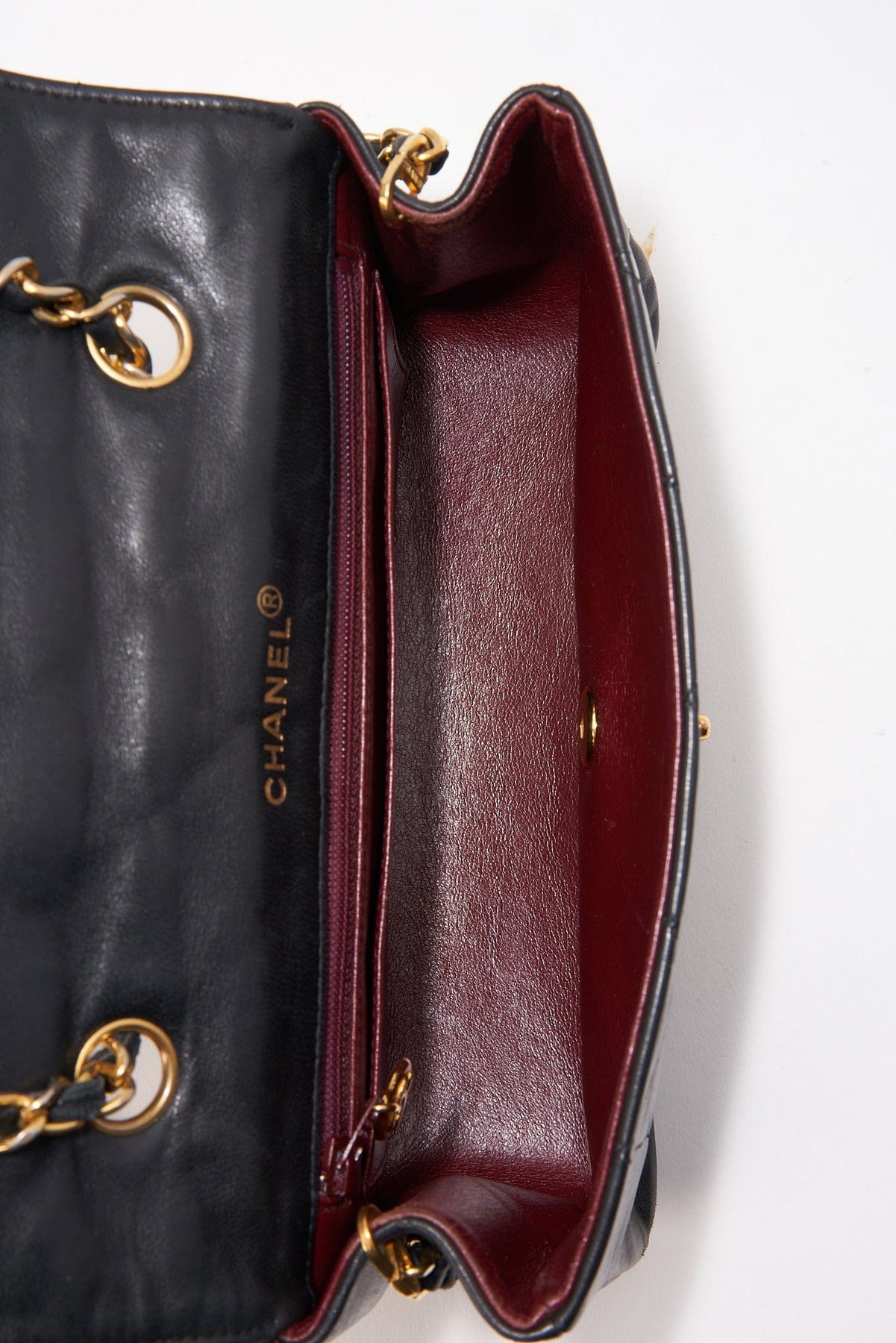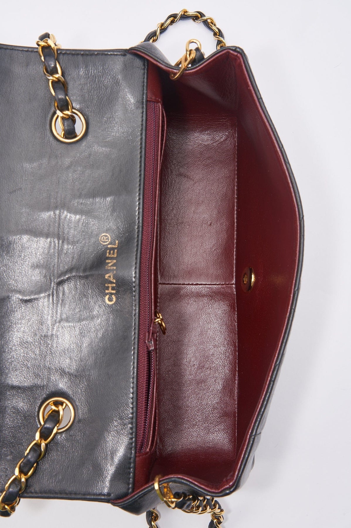 Regular price $1,910.00 Sale price $430.00 Save $1,480.00This vintage Classic Chanel Small Flap bag is crafted from black diamond quilted lambskin leather with 24k gold-plated hardware and a single convertible leather-trimmed chain-link shoulder strap. There is a single exterior patch pocket on the back, a single zip pocket under the front flap and three interior compartments. Inside the bag is lined with the classic maroon leather.