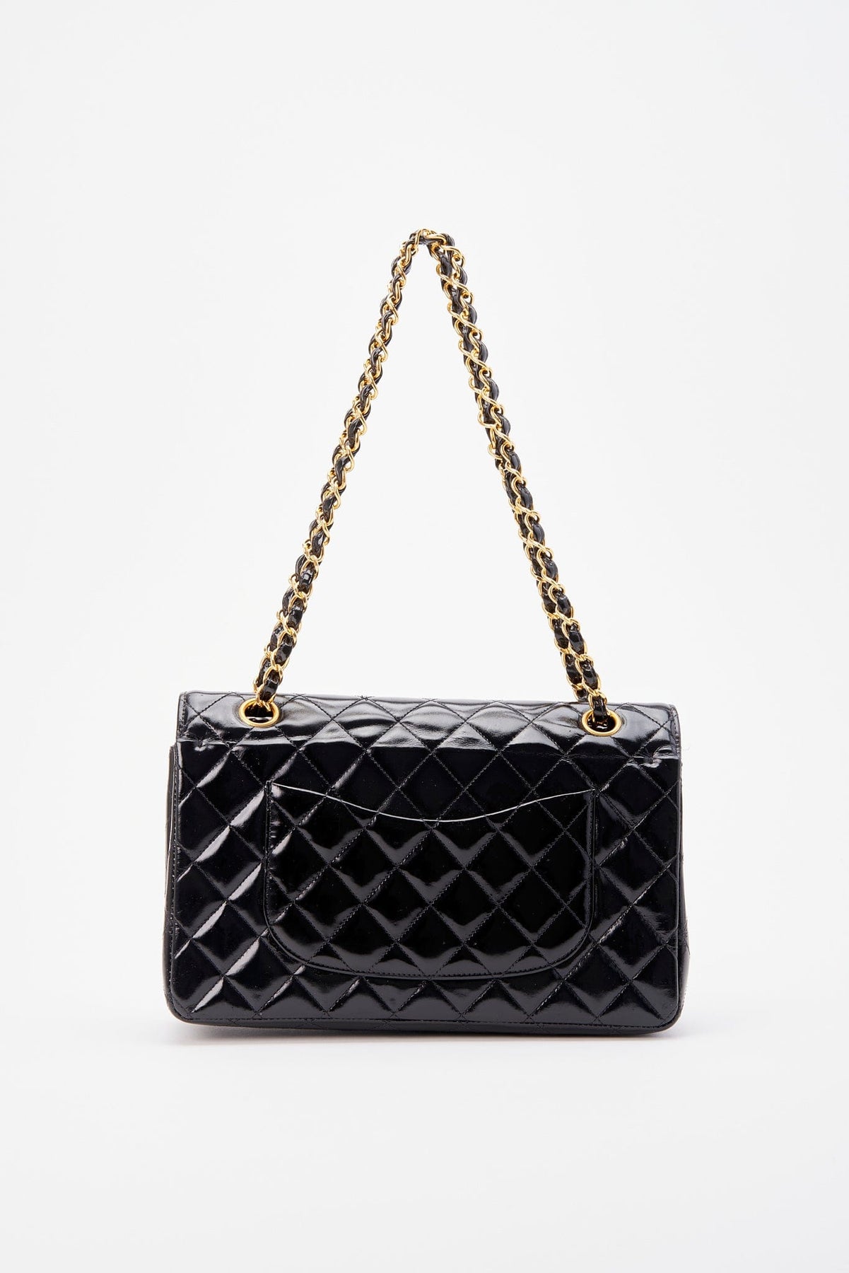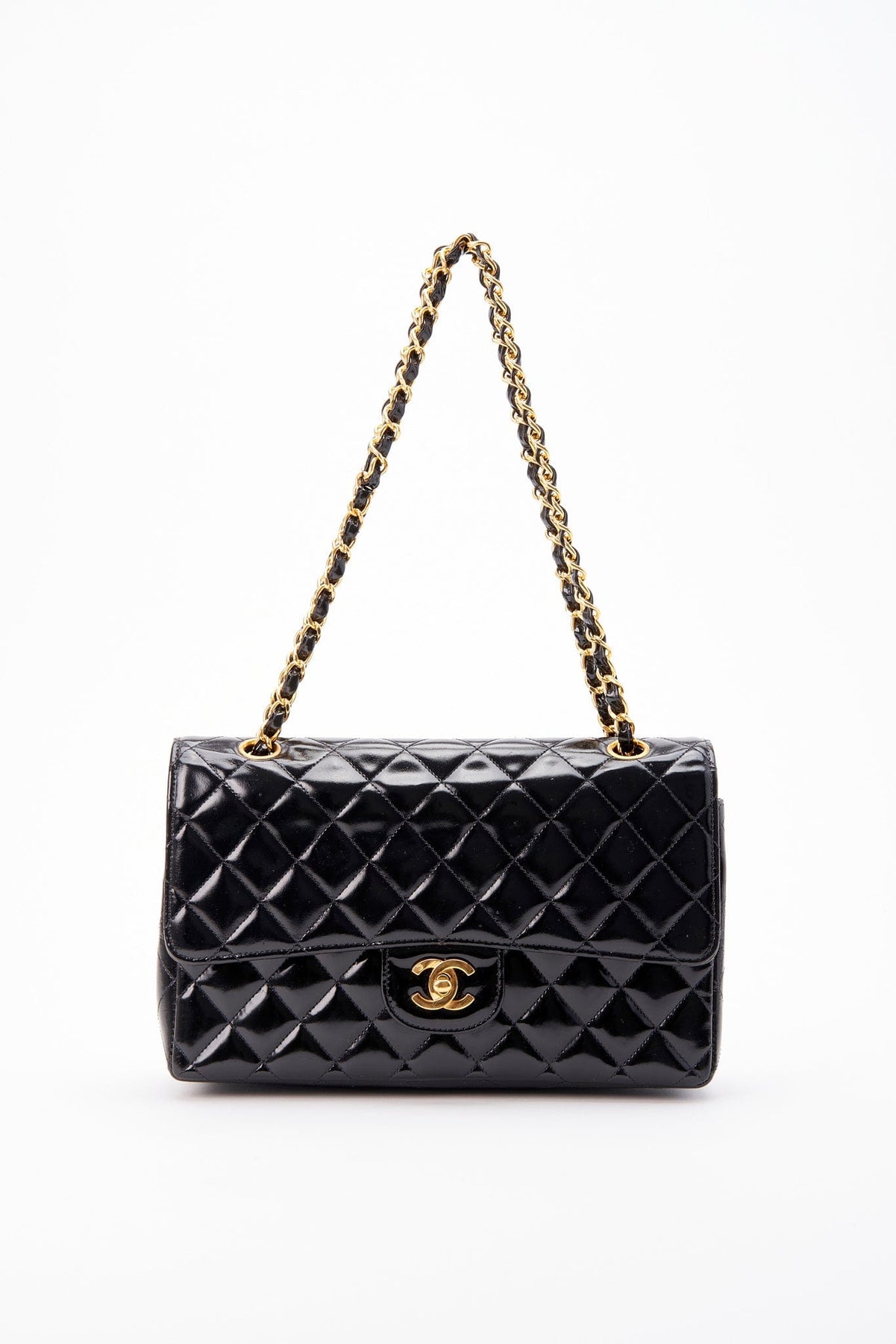 Regular price $2,220.00 Sale price $410.00 Save $1,810.00This vintage Classic Chanel Medium Double Flap bag is crafted from black diamond quilted patent leather with 24k gold-plated hardware and a single convertible leather-trimmed chain-link shoulder strap. There is a single exterior patch pocket on the back, a single zip pocket under the front flap and three interior compartments. Inside the bag is lined with a black leather.