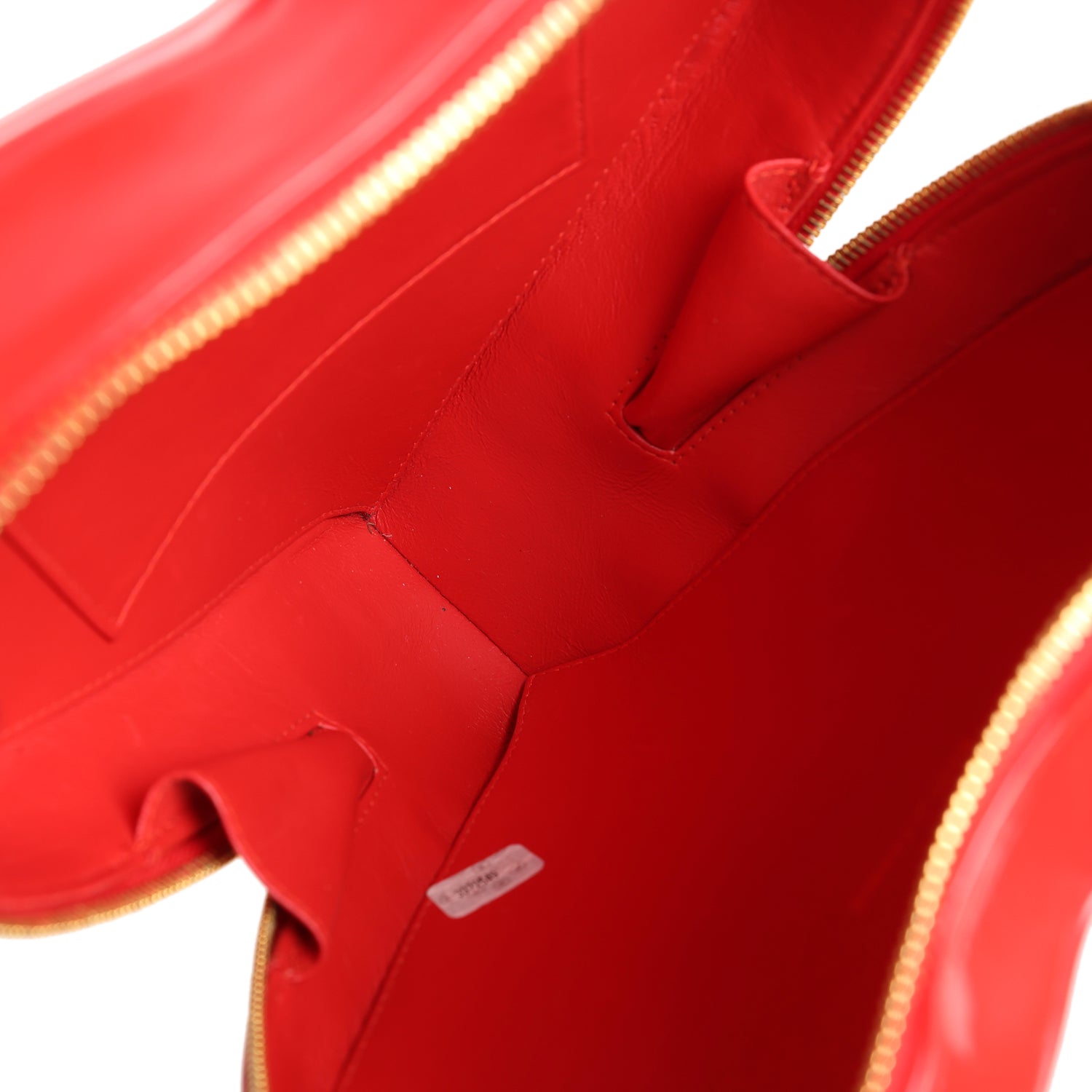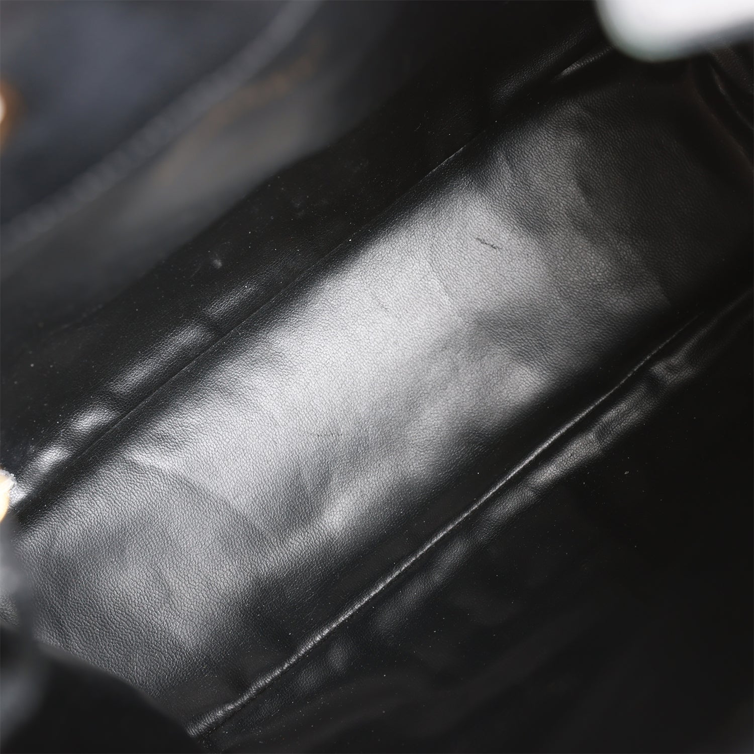 Condition: Vintage; Excellent to Mint - This bag retains its shape. The exterior leather has some minor transfer marks on the patent. The patent leather on the top handle has wear. No plastic on the hardware but no major wear to the hardware. The interior is clean overall but has a few small marks towards bottom of bag.