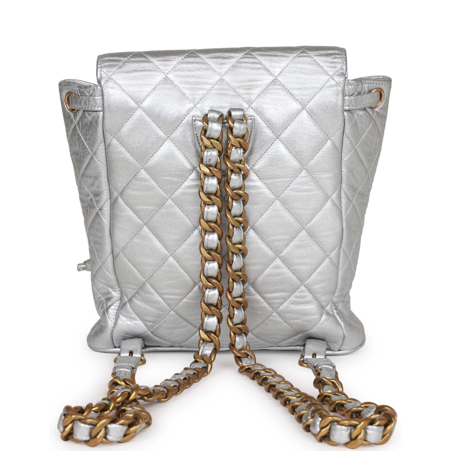 Regular price $1,740.00 Sale price $450.00 Save $1,290.00This Vintage Duma backpack is in Silver metallic lambskin with gold hardware, signature CC interlocking closure with front flap, an additional drawstring closure, exterior front pocket, two shoulder straps for backpack use, and gold metal and silver leather chain.