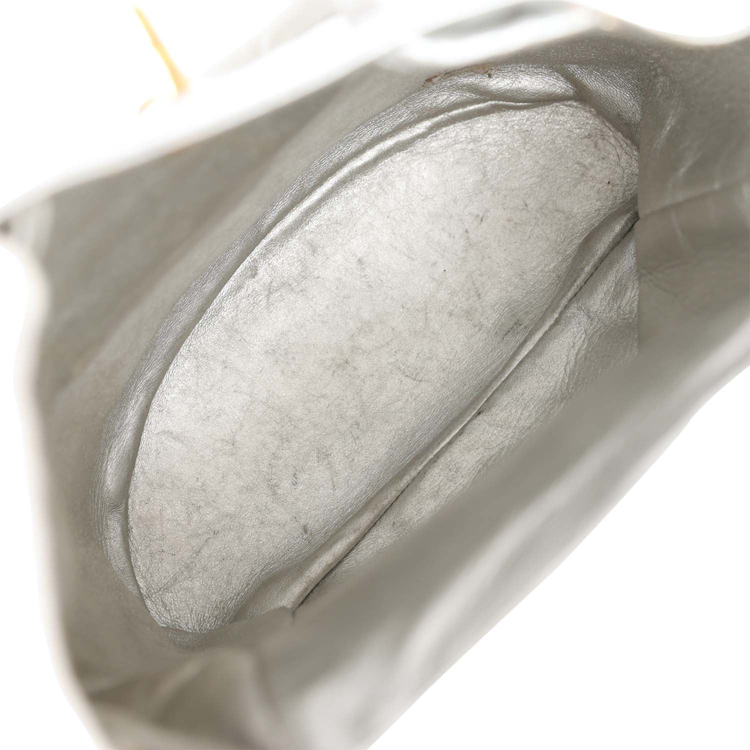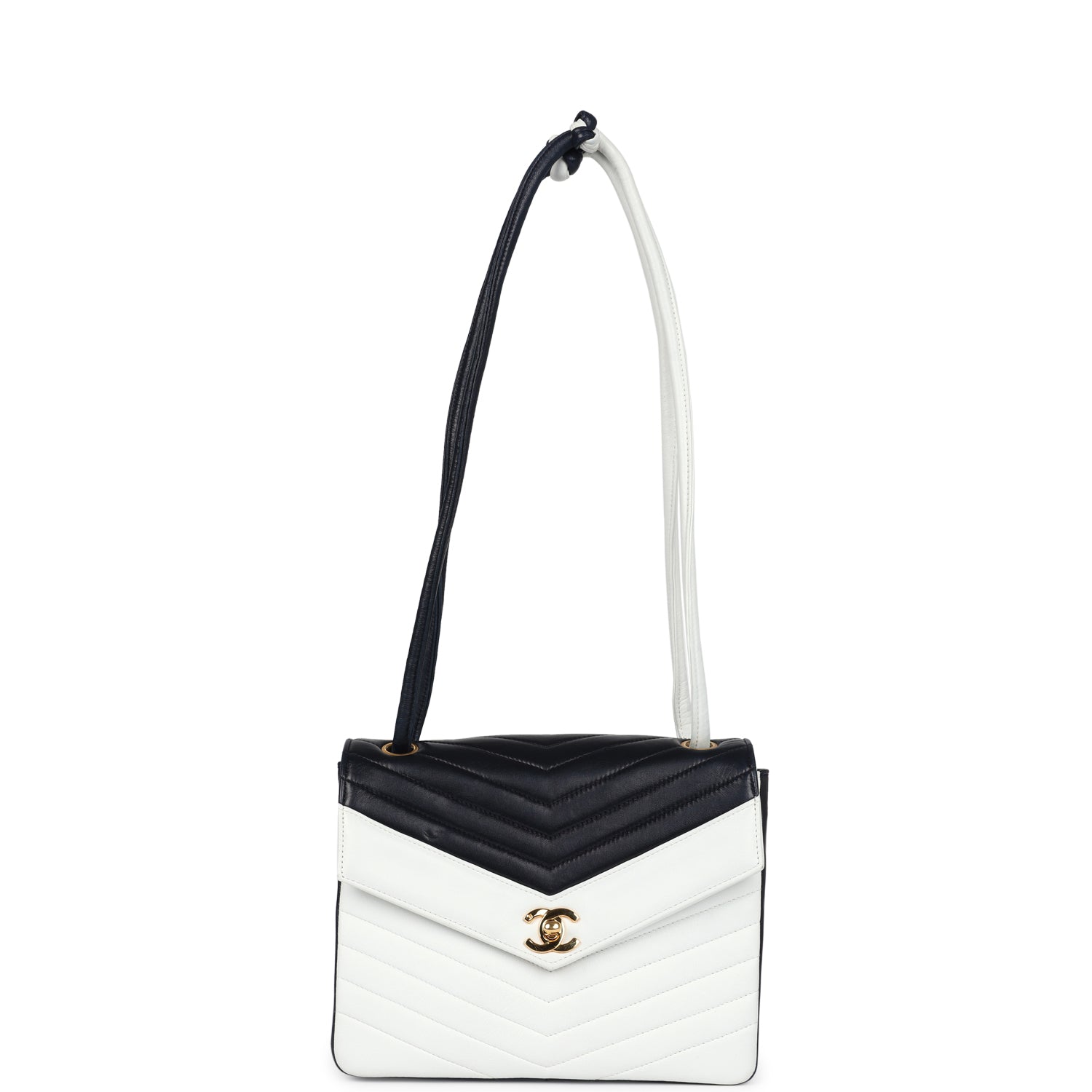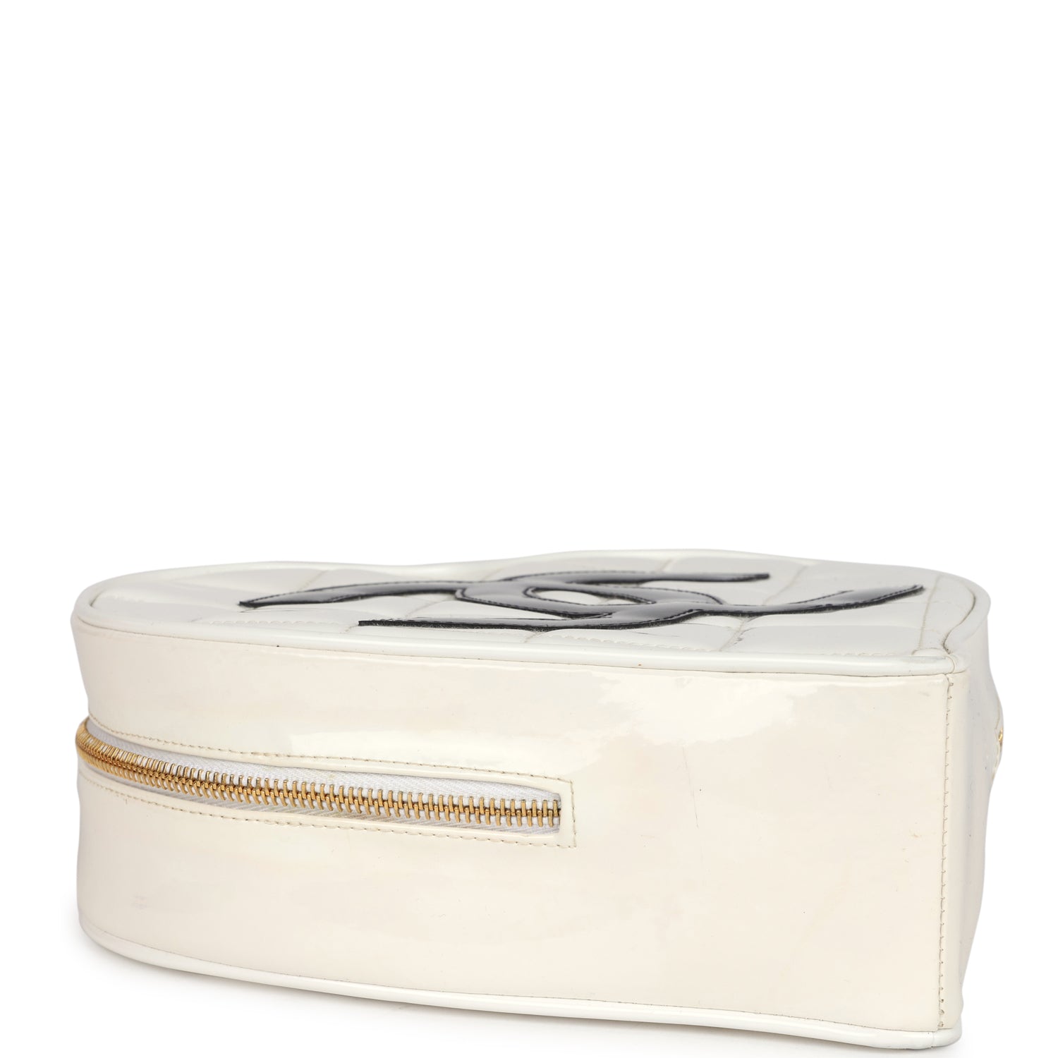 Regular price $1,640.00 Sale price $450.00 Save $1,190.00This vintage Heart Vanity Bag is in white and black quilted patent leather with antique gold hardware, featuring a black patent leather stitched CC logo on front, zipper closure, and an interwoven white patent leather and antique gold top handle.