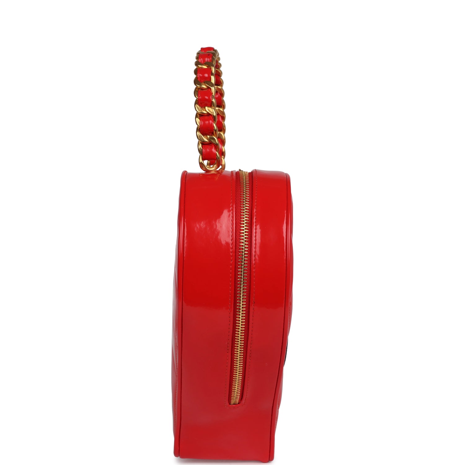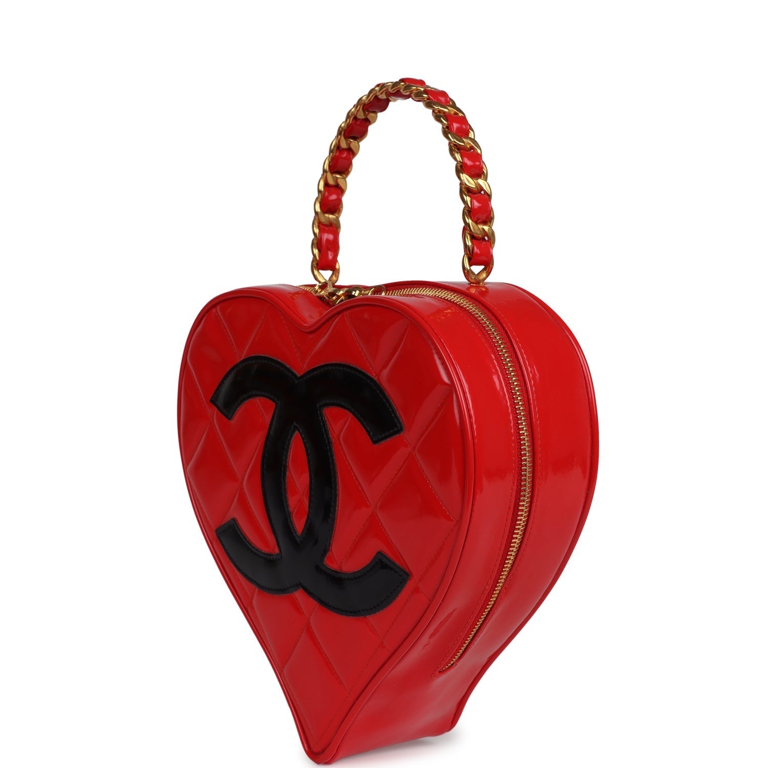 Regular price $1,930.00 Sale price $450.00 Save $1,480.00This vintage Heart Vanity case is in red and black quilted patent leather with antique gold hardware, featuring a black patent leather stitched CC logo on front, zipper closure, and an interwoven Red patent leather and antique gold top handle.