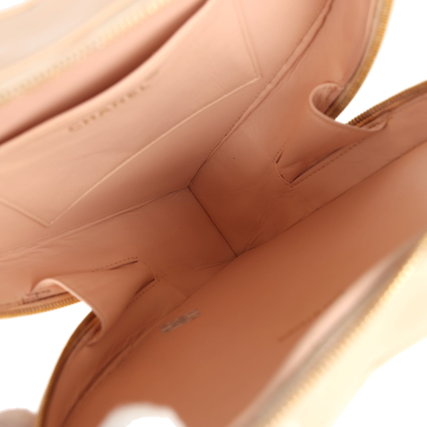 Regular price $2,210.00 Sale price $440.00 Save $1,770.00This vintage Heart Vanity Bag is in beige and black quilted patent leather with antique gold hardware, featuring a black patent leather stitched CC logo on front, zipper closure, and an interwoven white patent leather and antique gold top handle.