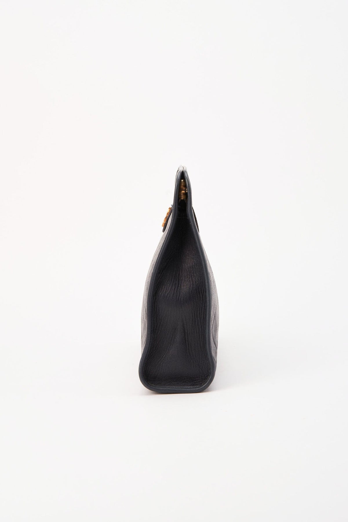 Regular price $2,090.00 Sale price $430.00 Save $1,660.00This beautiful vintage Chanel clutch bag is crafted from a very dark navy/almost black leather with 24K gold plated hardware. it has a metal insert into the top edge to enable to open and snap shut securely.
