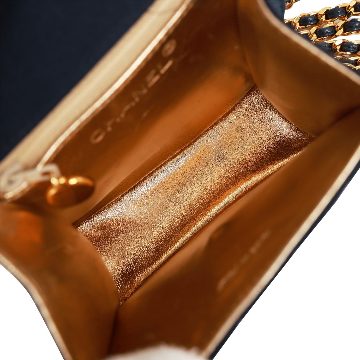 Regular price $2,000.00 Sale price $440.00 Save $1,560.00This vintage Mini Square flap bag is in black velvet fabric with gold hardware and has a front flap with signature CC turnlock closure, rear half moon pocket, single interwoven fabric and gold tone chain link shoulder/crossbody strap.