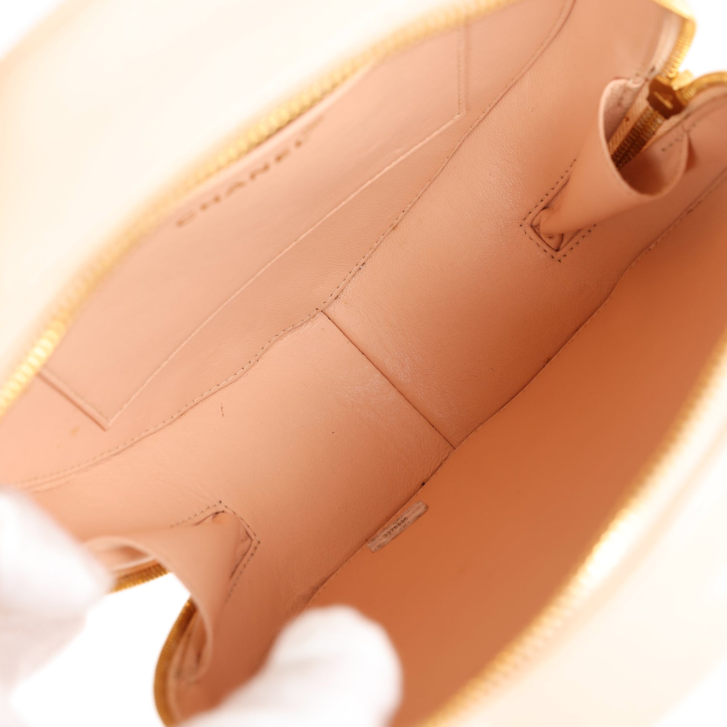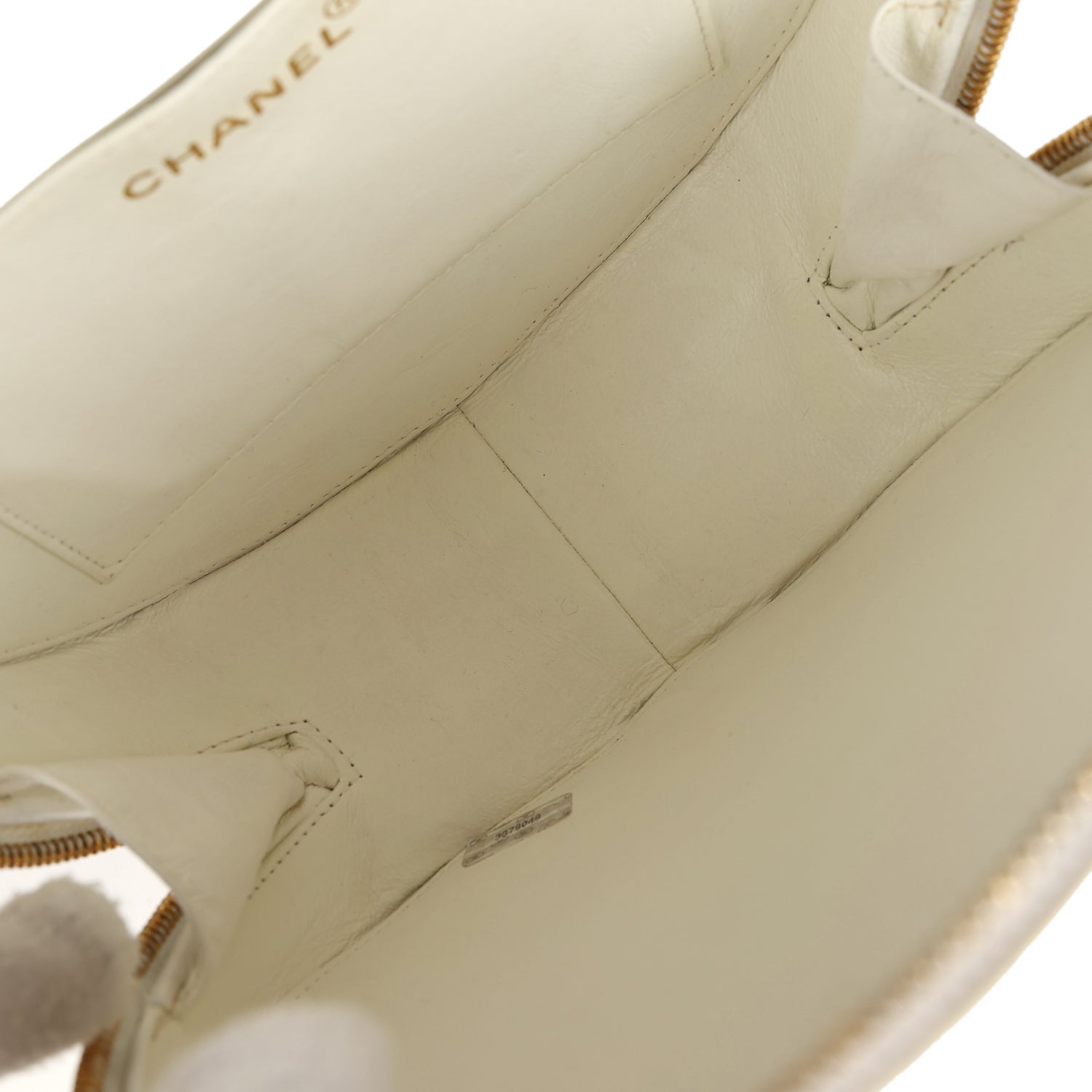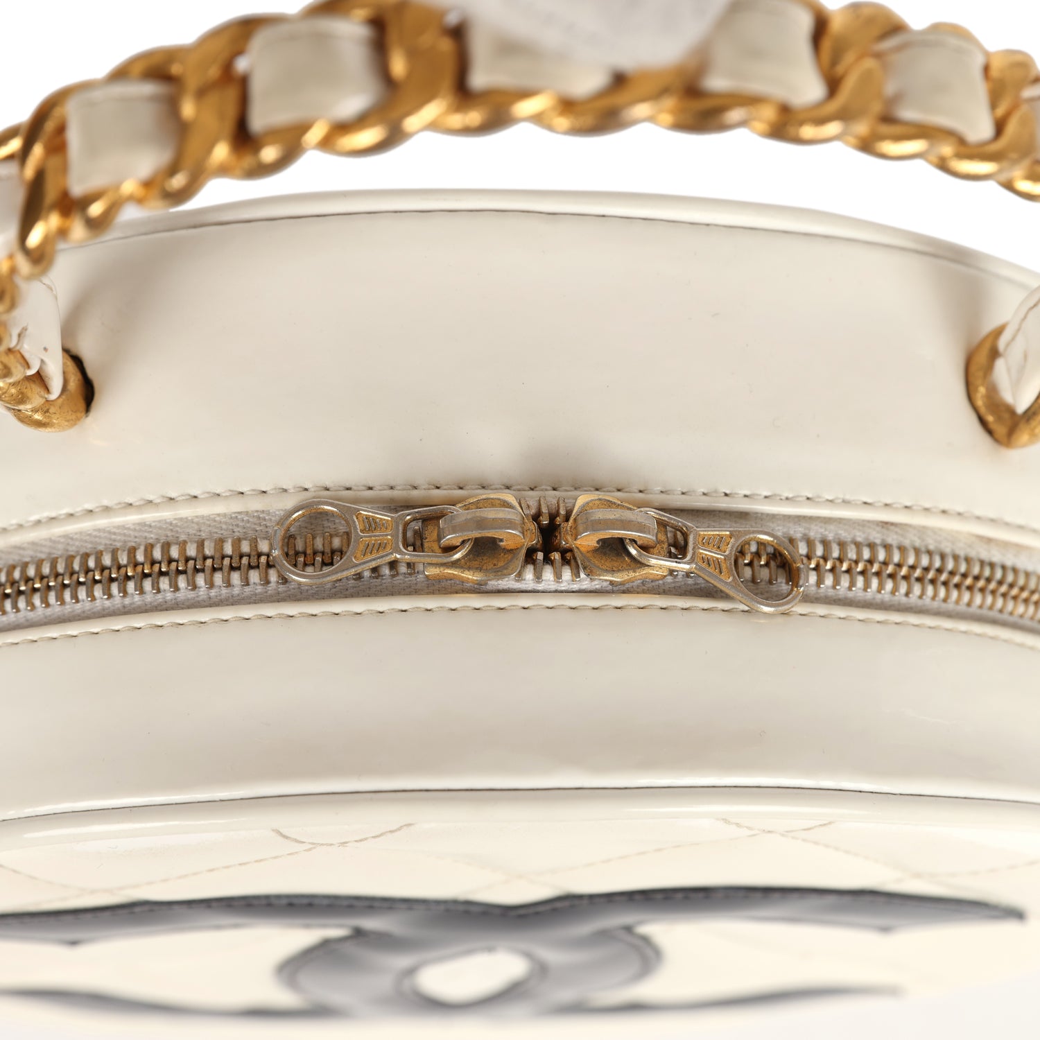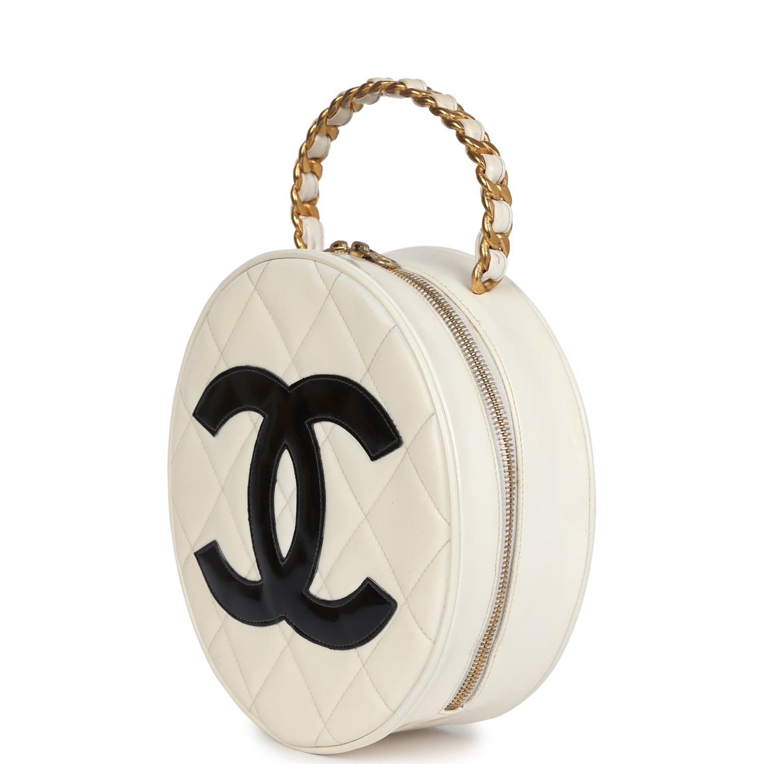 Regular price $1,950.00 Sale price $430.00 Save $1,520.00This Vintage Round Vanity Case is in white and black quilted patent leather with antique gold hardware, stitched CC Logo on front, double zipper closure, and interwoven patent leather and antique gold top handle.