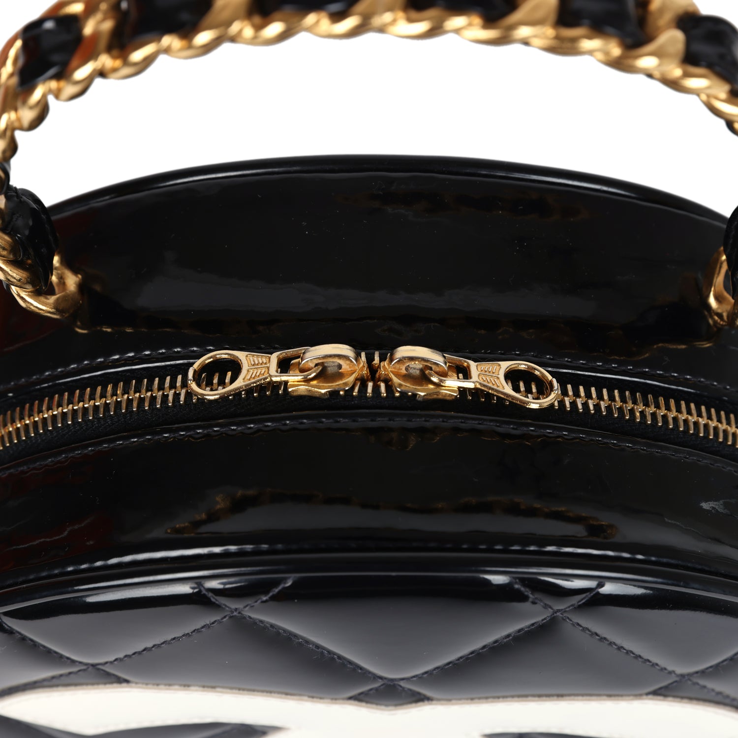 Vintage Chanel Round Vanity Bag Black and White Patent Leather Antique Gold Hardware