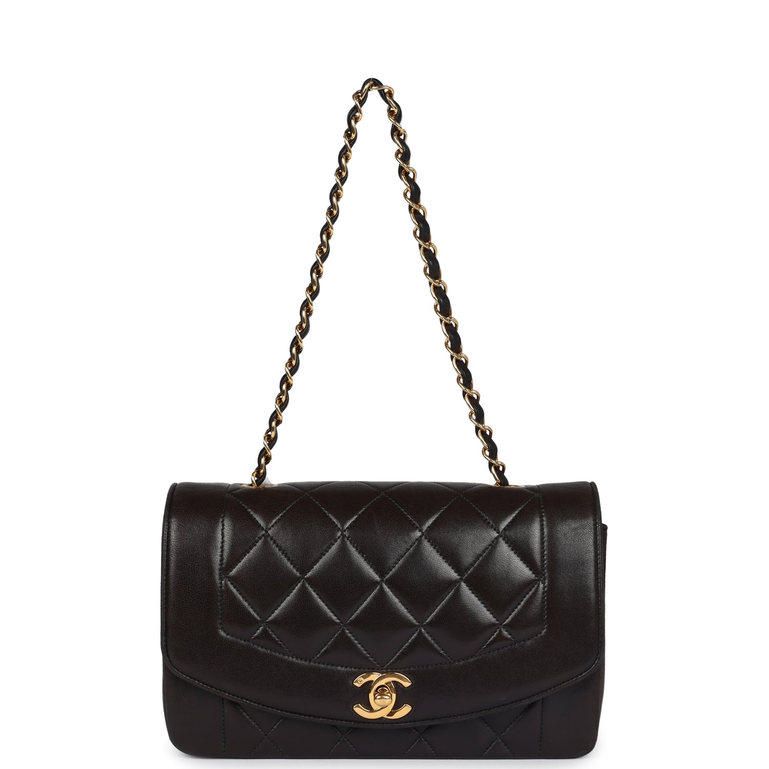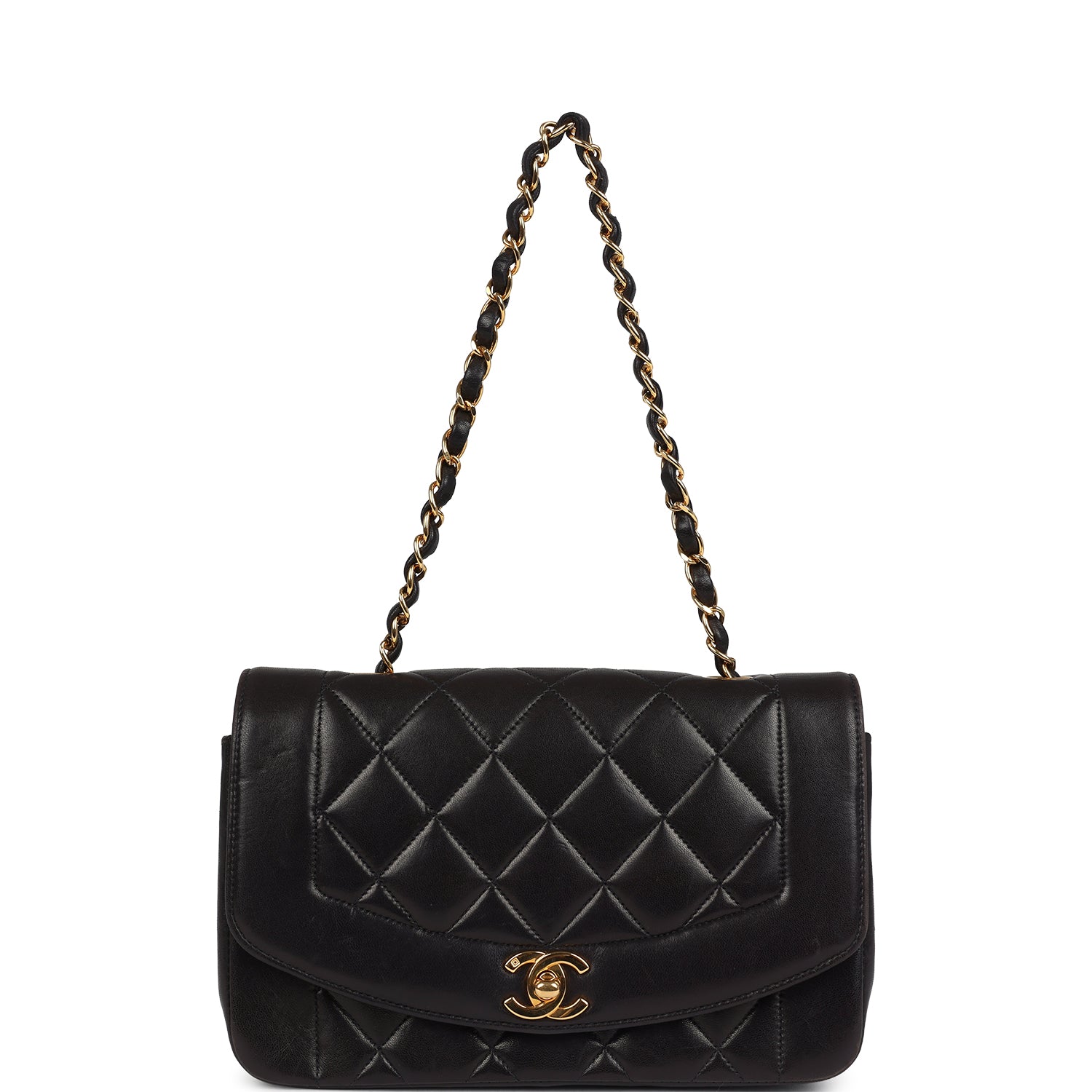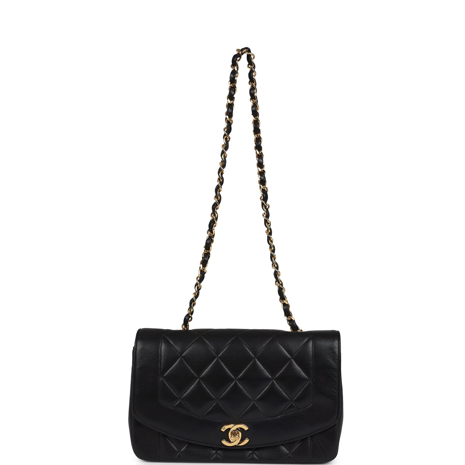 Regular price $2,100.00 Sale price $710.00 Save $1,390.00 Vintage Diana flap bag in black lambskin leather with gold hardware, featuring a front flap with CC turnlock closure and adjustable interwoven gold plated chain link and Black leather shoulder/crossbody strap.