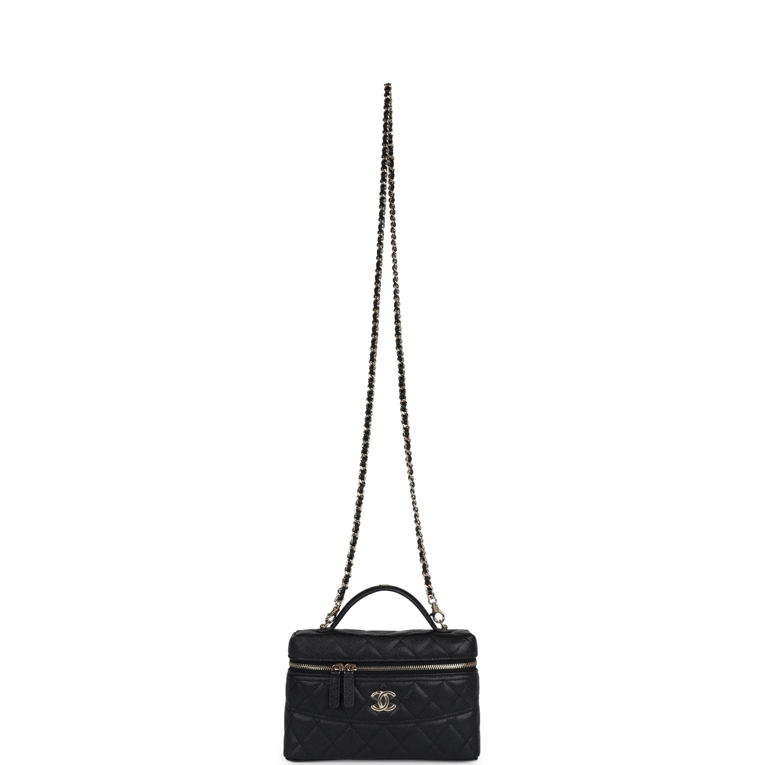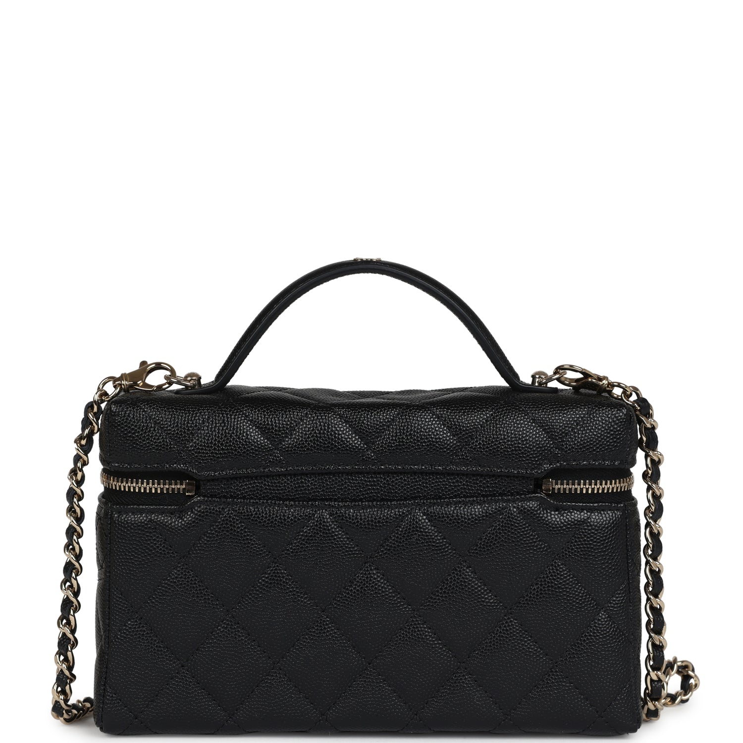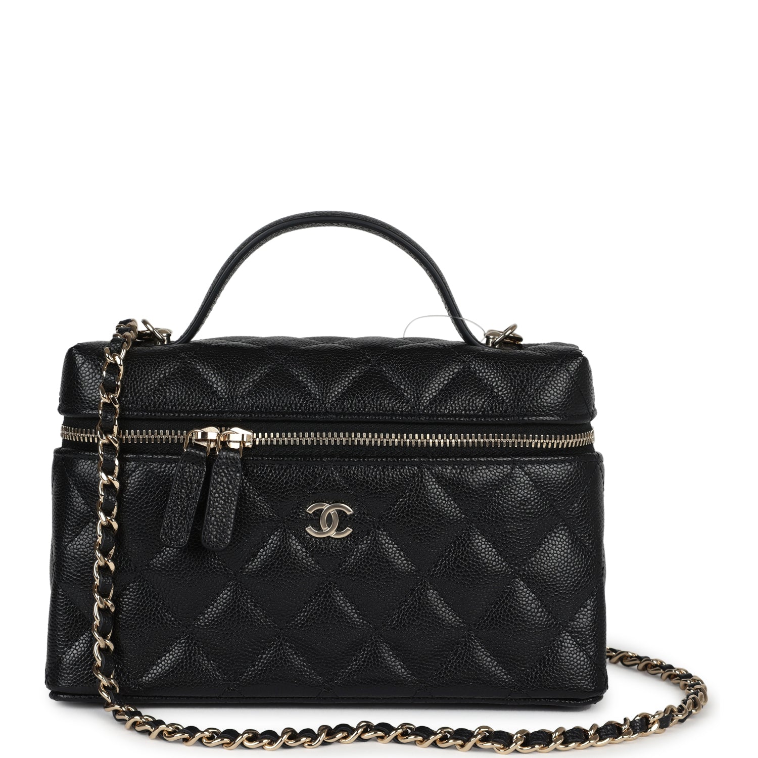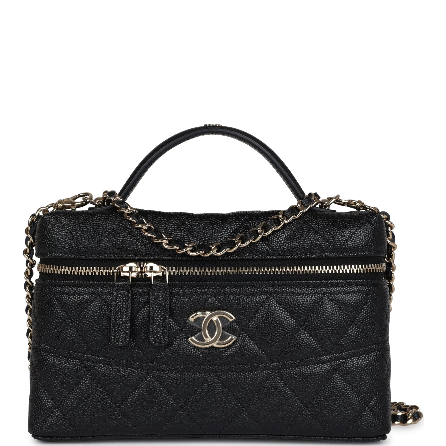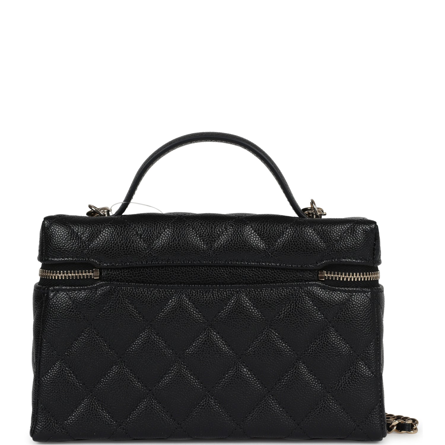 Chanel CC Top Handle Long Vanity Case With Chain Black Caviar Light Gold Hardware