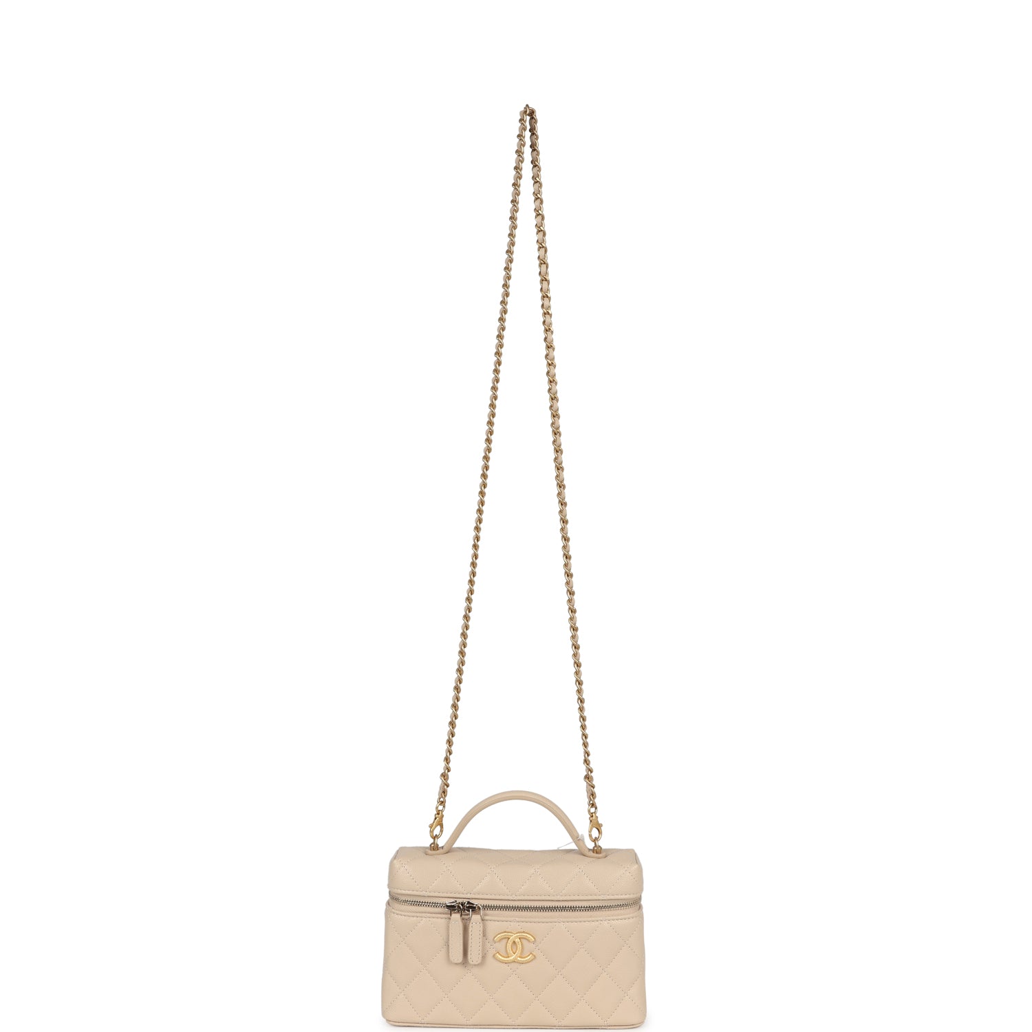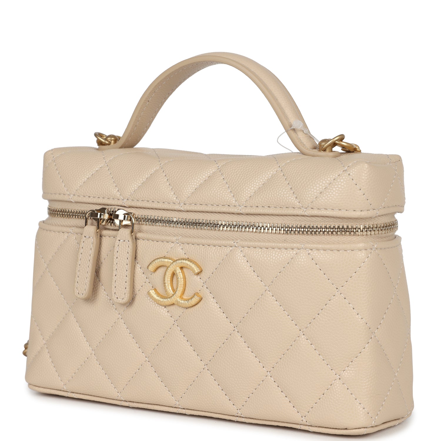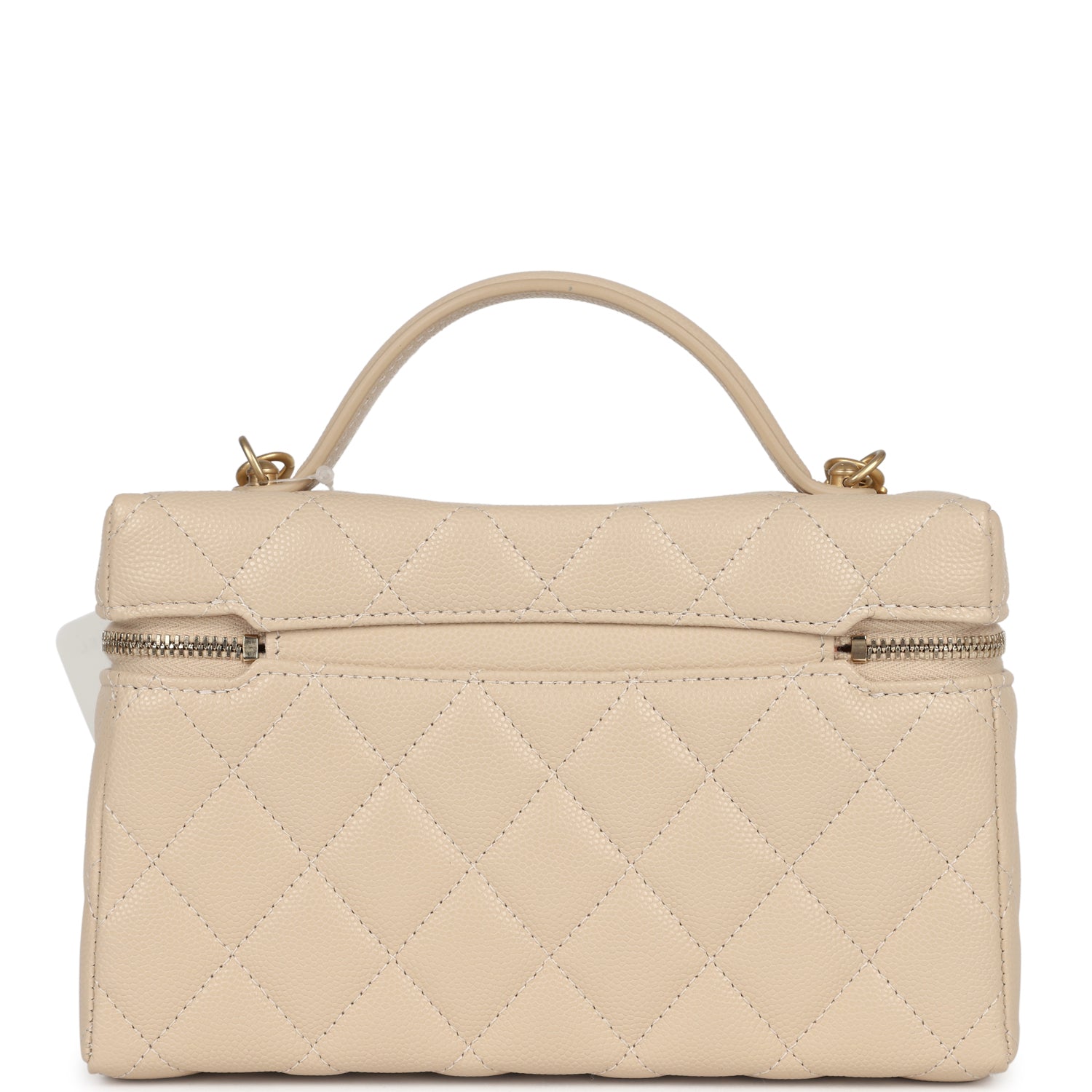 Chanel CC Top Handle Long Vanity Case With Chain Light Beige Shiny Caviar Brushed Gold Hardware