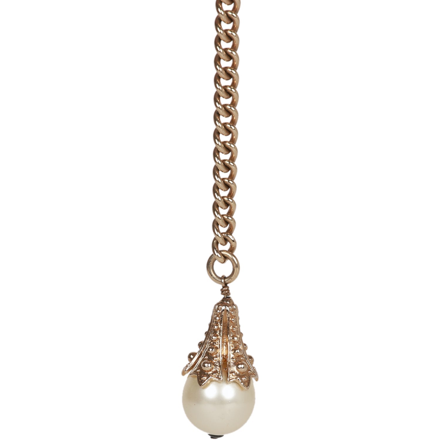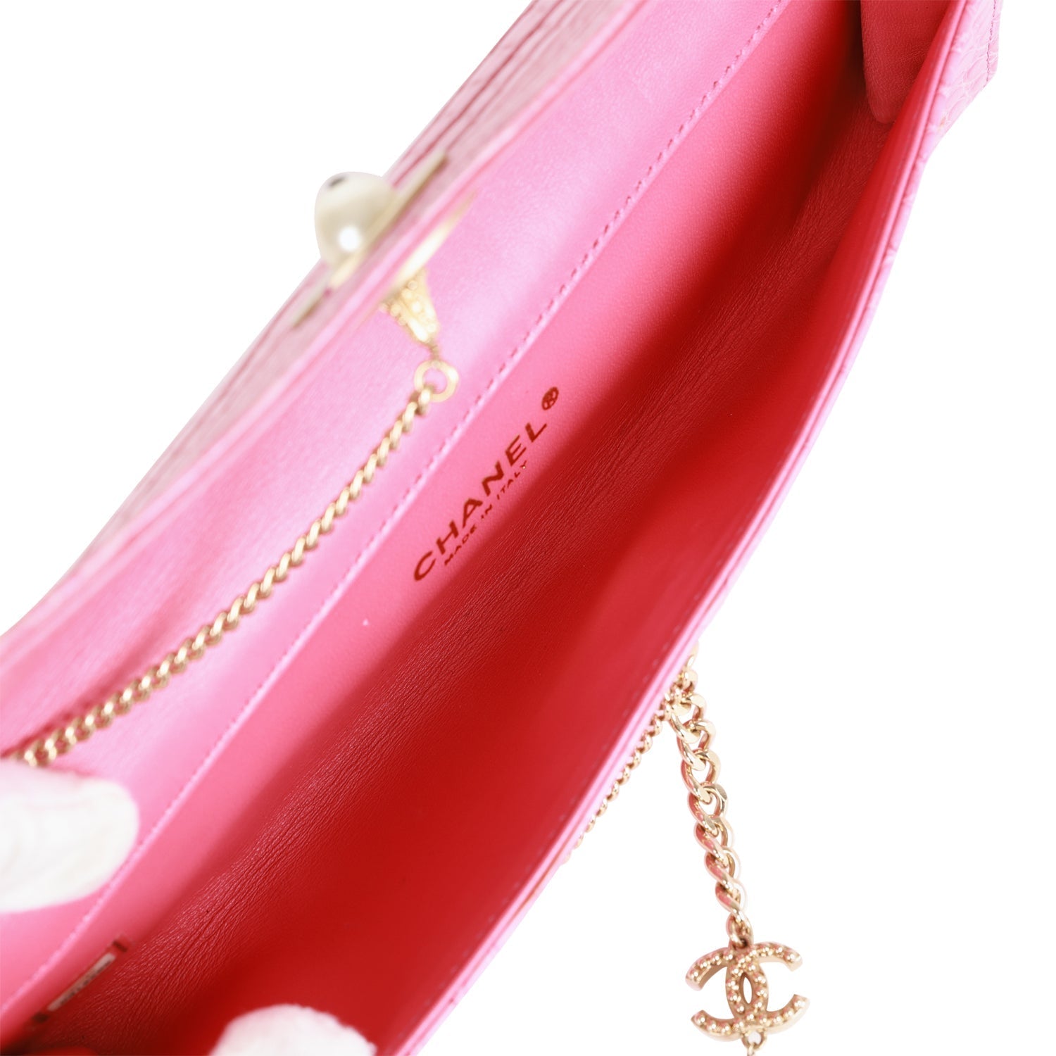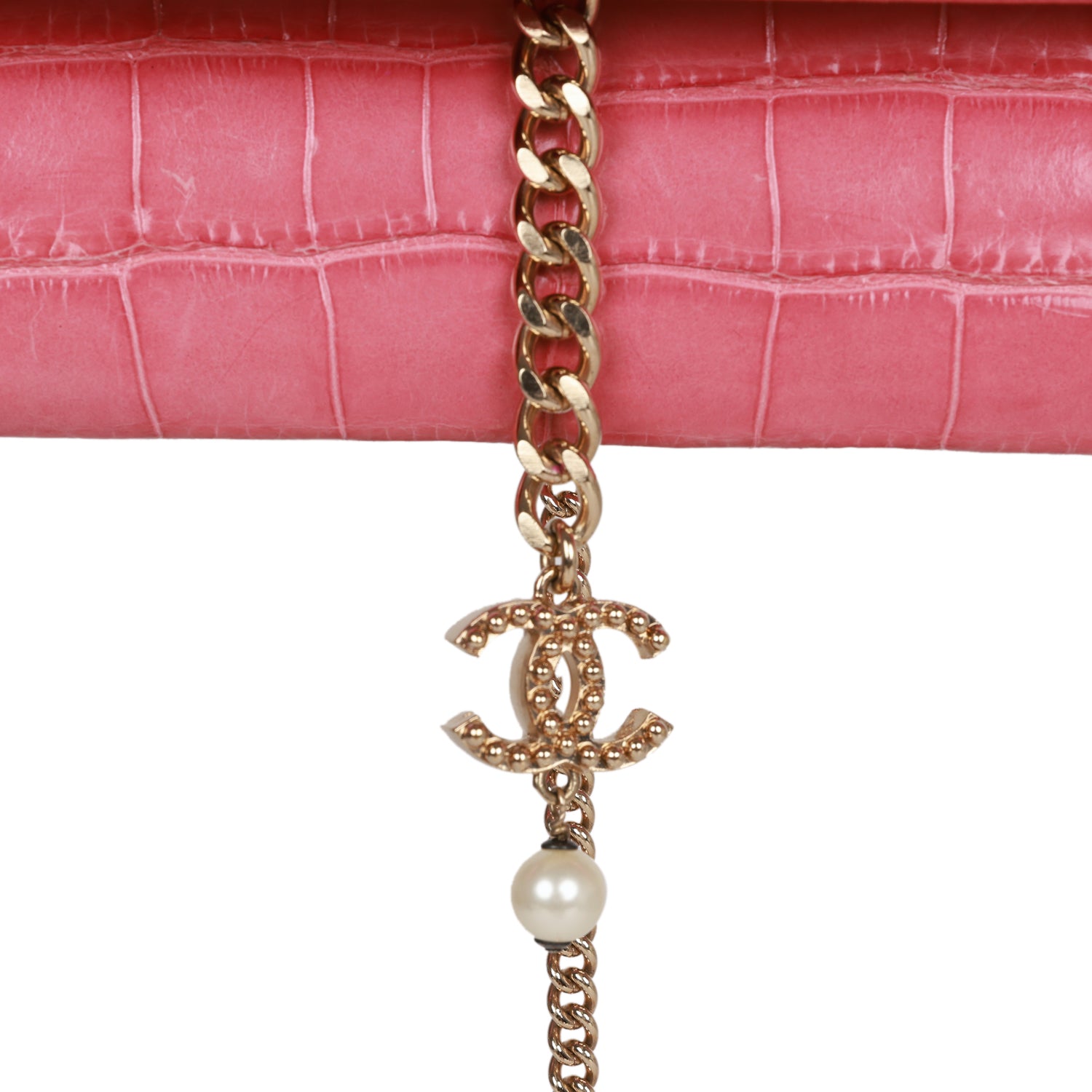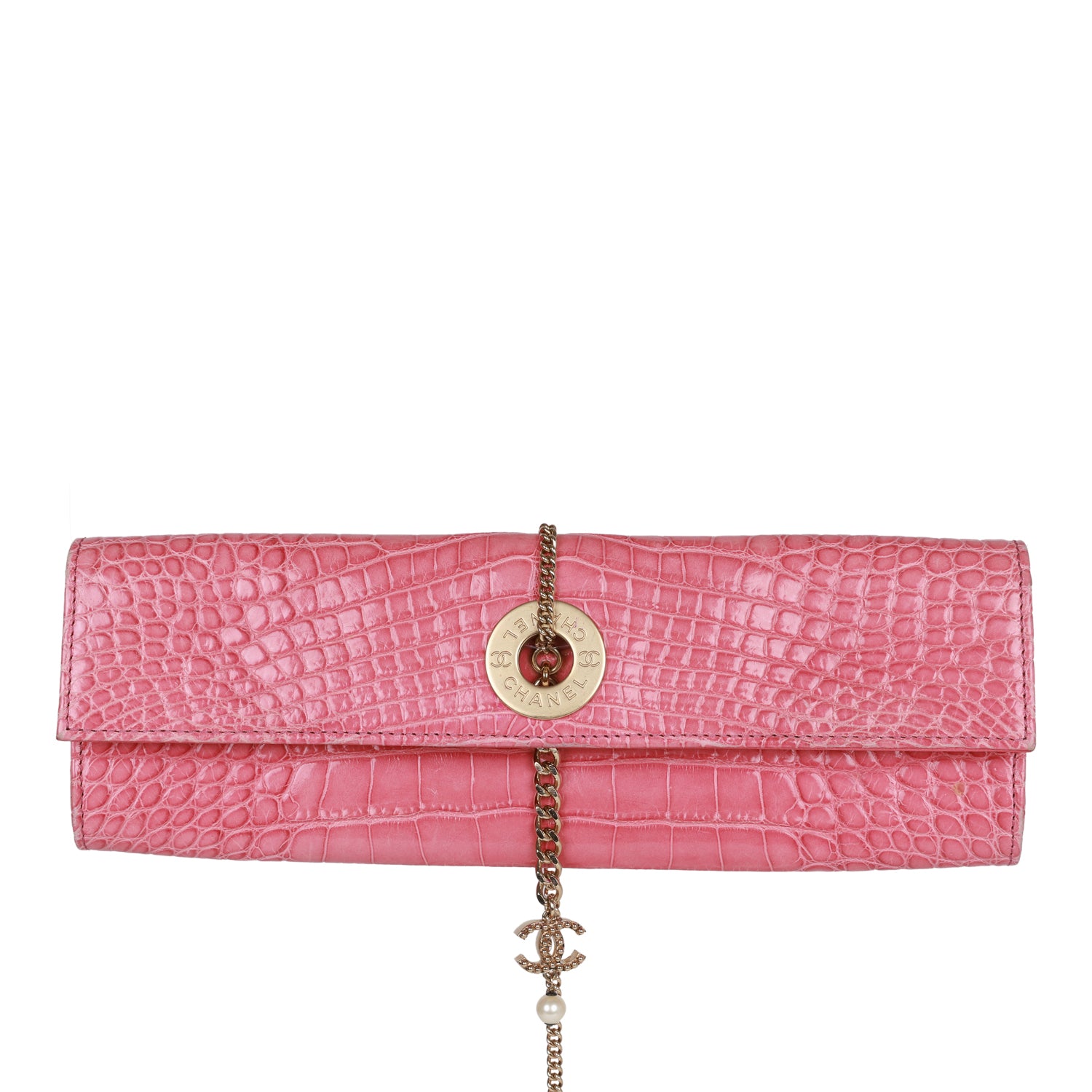 Regular price $16,550.00 Sale price $1,140.00 Save $15,410.00This Clutch is in Pink shiny crocodile and features a Gold Chain pull-through closure with CC Logo pendant and two faux pearl pendants.