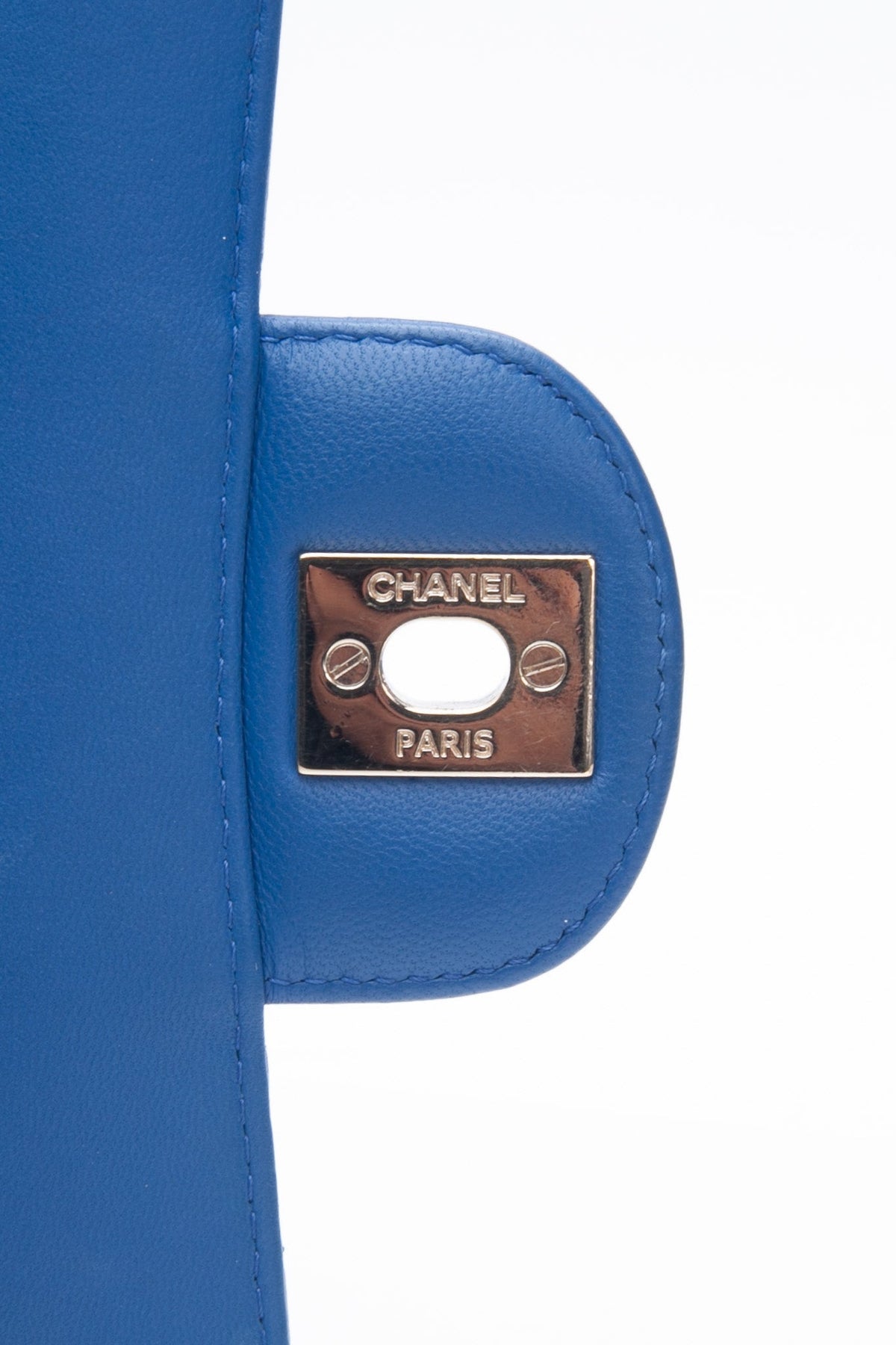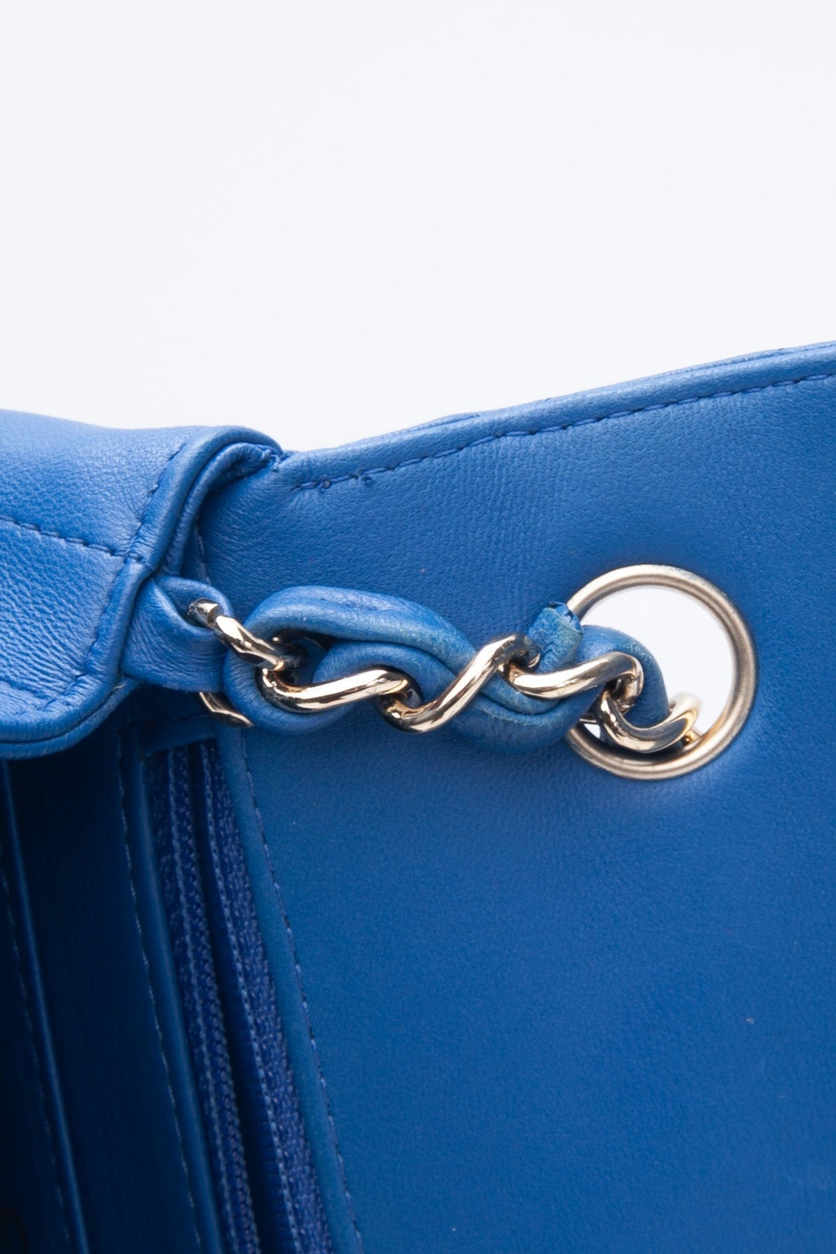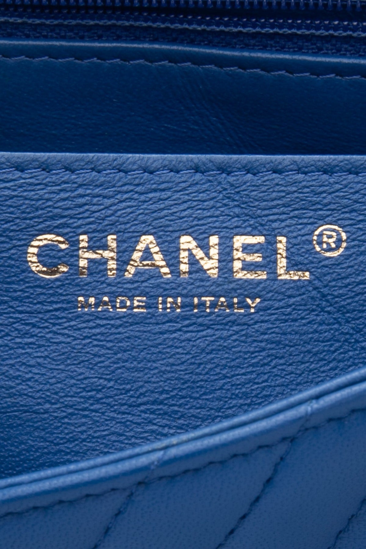 Regular price $2,390.00 Sale price $450.00 Save $1,940.00The chic cross-body is finely crafted of luxurious royal blue chevron-quilted lambskin leather. The bag features a leather-threaded gold chain-link shoulder strap and a matching gold classic CC turn-lock on the crossover flap. This opens the bag to a smooth blue leather interior with zipper and patch pocket.