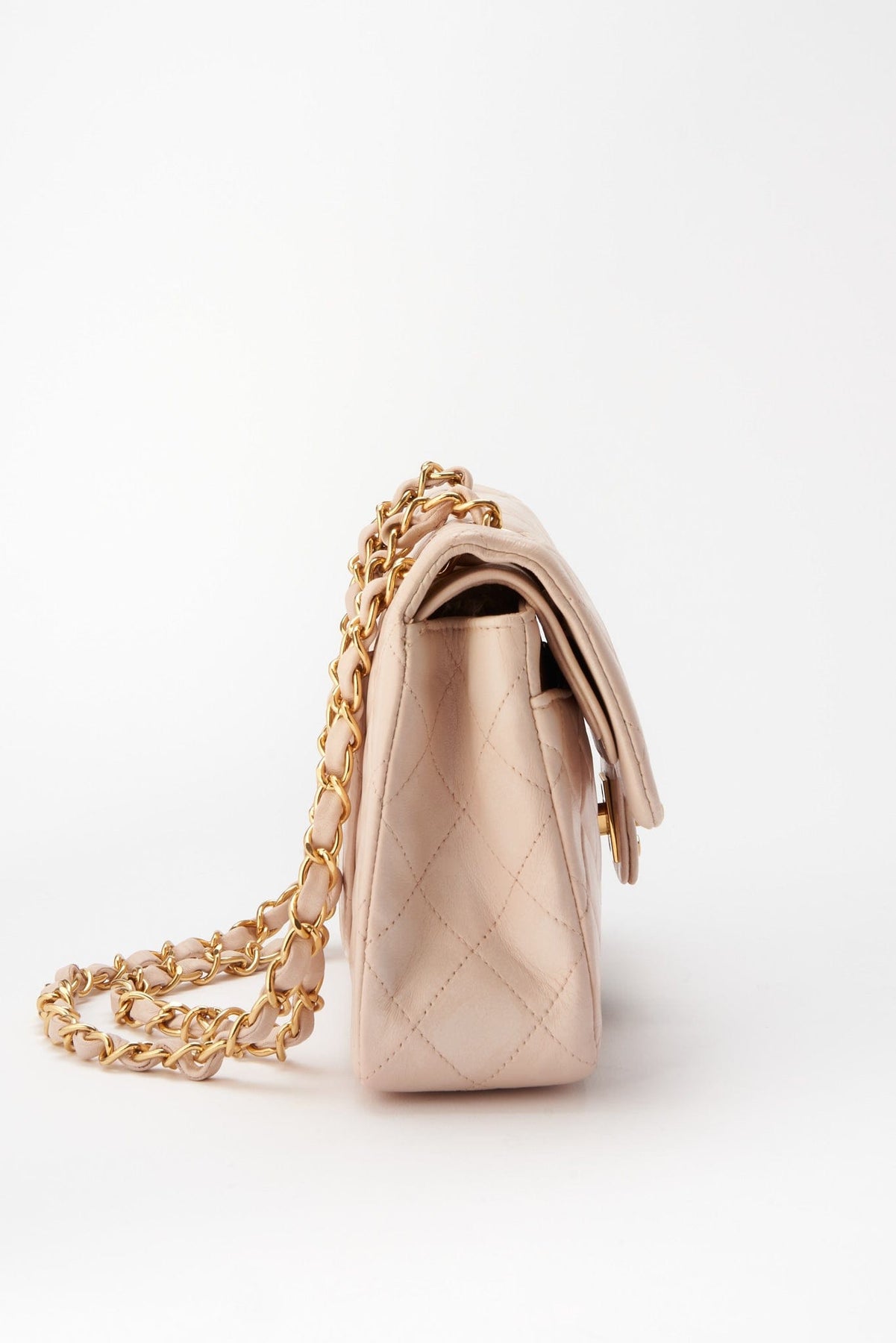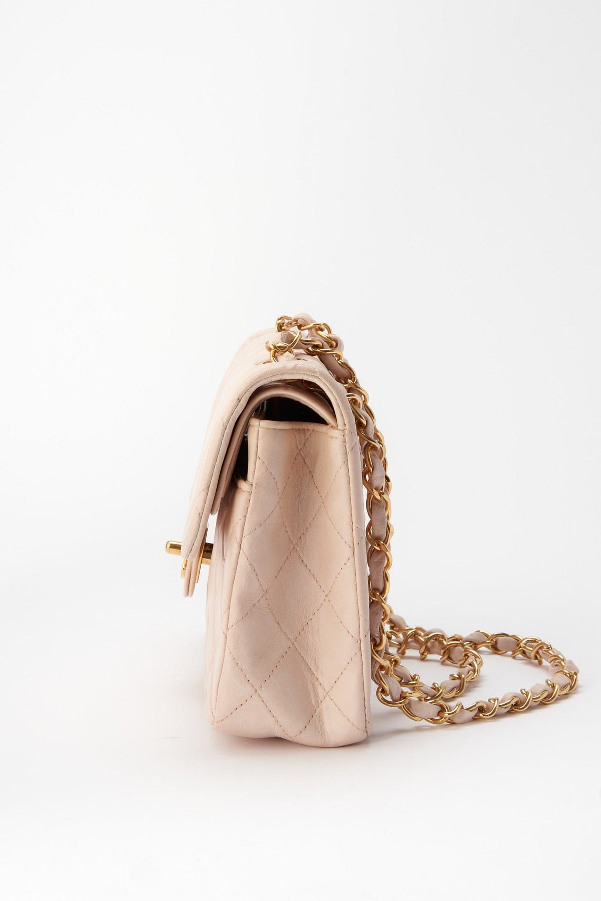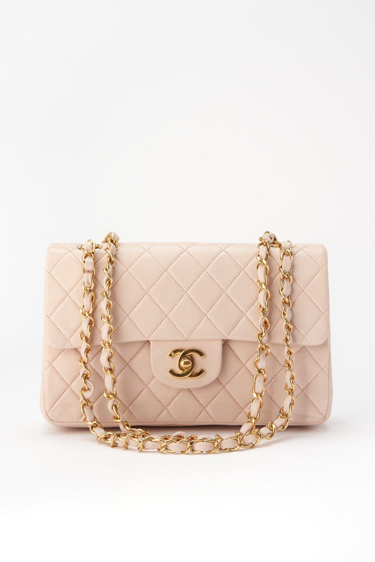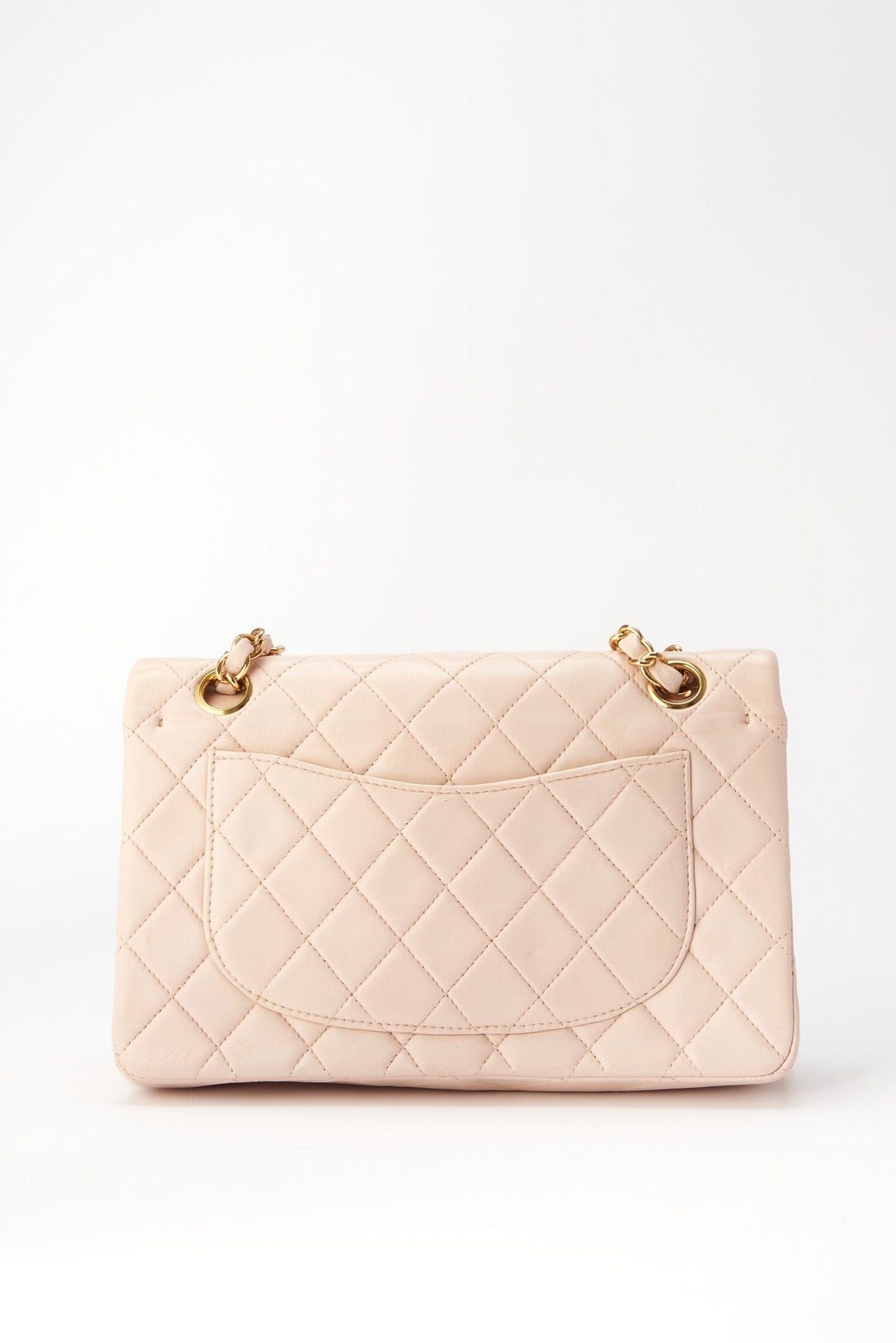 Regular price $1,920.00 Sale price $410.00 Save $1,510.00This vintage Classic Chanel Small Flap bag is crafted with powder pink diamond quilted lambskin leather with 24k gold-plated hardware and a single convertible leather-trimmed chain-link shoulder strap. There is a single exterior patch pocket on the back, a single zip pocket under the front flap and three interior compartments.