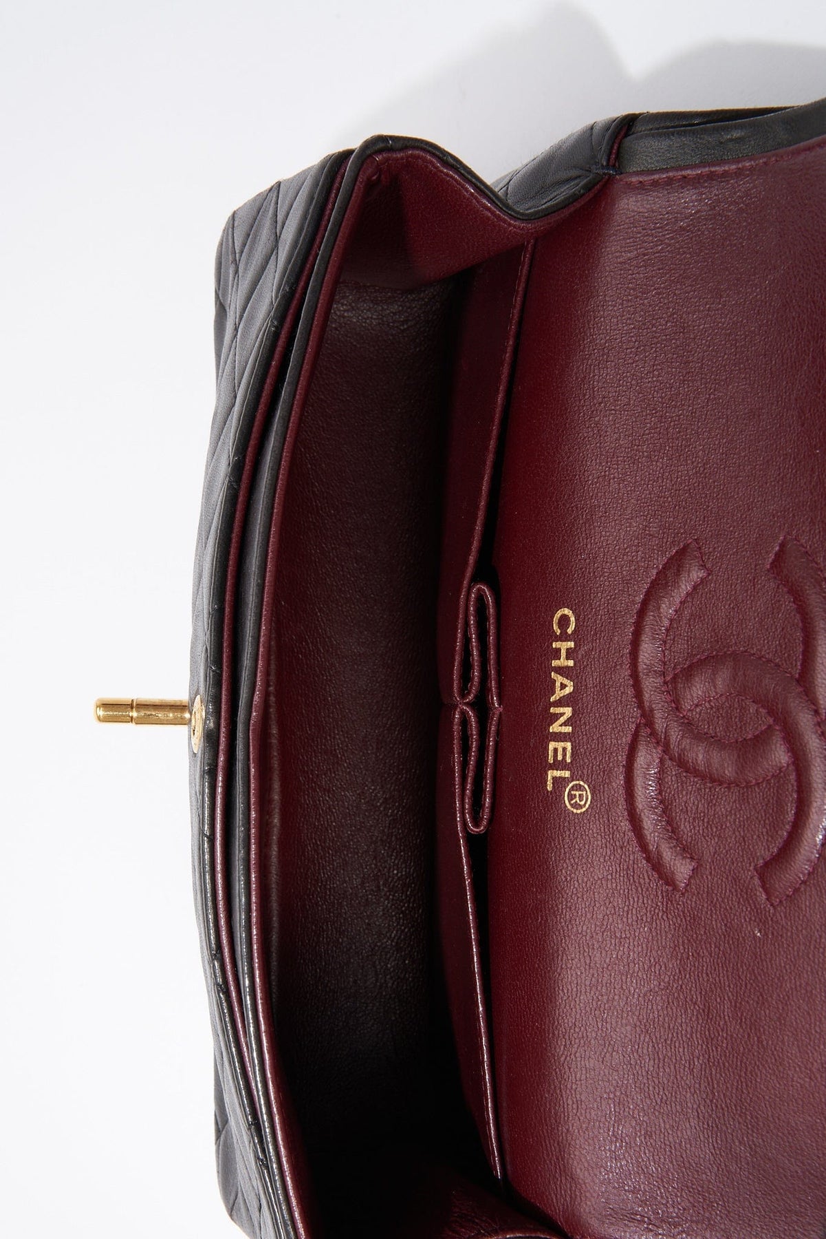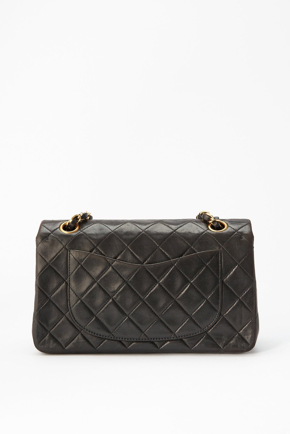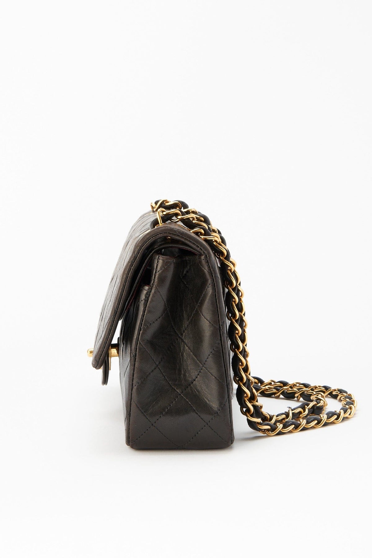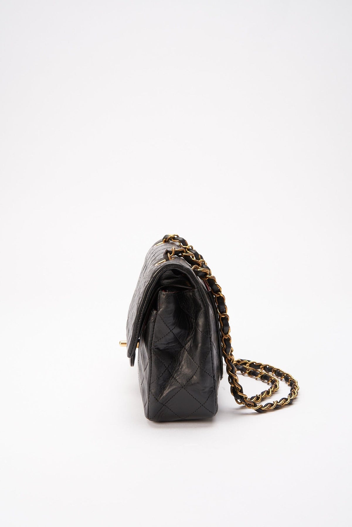 Regular price $1,990.00 Sale price $410.00 Save $1,580.00This vintage Classic Chanel Small Flap bag is crafted from black diamond quilted lambskin leather with 24k gold-plated hardware and a single convertible leather-trimmed chain-link shoulder strap. There is a single exterior patch pocket on the back, a single zip pocket under the front flap and three interior compartments. Inside the bag is lined with the classic maroon leather.