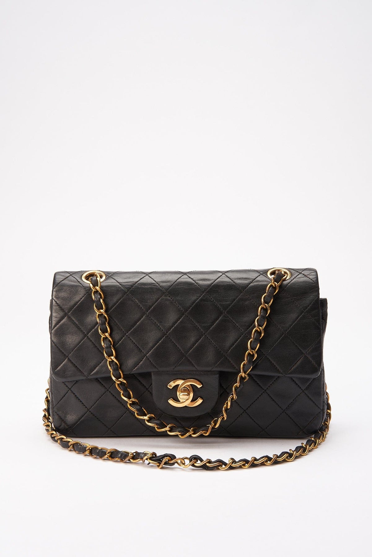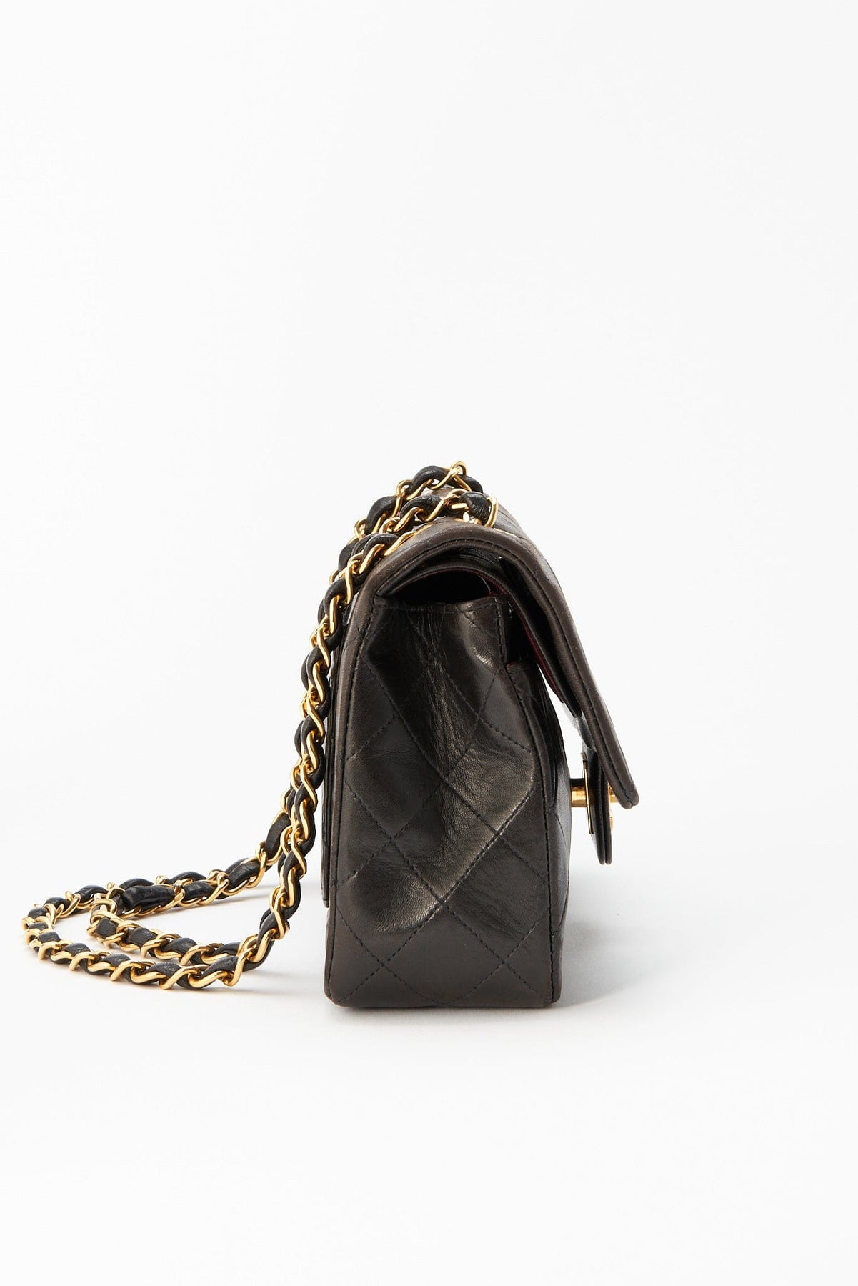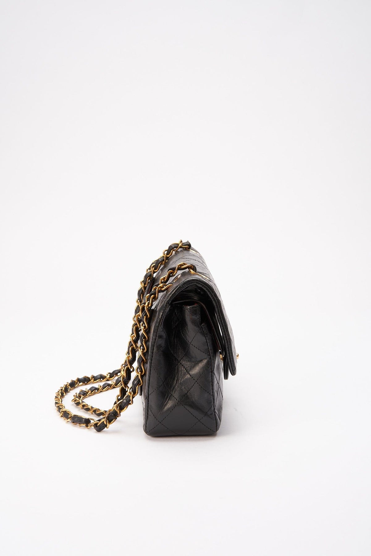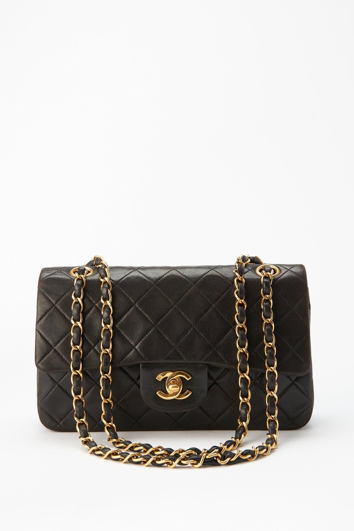 Regular price $1,990.00 Sale price $410.00 Save $1,580.00This vintage Classic Chanel Small Flap bag is crafted from black diamond quilted lambskin leather with 24k gold-plated hardware and a single convertible leather-trimmed chain-link shoulder strap. There is a single exterior patch pocket on the back, a single zip pocket under the front flap and three interior compartments. Inside the bag is lined with the classic maroon leather.