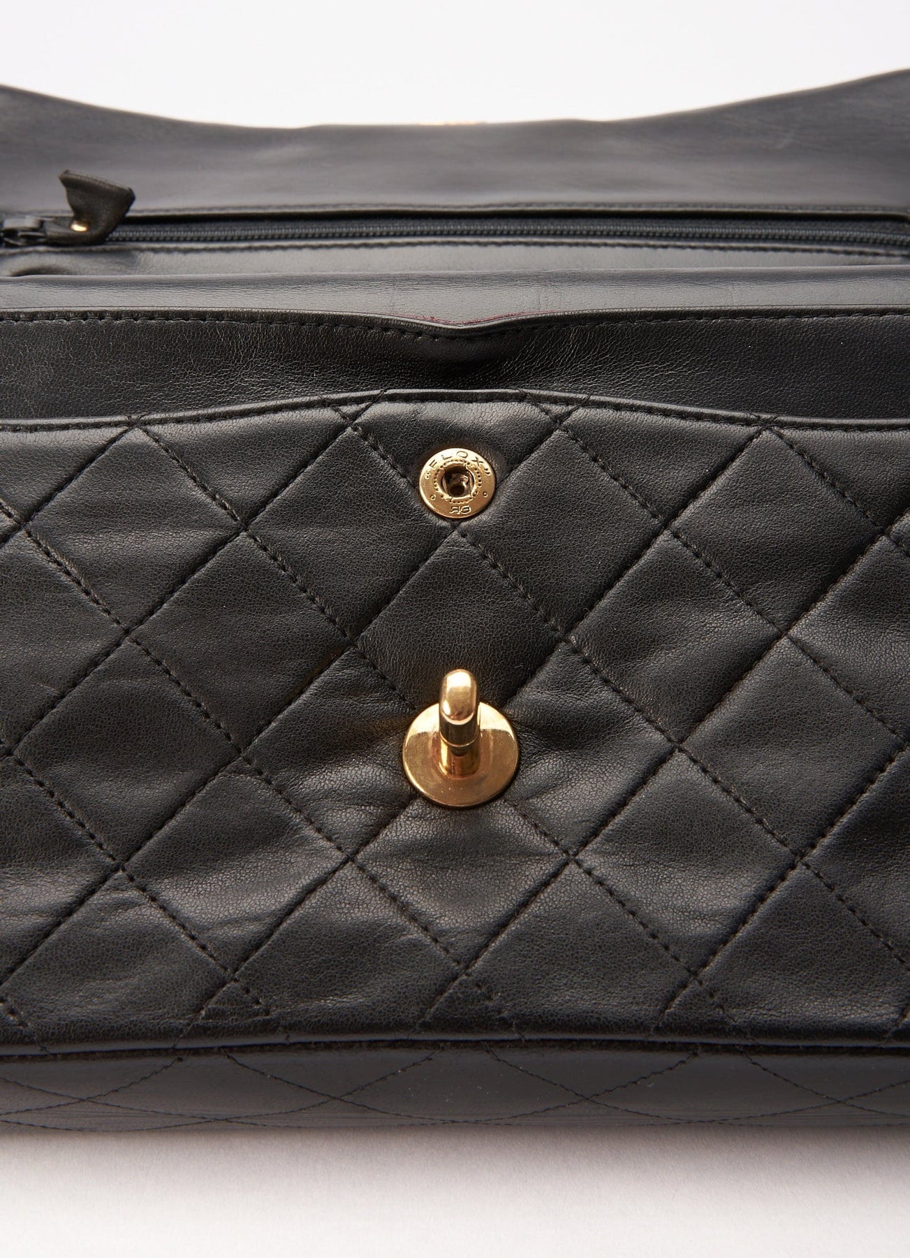 Regular price $1,960.00 Sale price $420.00 Save $1,540.00This vintage Classic Chanel Small Flap bag is crafted from black diamond quilted lambskin leather with 24k gold-plated hardware and a single convertible leather-trimmed chain-link shoulder strap. There is a single exterior patch pocket on the back, a single zip pocket under the front flap and three interior compartments. Inside the bag is lined with the classic maroon leather.