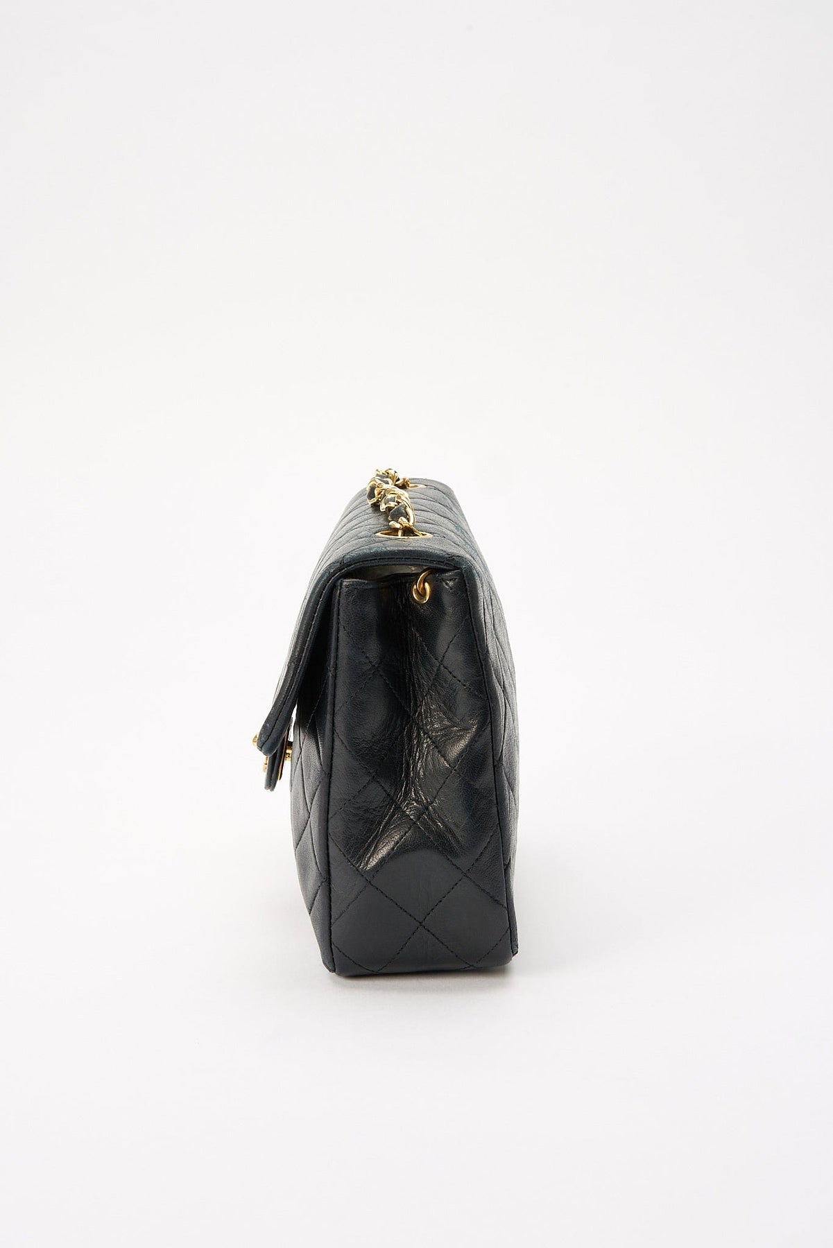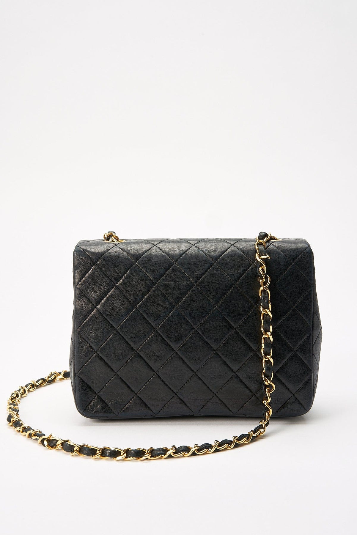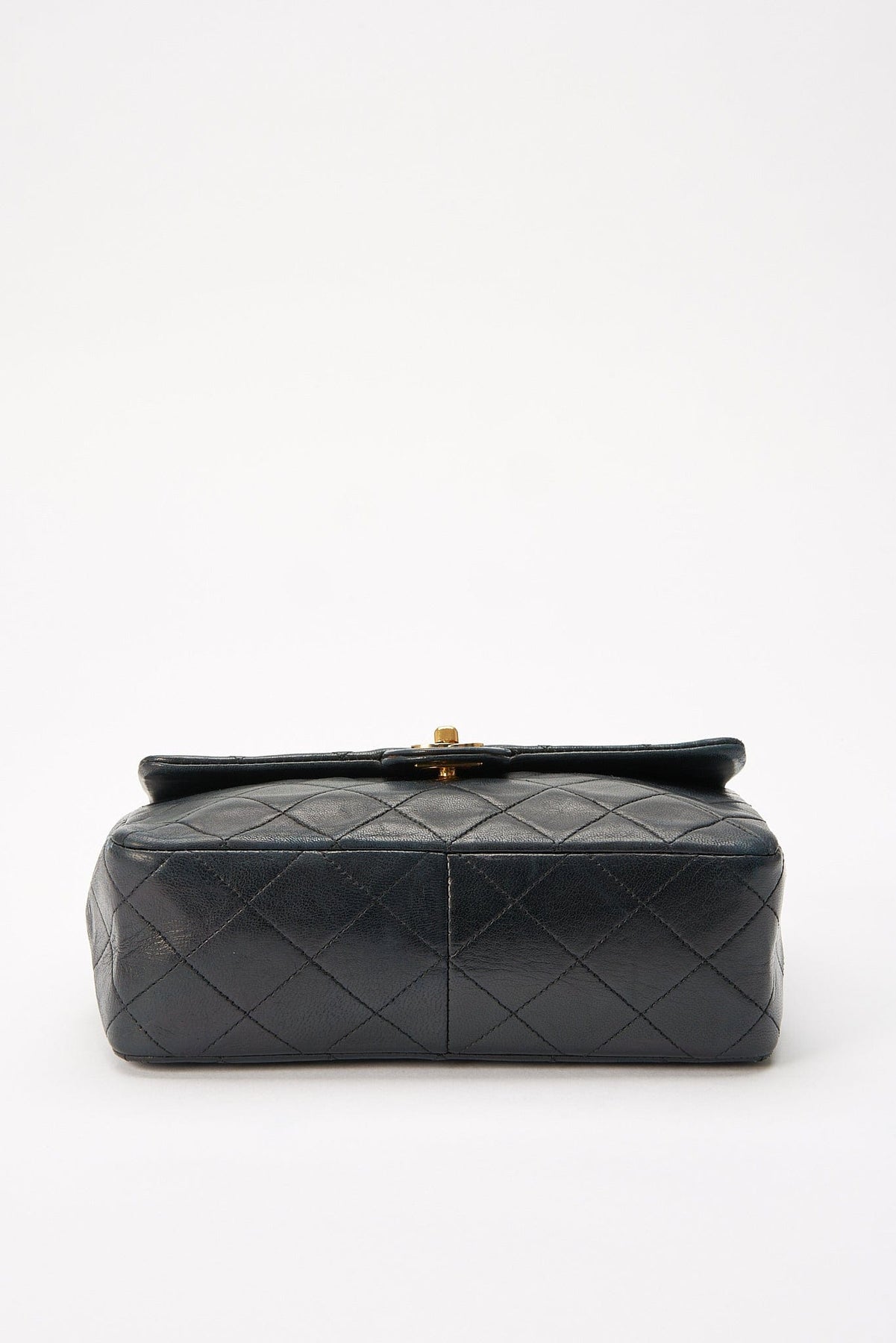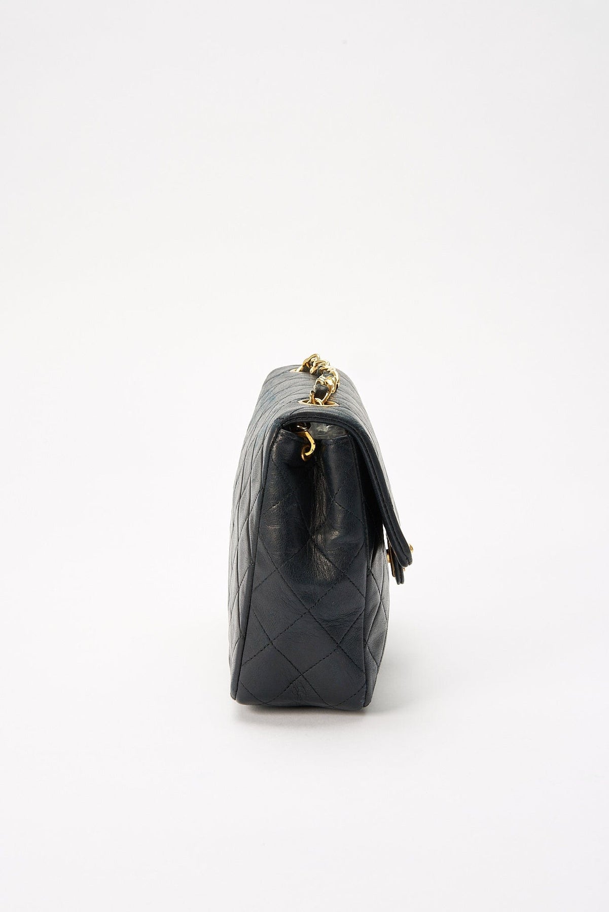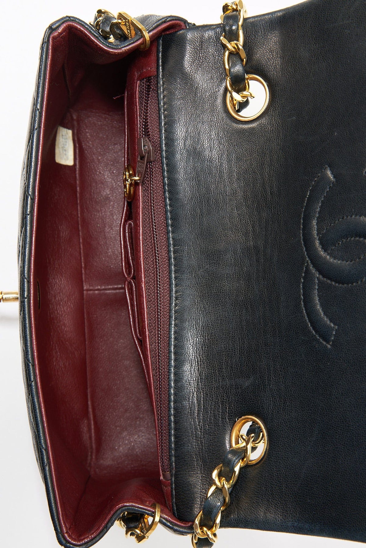 Regular price $2,210.00 Sale price $420.00 Save $1,790.00This vintage Classic Chanel Small Square Flap bag is crafted with diamond quilted navy lambskin leather with 24k gold-plated hardware and a single leather-trimmed chain-link shoulder strap. There are two interior compartments and an inner zipped pocket. Inside the bag is lined with maroon leather. The chain drop for this bag is 52cm. so can be on the shoulder or across the body.