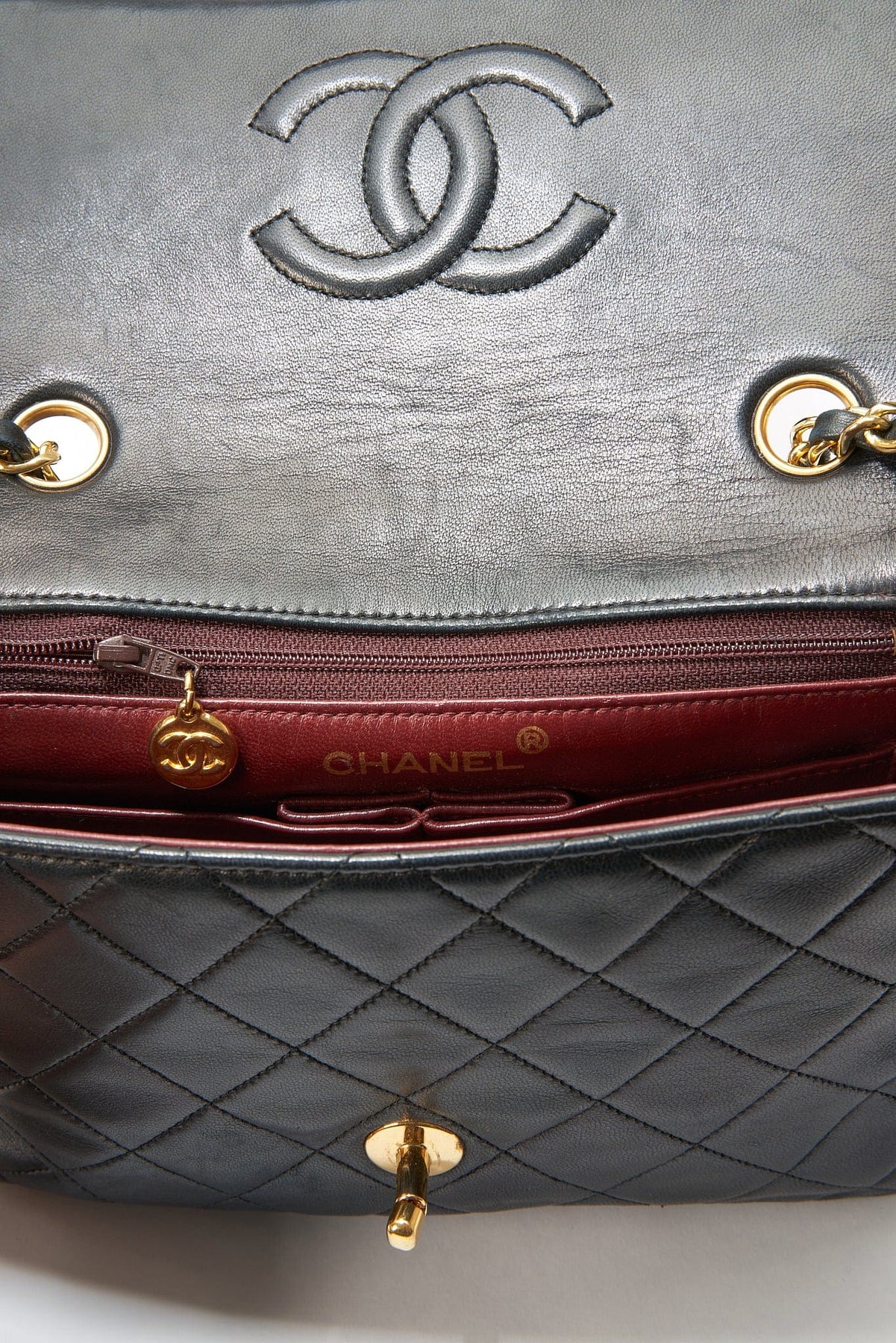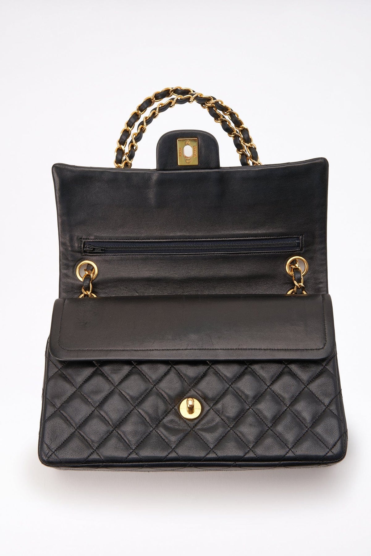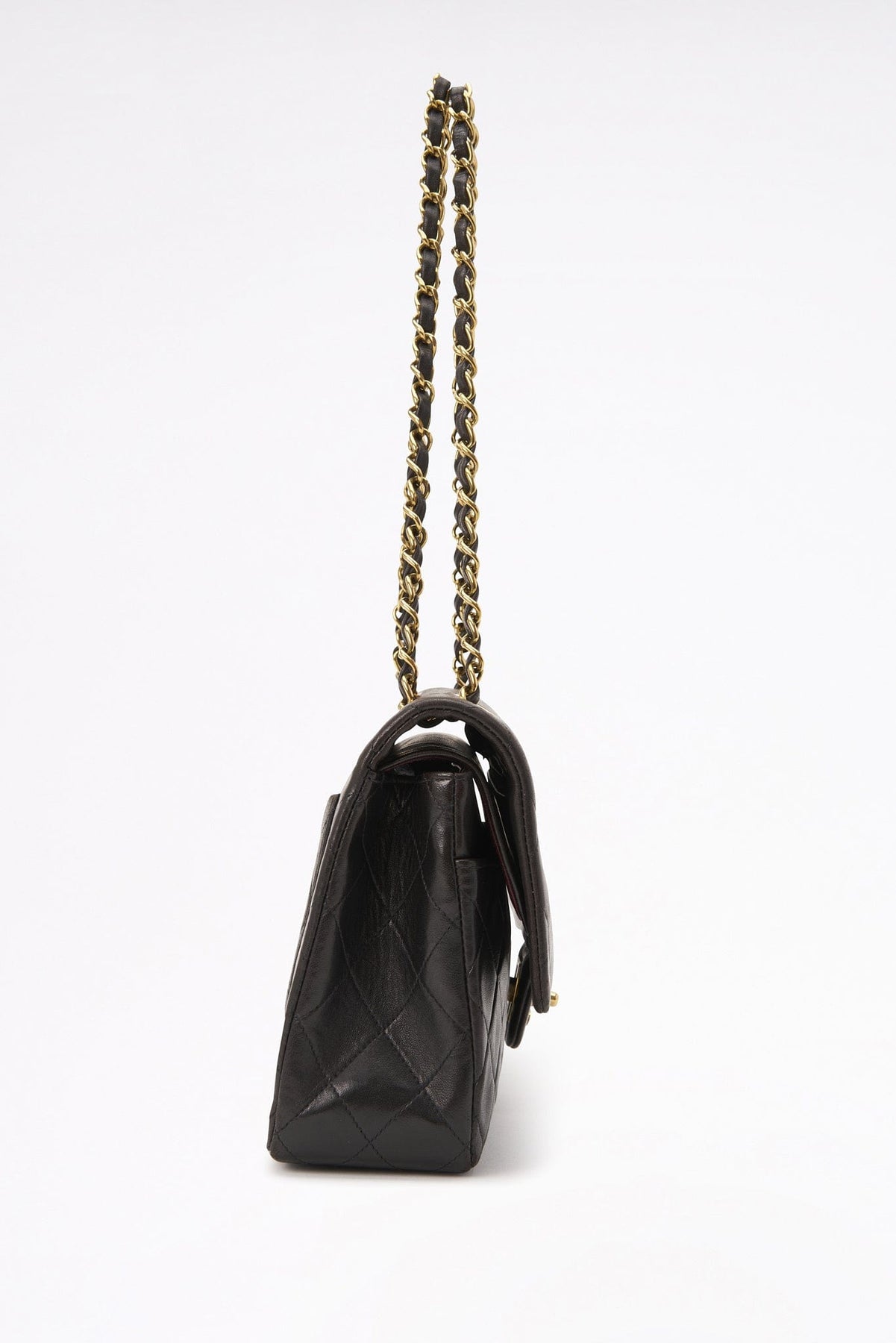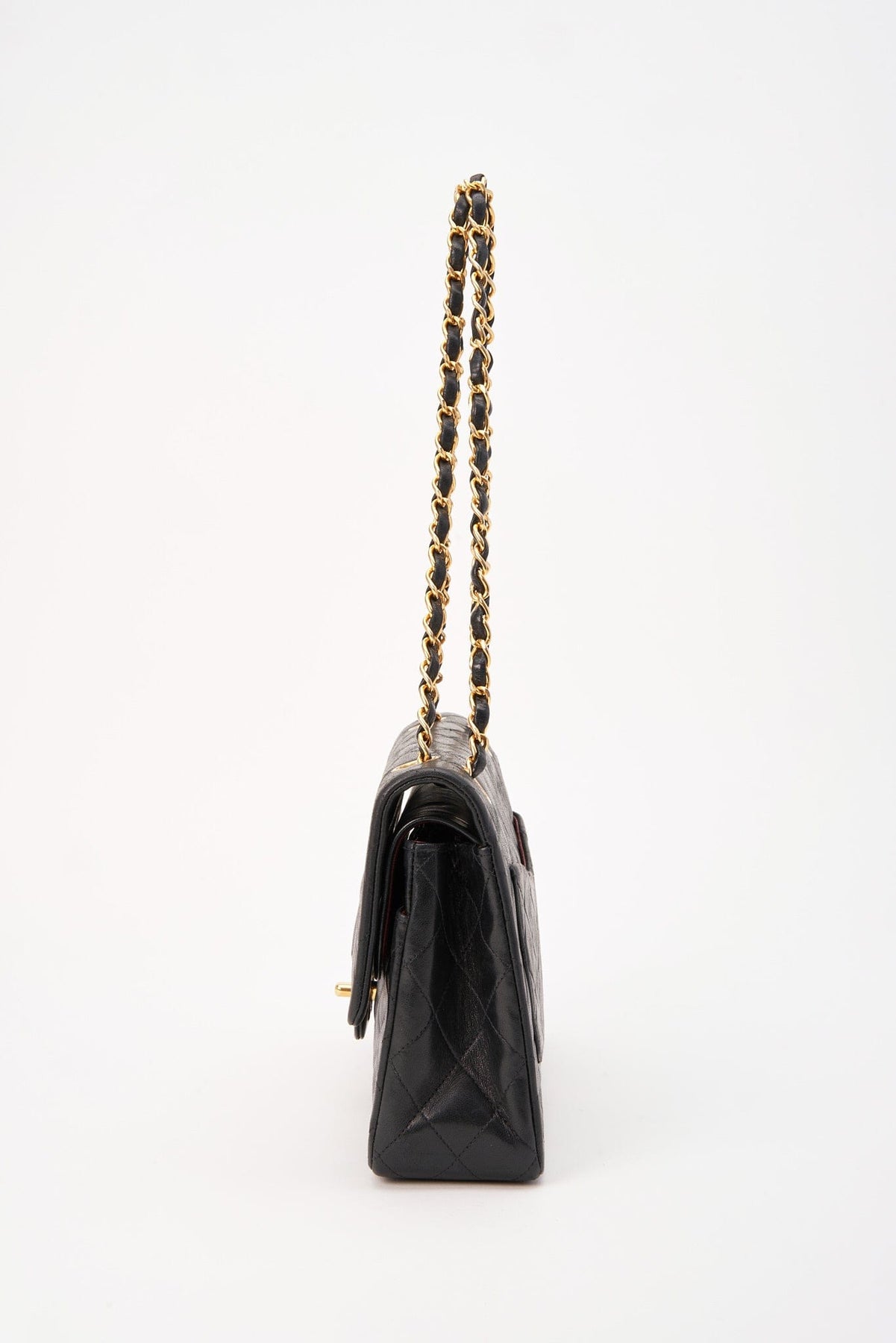 Regular price $2,000.00 Sale price $430.00 Save $1,570.00This vintage Classic Chanel Medium Flap bag is crafted with diamond quilted lambskin leather with 24k gold-plated hardware and a single convertible leather-trimmed chain-link shoulder strap. There is a single exterior patch pocket on the back, a single zip pocket under the front flap and three interior compartments. Inside the bag is lined with maroon leather.