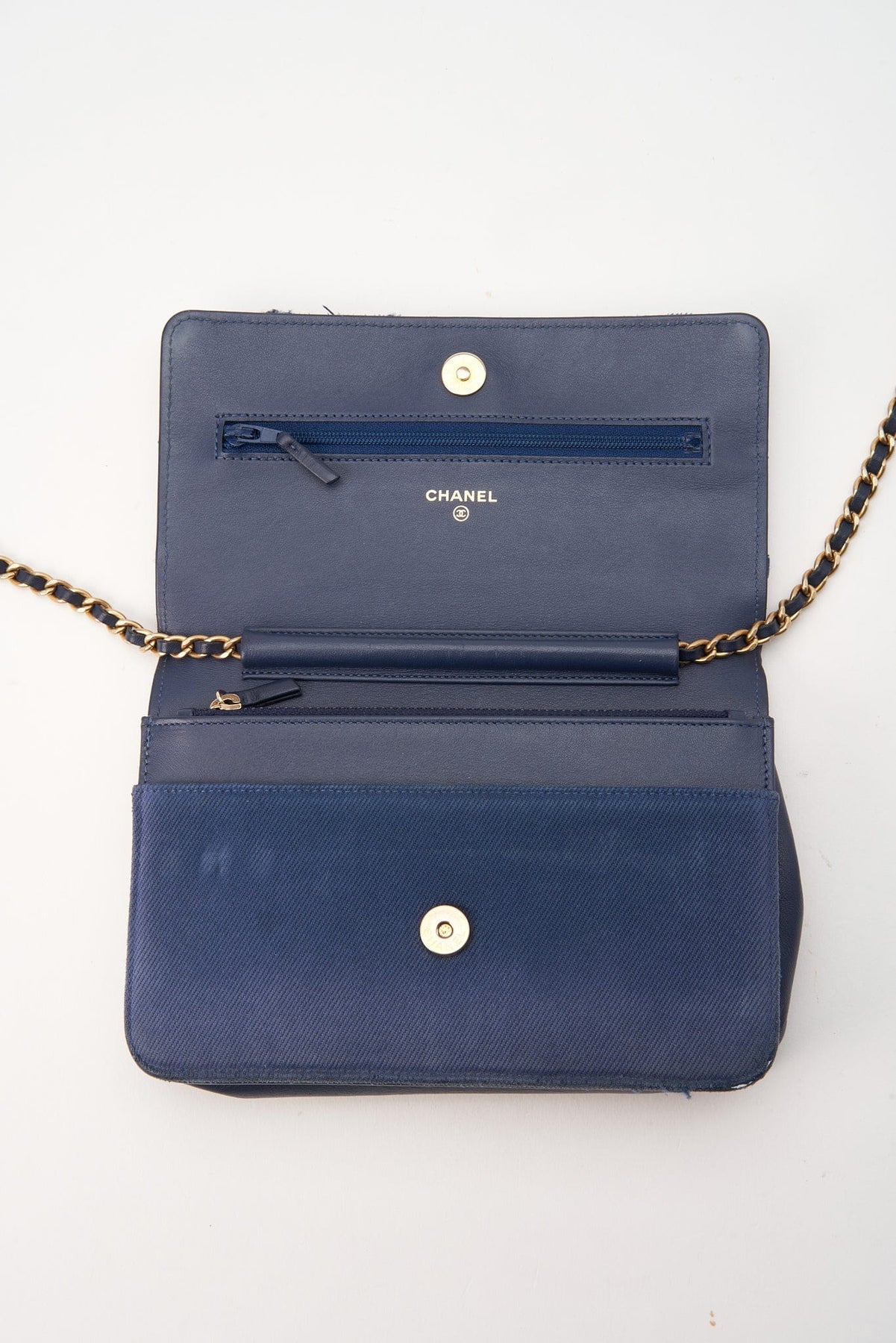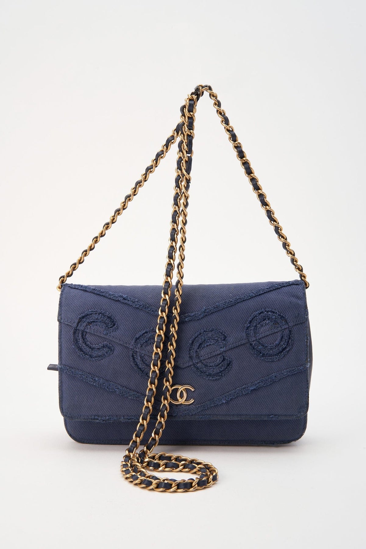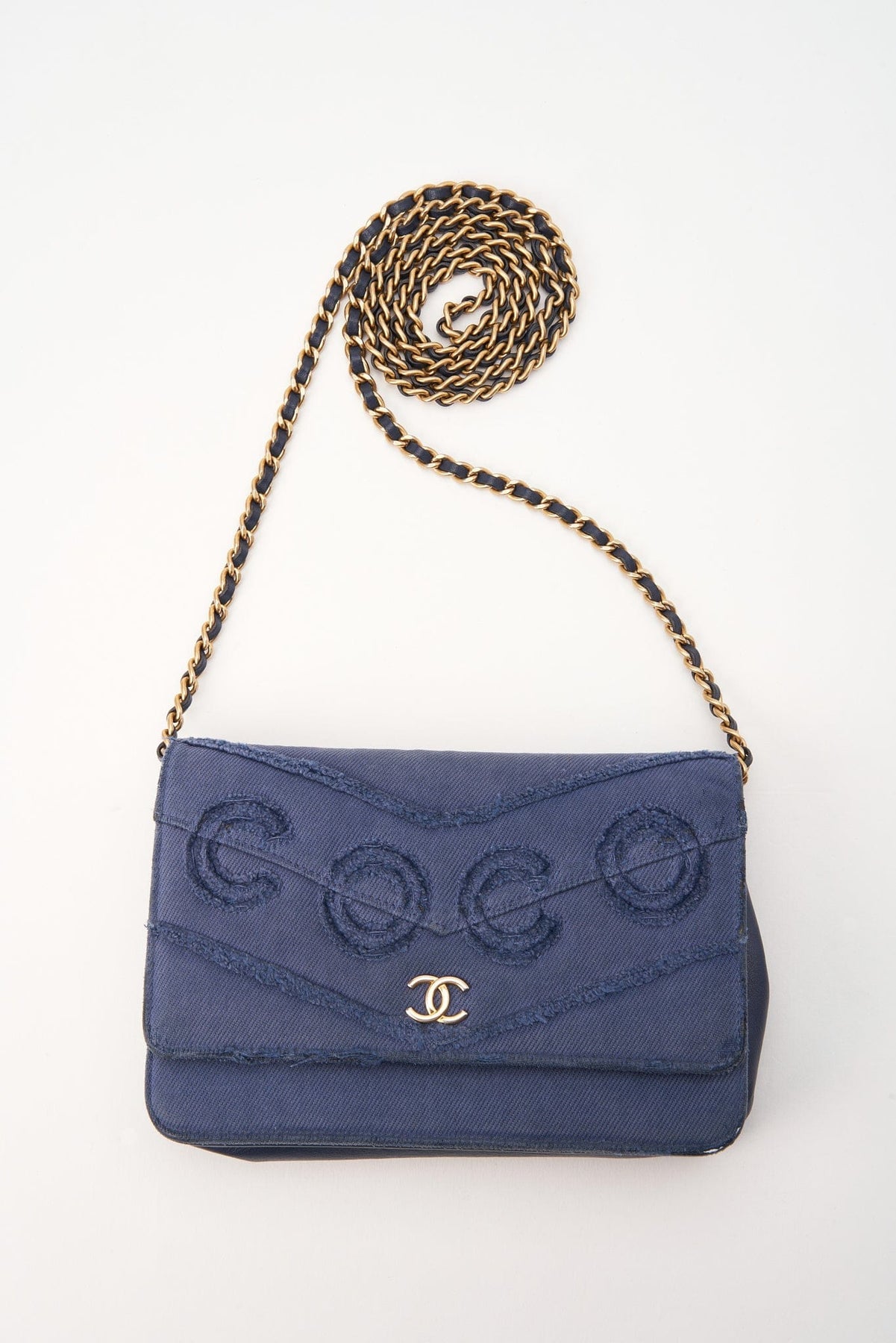 Regular price $1,930.00 Sale price $410.00 Save $1,520.00This Chanel wallet on chain, WOC, is crafted from a denim fabric and is lined with a blue lambskin leather, gold hardware and a single leather-trimmed chain-link shoulder strap.