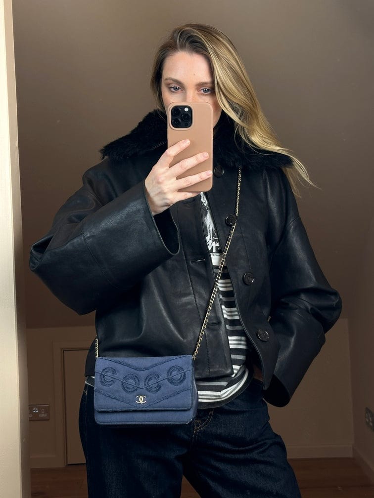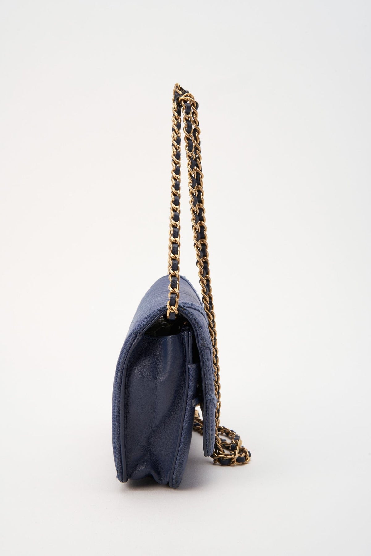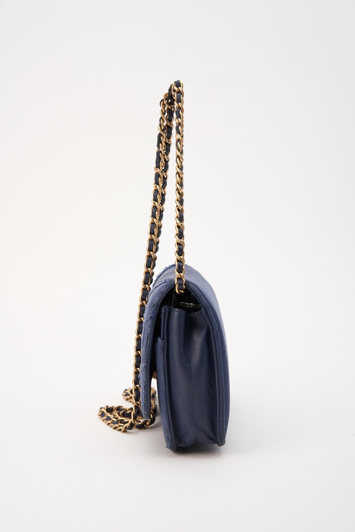 Regular price $1,930.00 Sale price $410.00 Save $1,520.00This Chanel wallet on chain, WOC, is crafted from a denim fabric and is lined with a blue lambskin leather, gold hardware and a single leather-trimmed chain-link shoulder strap.