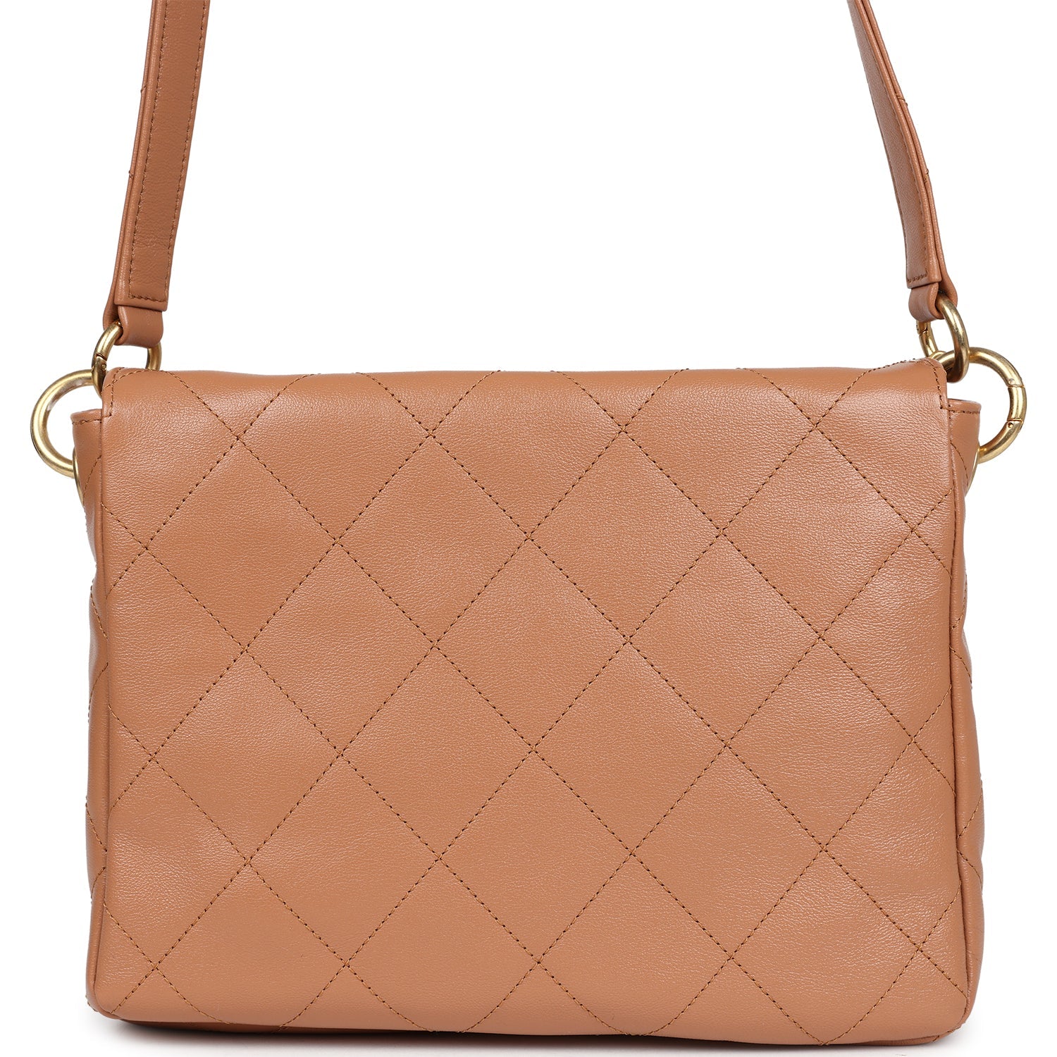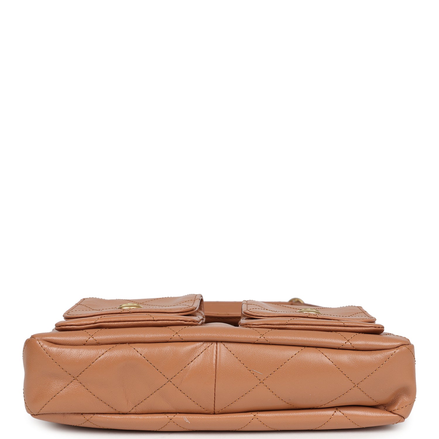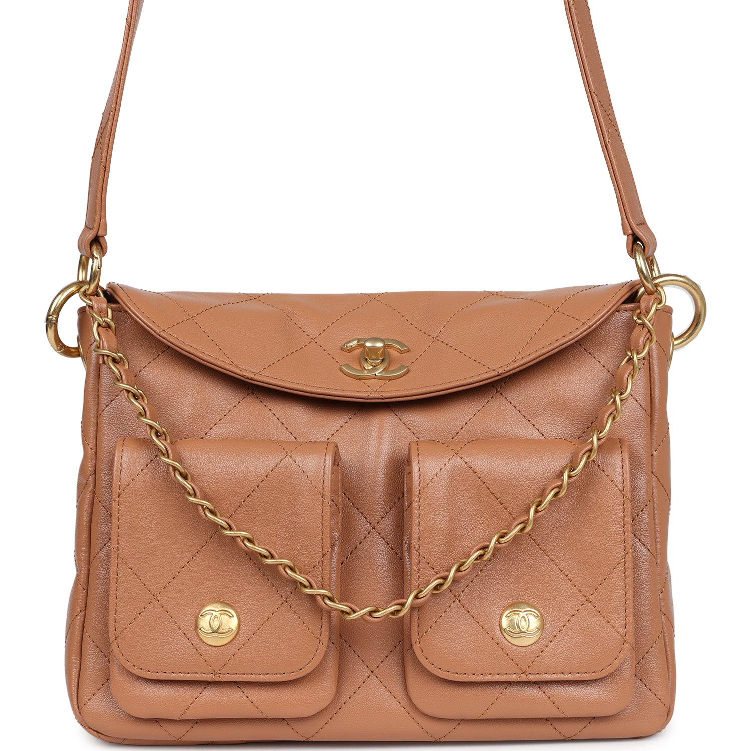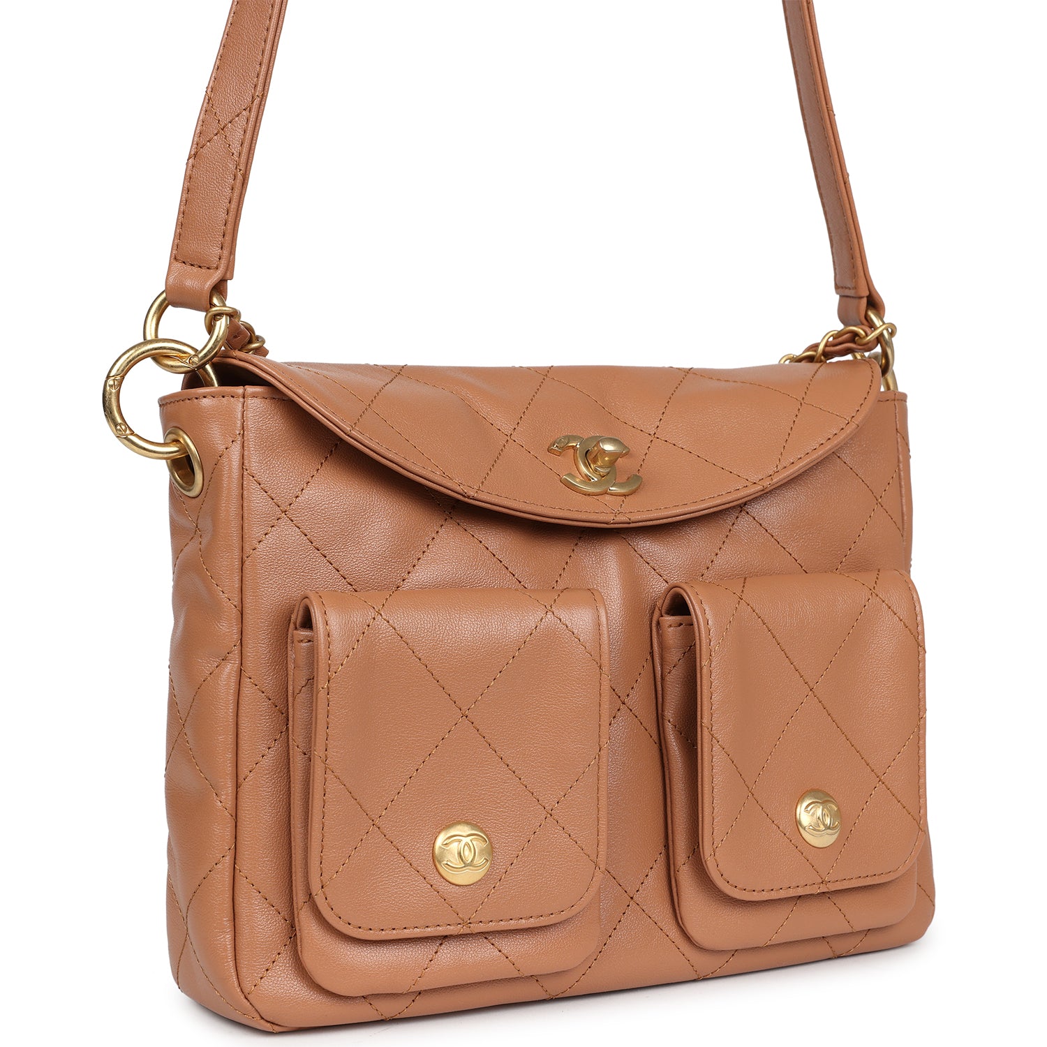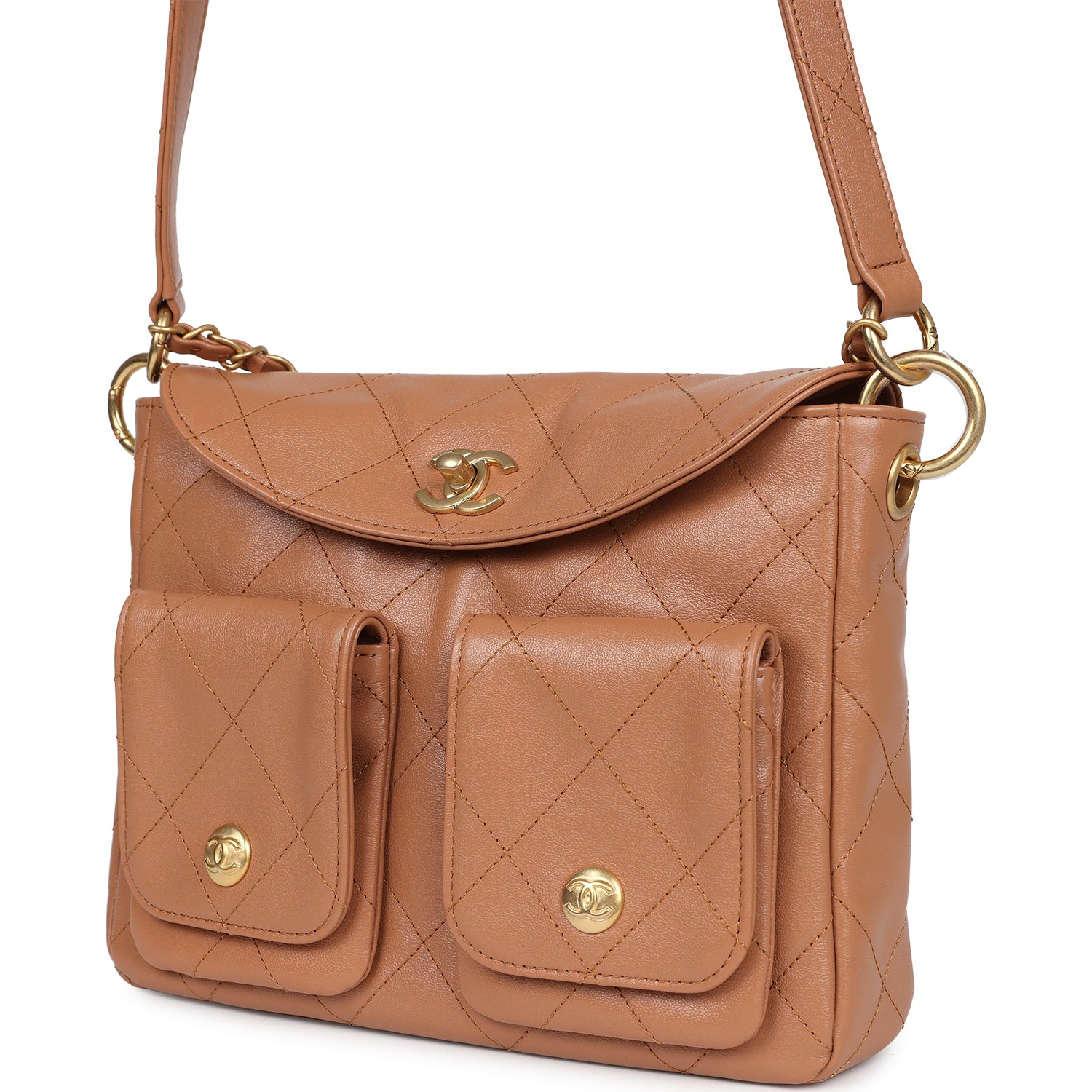 Chanel Double Pocket Hobo Bag Caramel Shiny Calfskin Brushed Gold Hardware