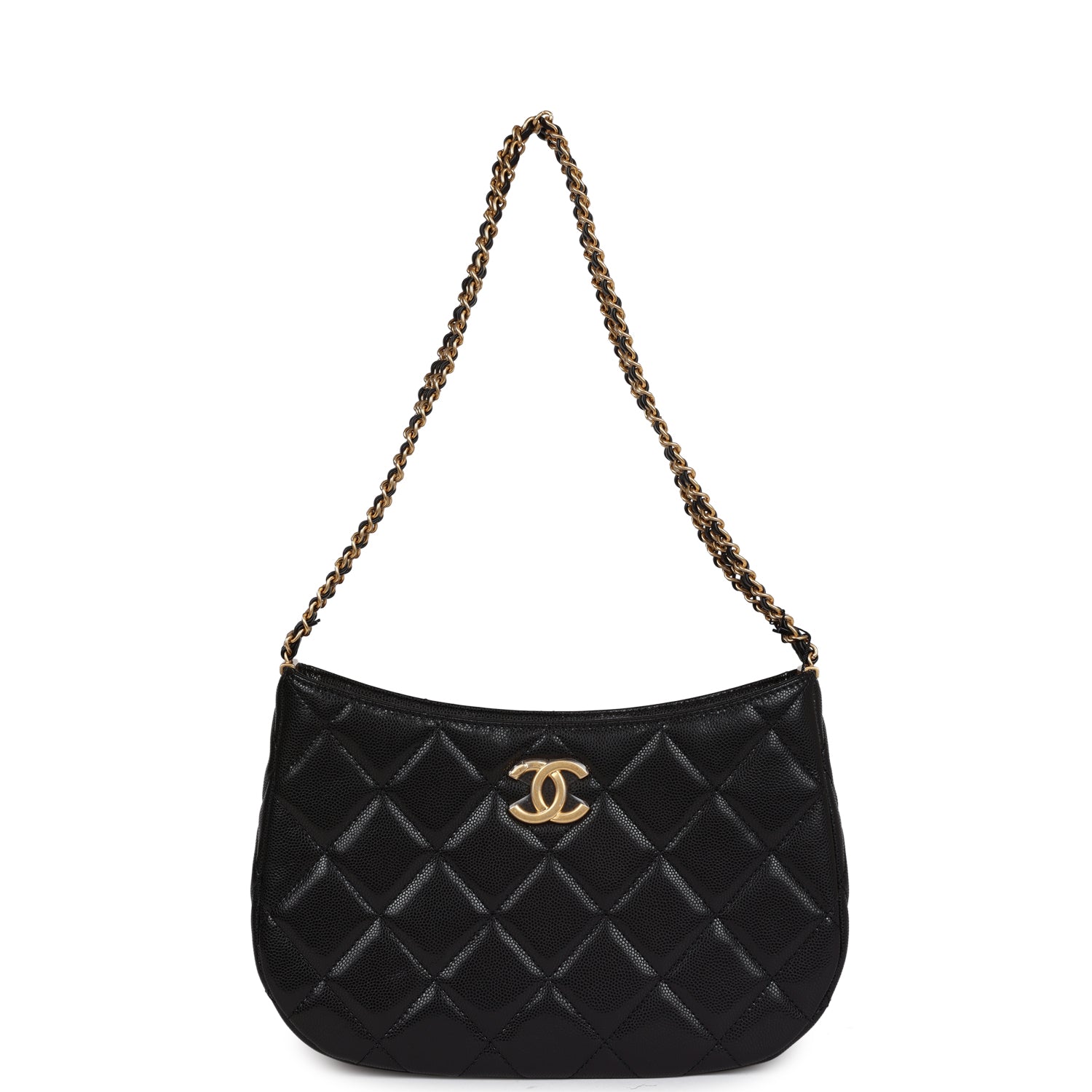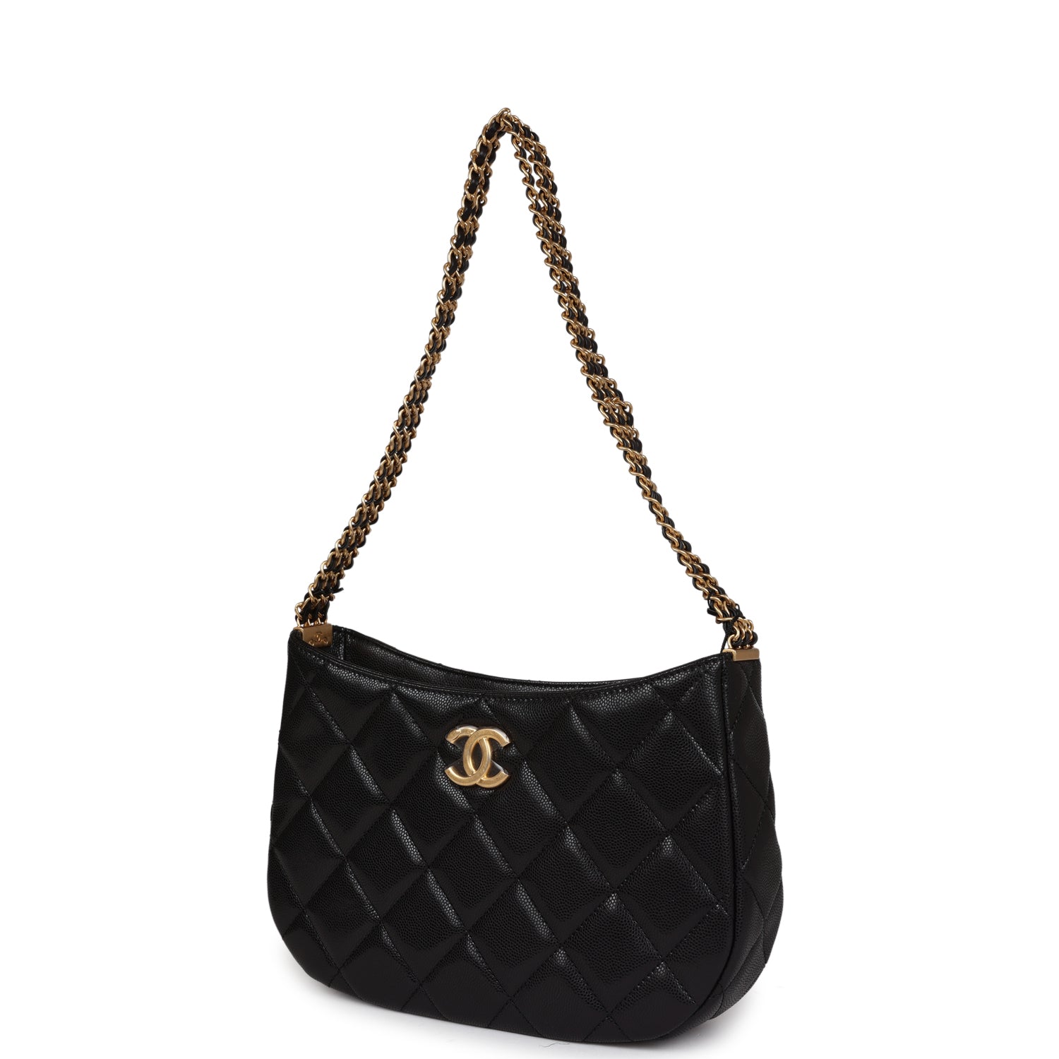 Regular price $2,260.00 Sale price $450.00 Save $1,810.00This Hobo is in black shiny caviar with brushed gold hardware and has tonal stitching, signature CC on front of bag, zip top closure and an interwoven brushed gold chain woven with black leather.